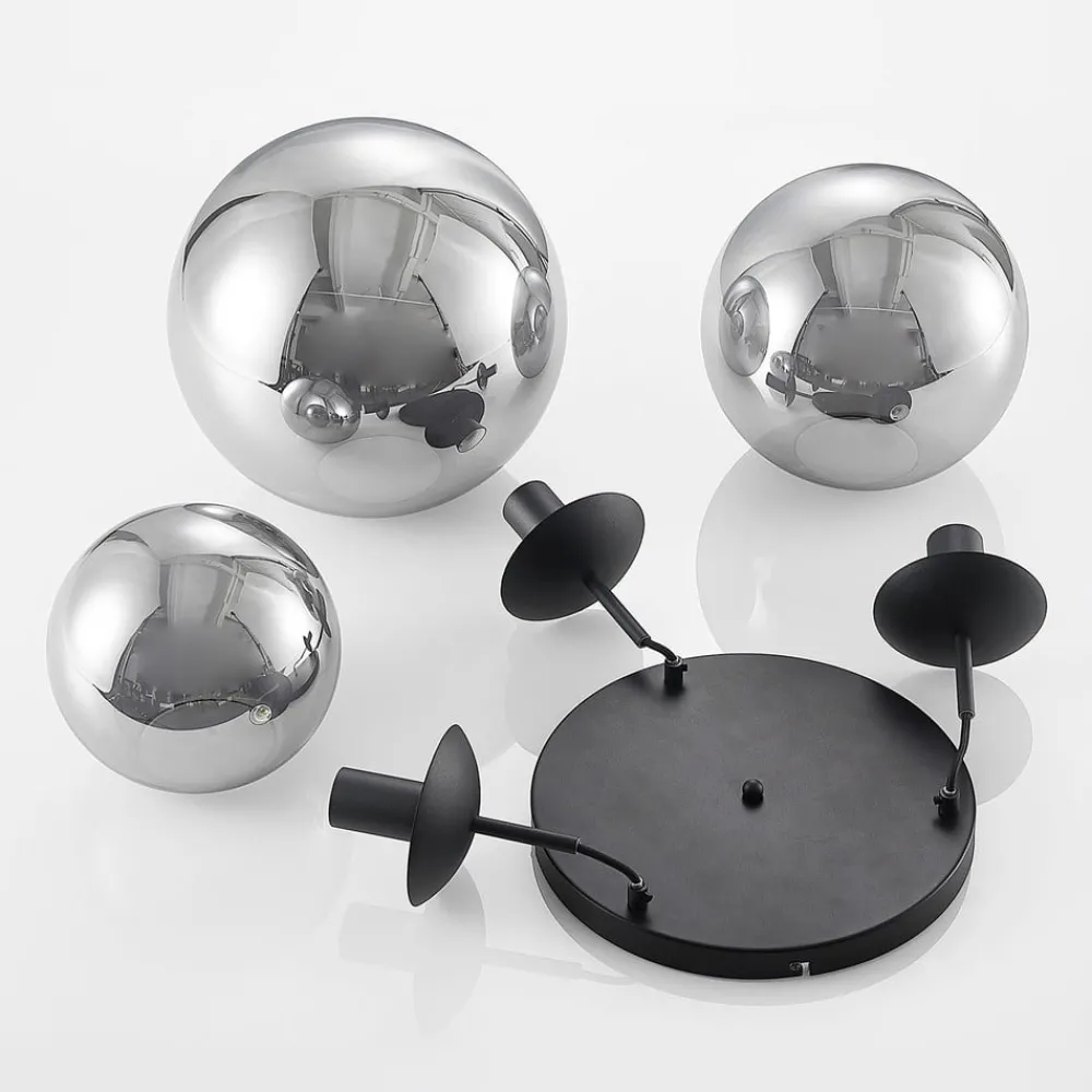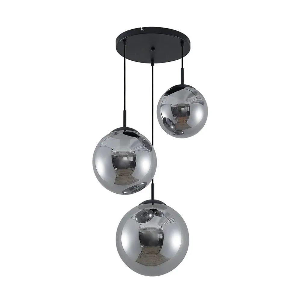 Teeja pendellampe med 3 lyskilder og glasskuler i røykgrått Teeja passer godt inn i moderne interiør, men har også en viss vintagesjarm med sine røykgrå kuler. Disse er laget av klart glass og er derfor relativt gjennomsiktige, noe som kan ses både når lyset er slått på og av. Derfor bør man bruke dekorative lamper som på en stilfull måte understreker helhetsinntrykket av hengelampen, for eksempel filamentpærer eller rustikkpærer, som er designet i stil med gamle glødepærer, men som vanligvis har effektiv LED-hengelampe. Pendellampen er en elegant lyskilde i oppholdsrommet og kan for eksempel brukes ved spisebordet eller sofabordet. Kulene henger ned fra den svarte takplaten i ulike høyder, noe som gir et spesielt dynamisk og individuelt uttrykk.