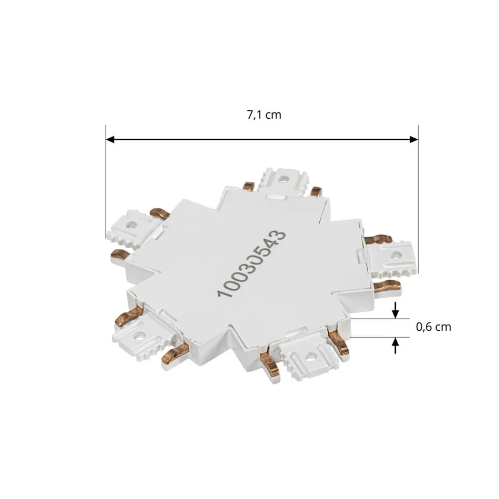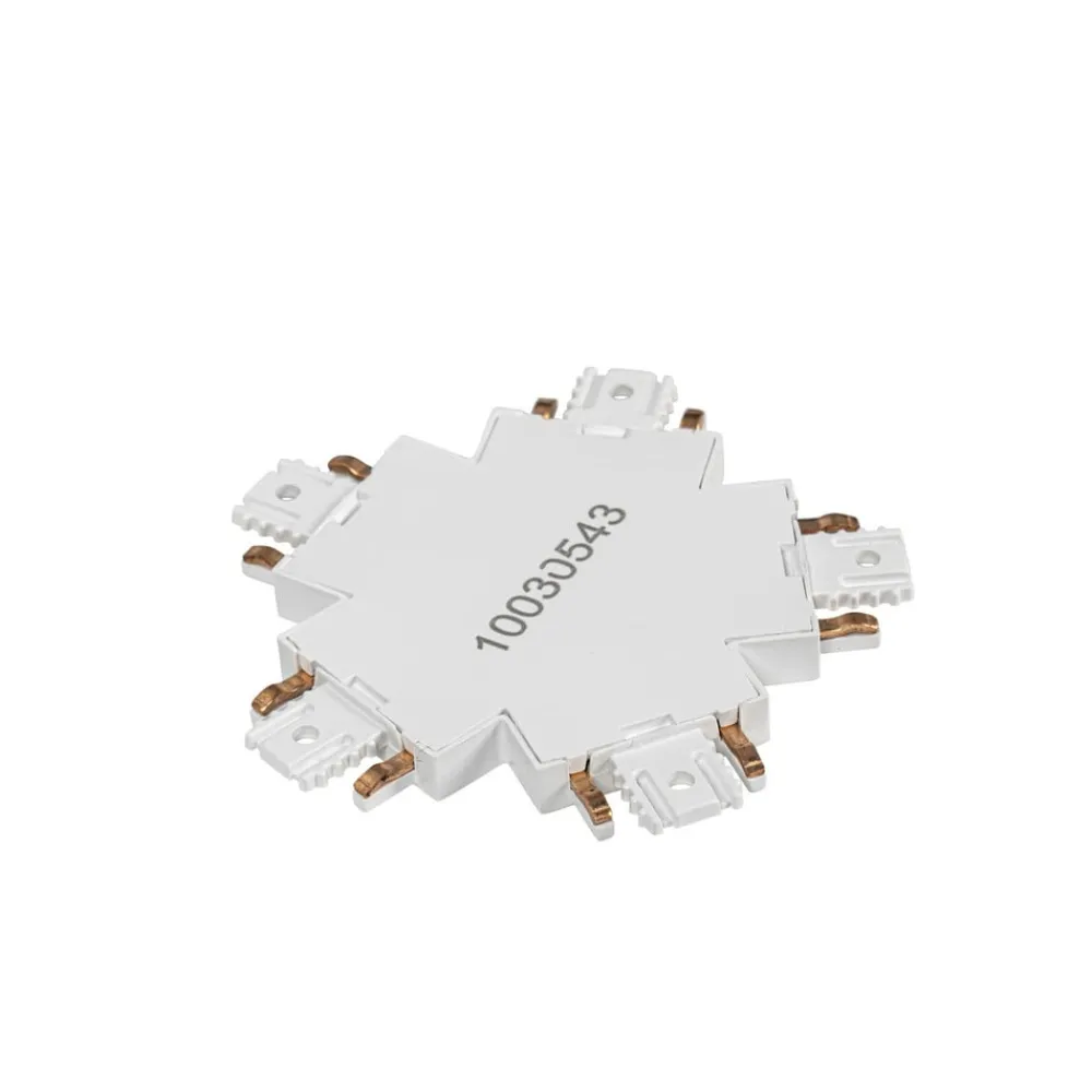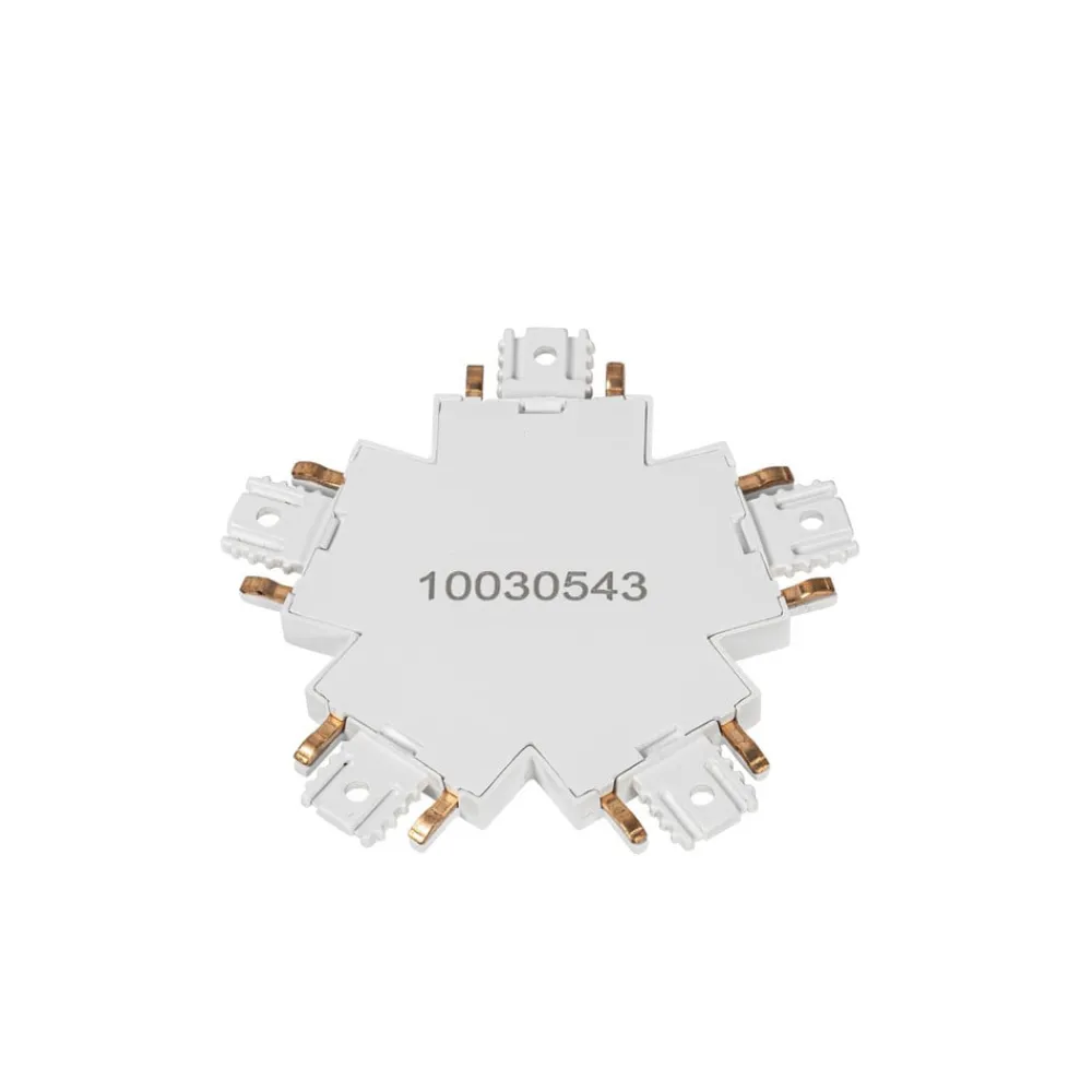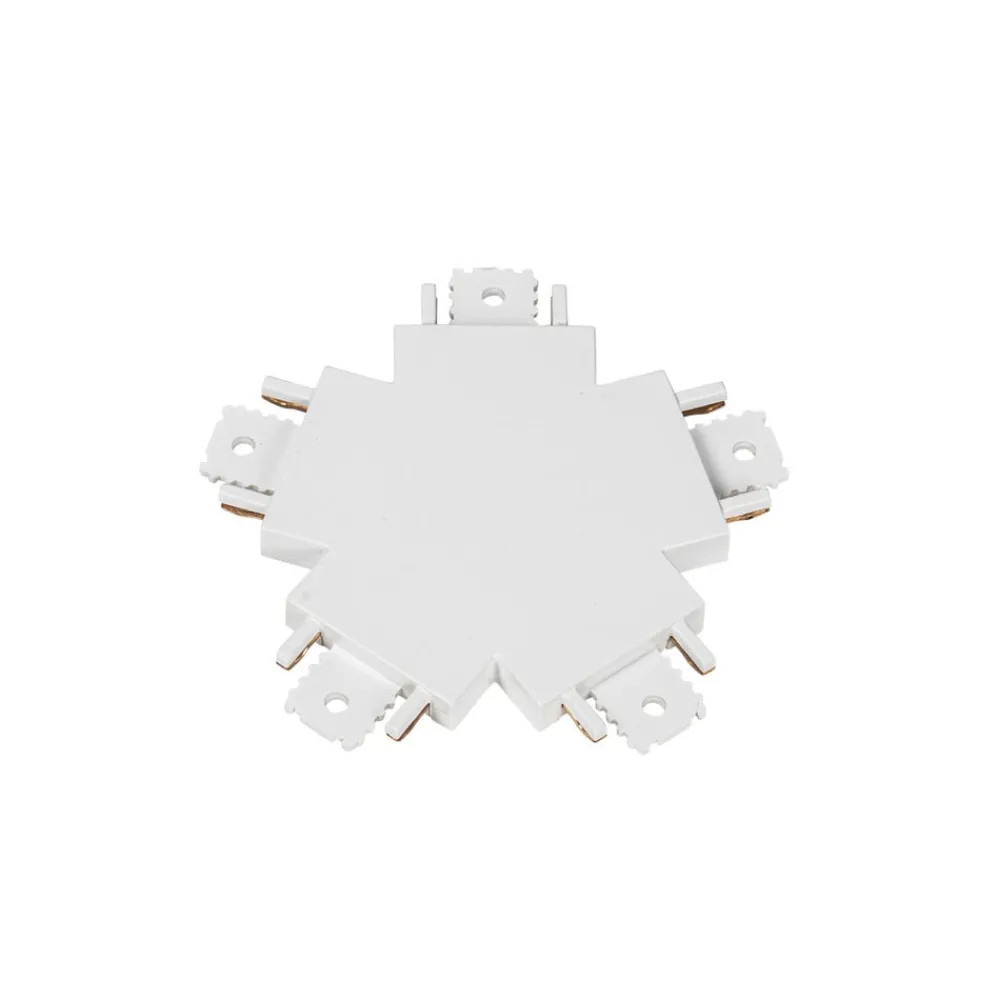 Lumaro-kontakt i hvit plast med fem tilkoblingspunkter Denne kontakten kan kombinere komponenter fra Lumaro skinnesystem. Vær oppmerksom på at Lumaro skinnesystem kun er kompatibelt med tilbehør fra Lumaro-serien. For å unngå forveksling med andre systemer, må du kun kombinere tilbehør og skinnesystemer fra serien med samme navn.