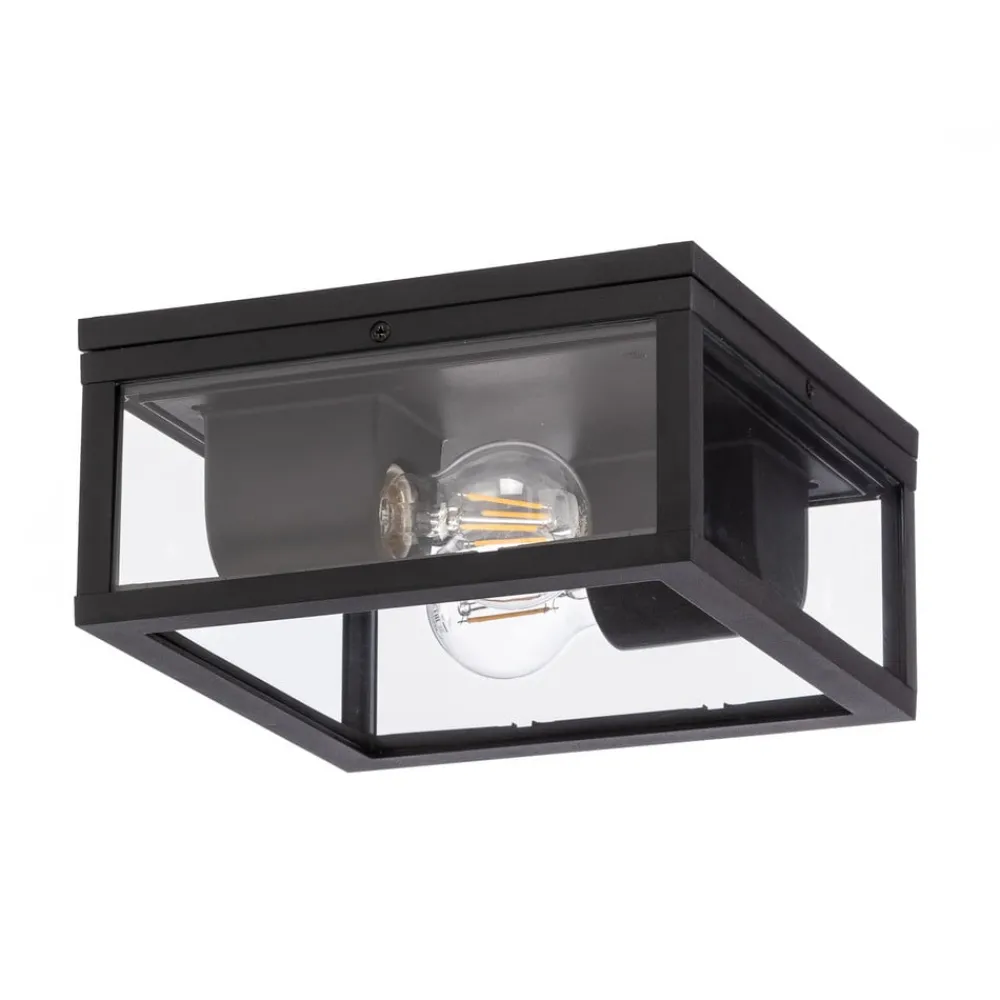Kremena vinklet utendørs taklampe i aluminium og glass Kremena taklampe er et perfekt tilskudd til utendørsmiljøet. Den er laget av aluminium og glass og har en kantet form. Innvendig er det to motstående stikkontakter som kan monteres med E27-pærer. Takket være IP44-klassifiseringen er Kremena beskyttet mot vannsprut og passer perfekt på en overbygd terrasse. Glasset gir fri sikt til lyskilden, noe som gjør at bruk av glødelamper anbefales – det spesielle utseendet gir armaturen det lille ekstra.