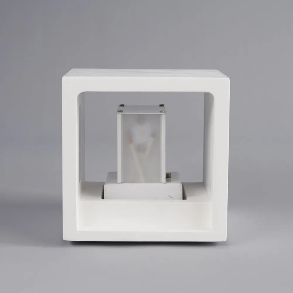 LED-vegglampe Marita i vakker gipsdesign Kubeformen passer svært godt til LED-vegglampen Marita og gjør den til en attraktiv og universell lyskilde i moderne oppholdsrom. Men Marita kommer også til sin rett i kommersielle rom, spesielt i serveringsbransjen, der den gir et varmt og innbydende lys både oppover og nedover. Hvit er en diskret farge som åpner for mange installasjonsmuligheter, men kanskje noen ønsker å bruke denne vegglampen til å uttrykke noe spesielt i stedet for det vanlige. I så fall kan den males i ønsket farge eller males med et personlig og særpreget motiv. Hansker og sandpapir til dette og til den forutgående overflatebehandlingen er inkludert i leveransen. I løpet av kort tid skapes en lampe for individualister som kan tilpasses den eksisterende atmosfæren eller fungere som en effektfull kontrast til den.