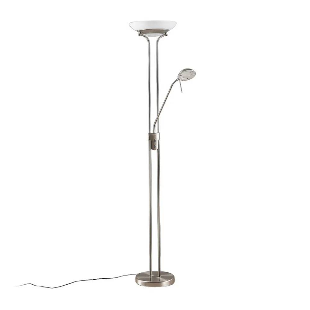 Attraktiv Yveta LED-uplight med ekstra leselampe og dimmer for begge lyskilder Yveta LED-uplight imponerer med et vakkert utseende som fremstår som relativt tidløst. LED-uplighten er ideell som ekstra belysning i oppholdsrommet fordi den ikke bare består av én lyskilde, men to som utfyller hverandre perfekt. For det første er det lyskoppen, som er laget av hvitt satinert glass med alabastmønster, og for det andre har Yveta en integrert leselampe som strekker seg ut fra rammen på LED-uplighten i form av en ekstra arm. Denne armen er plassert omtrent midt på rammen og er ikke fastmontert, men kan beveges etter behov, ettersom et lite, trinnløst fleksibelt ledd er festet både under det lille lampehodet og direkte på rammen. Navnet leselampe indikerer allerede at denne lyskilden er ideell til lesing eller til generelle aktiviteter som krever et sentrert, målrettet lys som avlaster øynene så mye som mulig. Selve uplighten gir derimot et mykt, mye mer diffust lys som bare kommer indirekte inn i rommet og derfor skaper en spesiell hygge og en veldig hjemmekoselig karakter. For å perfeksjonere lysbildet og tilpasse det optimalt til dine egne behov, er Yveta utstyrt med to dimmere, som er plassert i midten av rammens høyde og derfor er lette å nå. For å endre lysstyrken på den ene eller den andre lyskilden trenger du bare å vri på de diskrete knottene for å gjøre den lysere eller mørkere. Det faktum at både uplighteren og LED-leselampen lyser med LED, gjør at man oppnår god energieffektivitet, noe som lover sterkt lys og lavt strømforbruk.