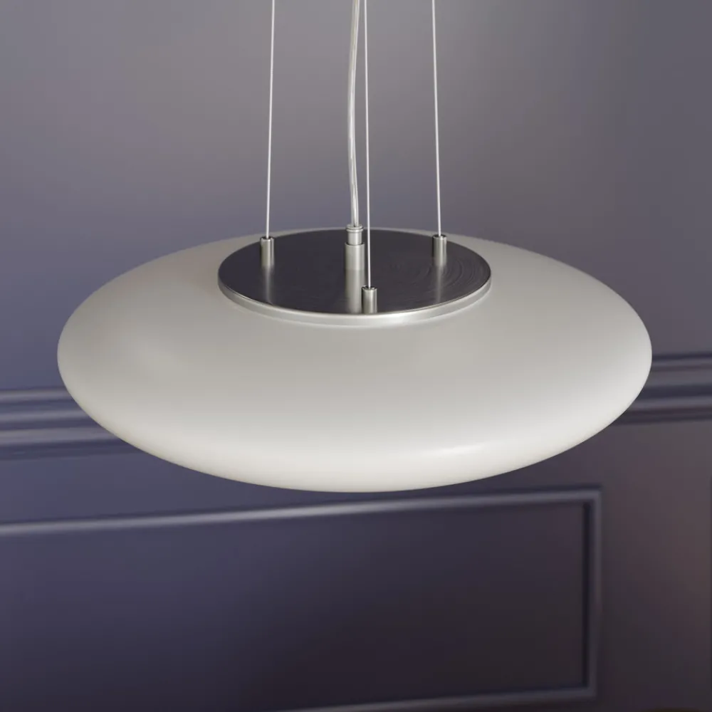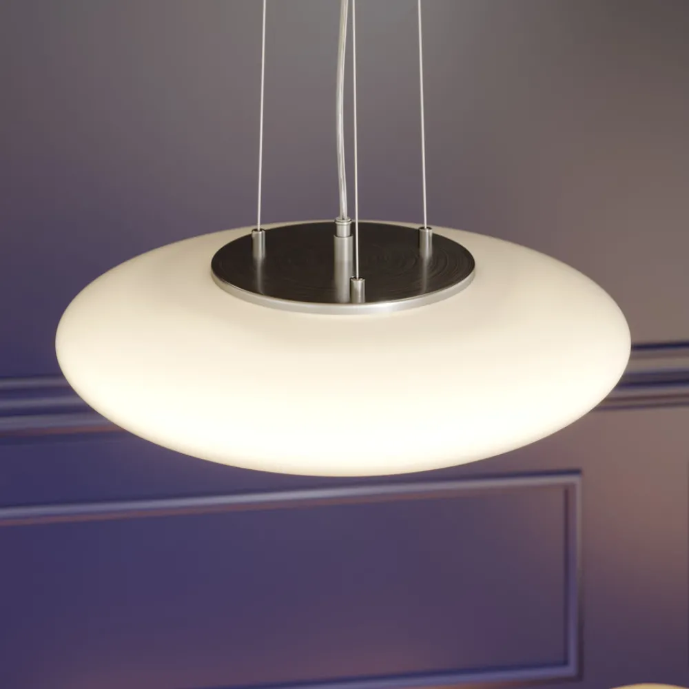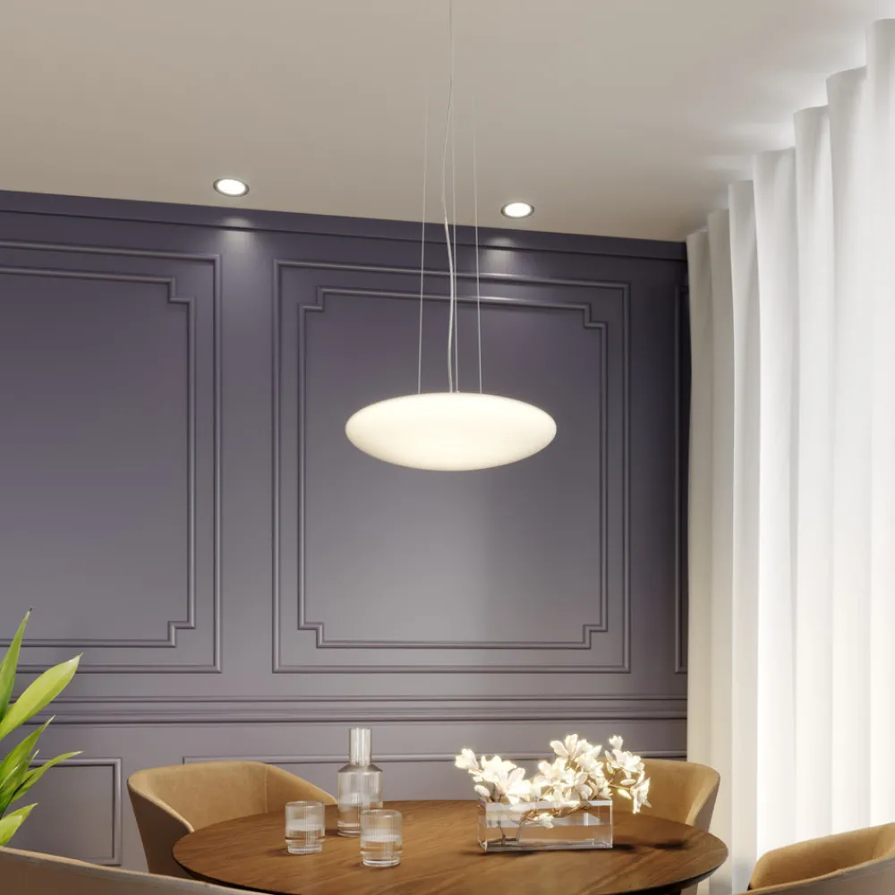 Gunda passer med sin tidløse glasskjerme i hvitt i mange rom og stiler og er en pendellampe med en veldig harmonisk utstråling. Takket være den hvite glassoverflaten kommer lyset mykt og jevnt ut og sørger for en behagelig atmosfære. Den LED-drevne hengelampen er spesielt vakker over et spisebord, hvor lampen fremstår som en estetisk nyfortolkning av den klassiske, runde kjøkkenlampen.