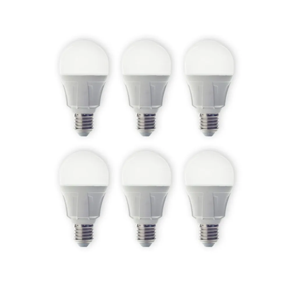E27 8,5 W LED-pære i glødepæreform, matt, varmhvit – i praktisk sett med 6 stk. Formen, som er tilpasset en vanlig glødepære, og en varmhvit lysfarge på 3000 K gjør denne LED-lyskilden spesielt egnet for bruk i boliger og på kontorer og erstatter en vanlig glødepære på opptil 60 W. Lyskilden imponerer med sin høye effektivitet kombinert med svært lavt energiforbruk og en svært lang levetid på opptil 30 000 timer.