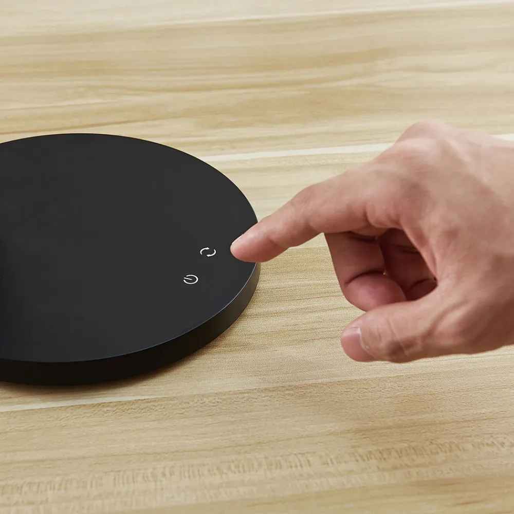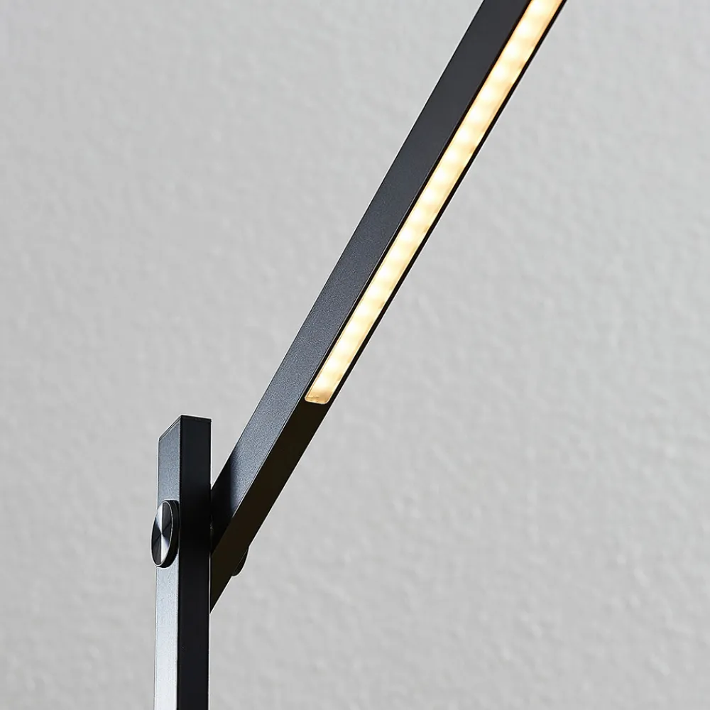 Slank, lineær LED-skrivebordslampe Loretta med berøringsfunksjon for endring av lysstyrke og lysfarge Denne LED-skrivebordslampen er preget av et puristisk formspråk og har to svært lineære elementer som kobles til en rund base. Alt er holdt i svart, slik at det minimalistiske uttrykket også er ivaretatt fargemessig. Lampens øvre del, dvs. skjermen, er, selv om den langt fra ligner et klassisk eksempel i sitt slag, forbundet med den nedre delen med et ledd og kan svinges 180° opp og ned, slik at lyset kan rettes optimalt. Det er ikke umiddelbart åpenbart, men den visuelt enkle bordlampen imponerer også når det gjelder teknologi, ettersom den er utstyrt med en touchfunksjon som kan brukes til å justere lysfargen i tre trinn og også regulere lysstyrken i tre trinn. En minnefunksjon gjør betjeningen enklere ved at de valgte verdiene beholdes neste gang lampen slås på, forutsatt at støpselet ikke har blitt trukket ut i mellomtiden.