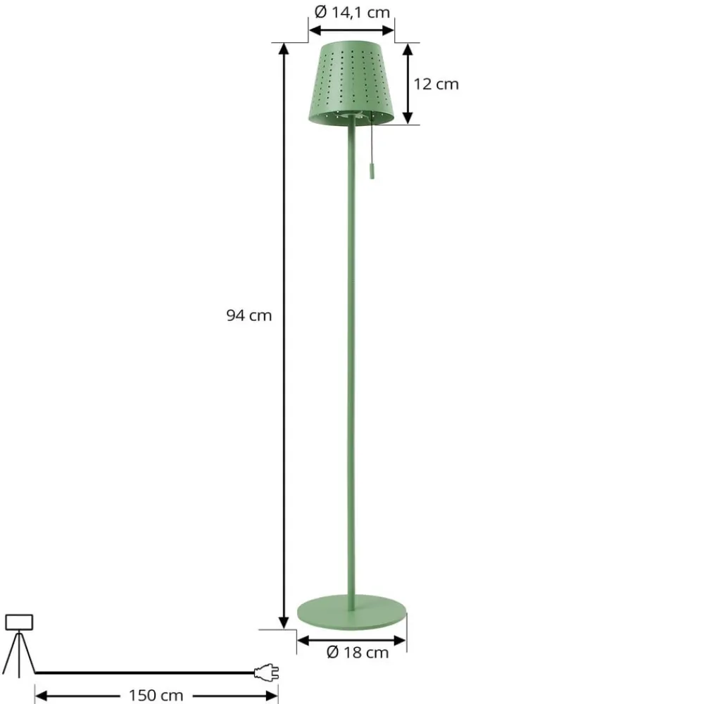 Moderne Hilario LED-gulvlampe for utendørs bruk, solcelledrevet Hilario LED-solcelledrevet gulvlampe i salviegrønn kombinerer stilig belysning med funksjonell innovasjon. Gulvlampen er spesialdesignet for utendørs bruk og forvandler balkonger og terrasser til en stemningsfull oase. Takket være den integrerte LED-lyskilden og den solcelledrevne batteriteknologien er Hilario en energibesparende og fremfor alt fleksibel belysningsløsning. Den integrerte dimmefunksjonen gjør det mulig å justere lysintensiteten i tre trinn etter behov, slik at man kan skape den rette stemningen i enhver situasjon. Hilario-gulvlampen skaper en innbydende atmosfære med sitt behagelige lys, som først og fremst genereres av den perforerte lampeskjermen. Armaturens robuste design sikrer lang levetid, og den salviegrønne fargen smelter harmonisk inn i de naturlige omgivelsene. Trekkbryteren gjør det enkelt å betjene lampen – monokrystallinsk solcellepanel i silikon – inkl. 18650 Li-Ion-batteri, 3,7 V, 2 200 mA – lysvarighet 6 timer, ladetid 6 timer