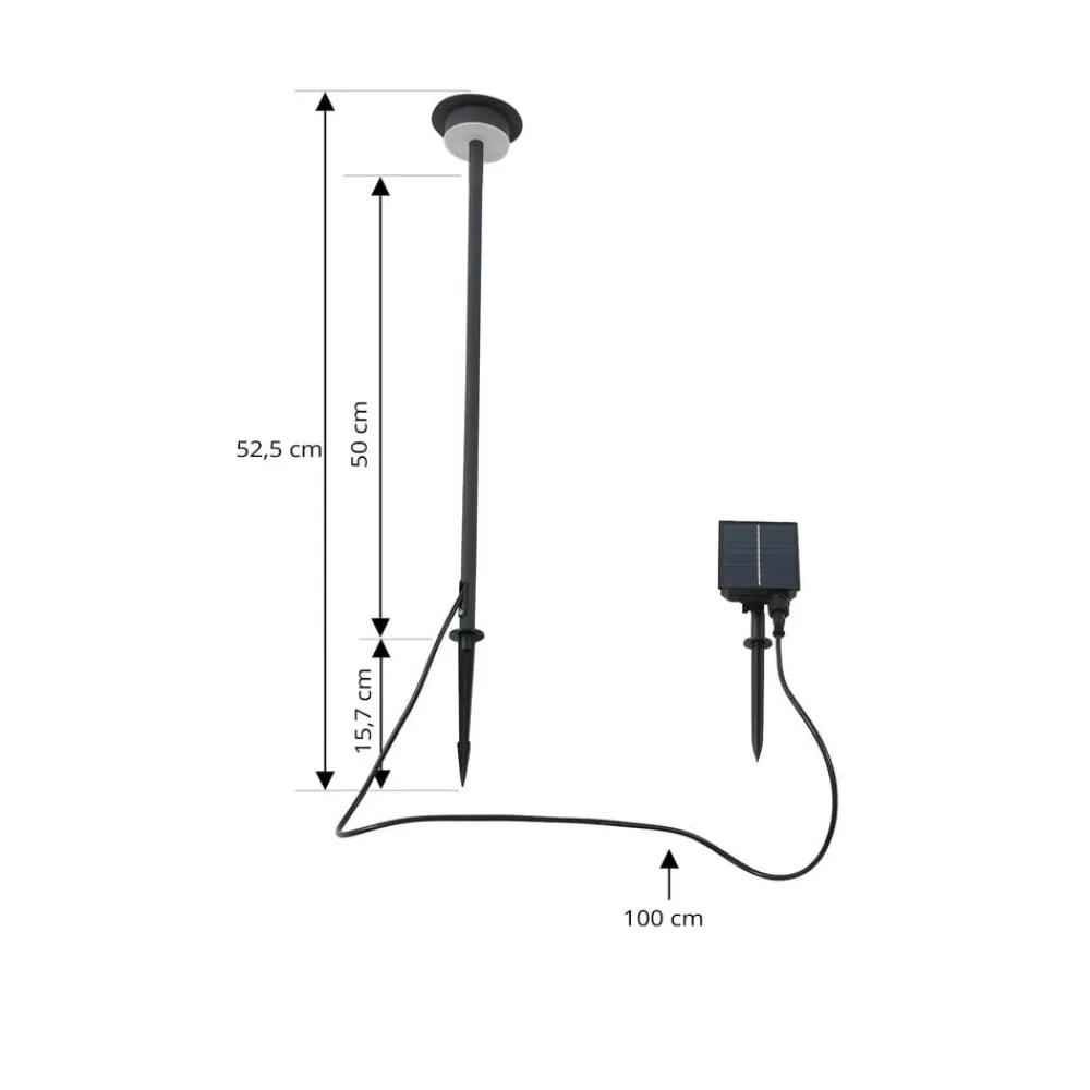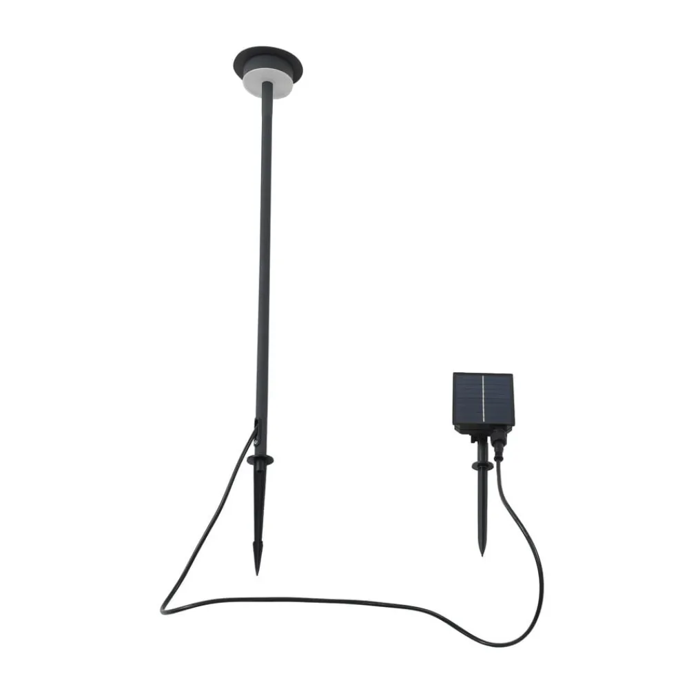 Lyris LED-solcellelampe i aluminium med varmhvit lysfarge Lyris LED-solcellelampe er en moderne og energieffektiv belysningsløsning for hjemmet. Med en varmhvit fargetemperatur på 3000K skaper den en koselig atmosfære utendørs. Den integrerte LED-lyskilden sikrer lang levetid og er spesielt energieffektiv. IP65-beskyttelsesgraden og det medfølgende solcellepanelet gjør også lampen egnet for utendørs bruk. Tekniske data – inkl. USB-C-kabel – inkl. 2 x jordspyd – inkl. solcellepanel 24V / 100mA – inkl. 3,7Vdc Li-ion-batteri / 1200mAh – batterilevetid 9 timer – ulike lysmodi justerbare