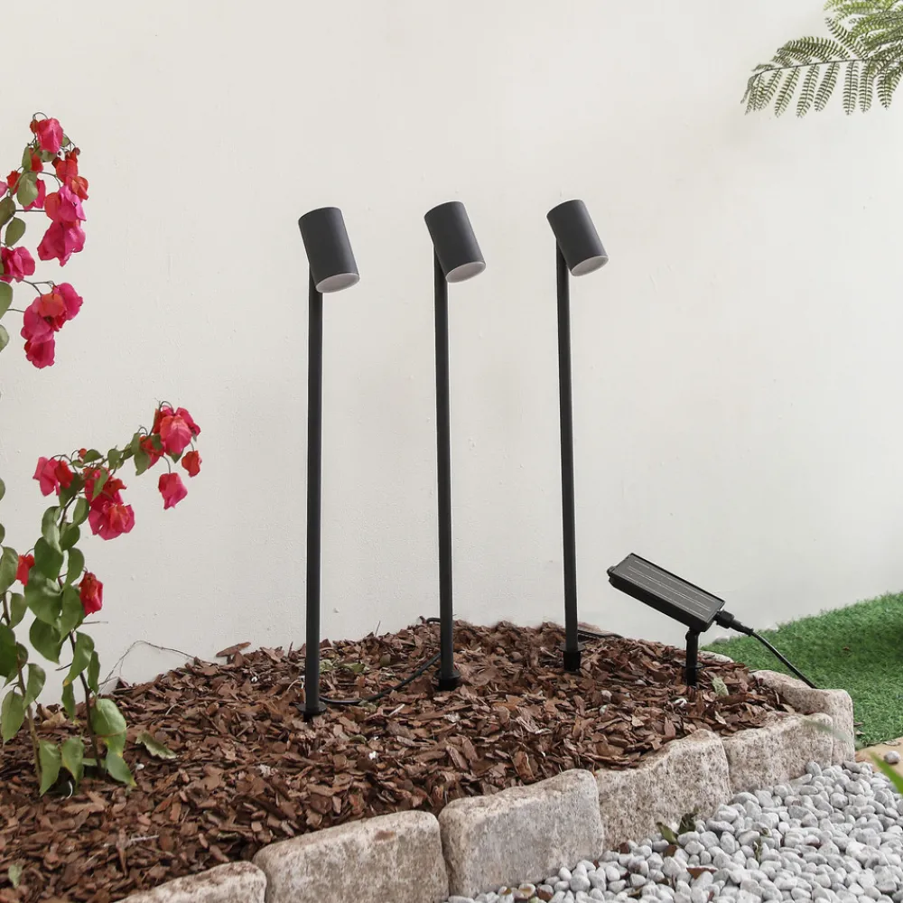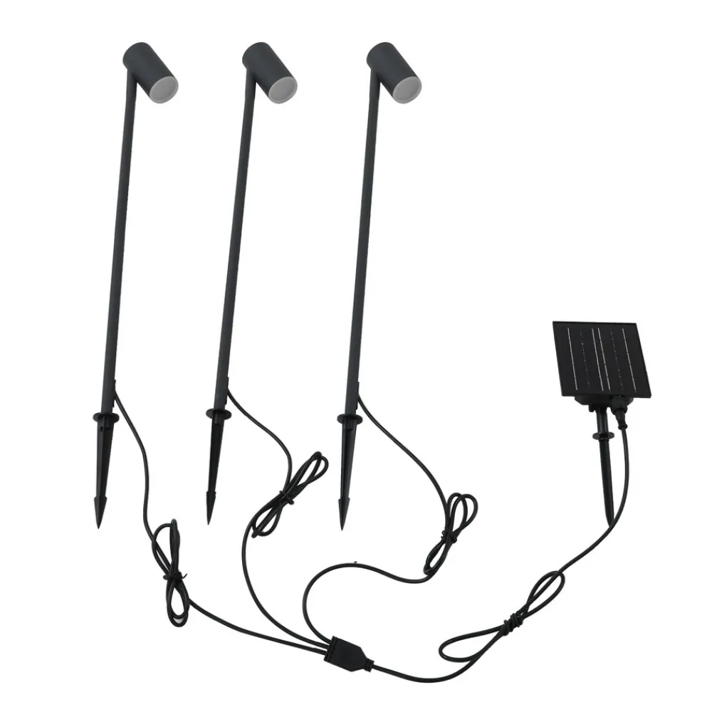 Myric LED-solcellelampe med jordspyd i praktisk sett med 3 stk. Med LED-solcellelampen kan du nyte en unik lysopplevelse! Den moderne designen har en integrert LED-lyskilde som avgir energibesparende lys med en behagelig fargetemperatur på 3000 K. Takket være kapslingsgraden IP65 er lampen også egnet for utendørs bruk. Myric drives av et solcellepanel. Tekniske data – inkl. USB-C-kabel – inkl. 4 x jordspyd – inkl. solcellepanel 24V / 100mA – inkl. 3,7Vdc Li-ion-batteri / 1200mAh – batterilevetid 9 timer – ulike lysmodi justerbare