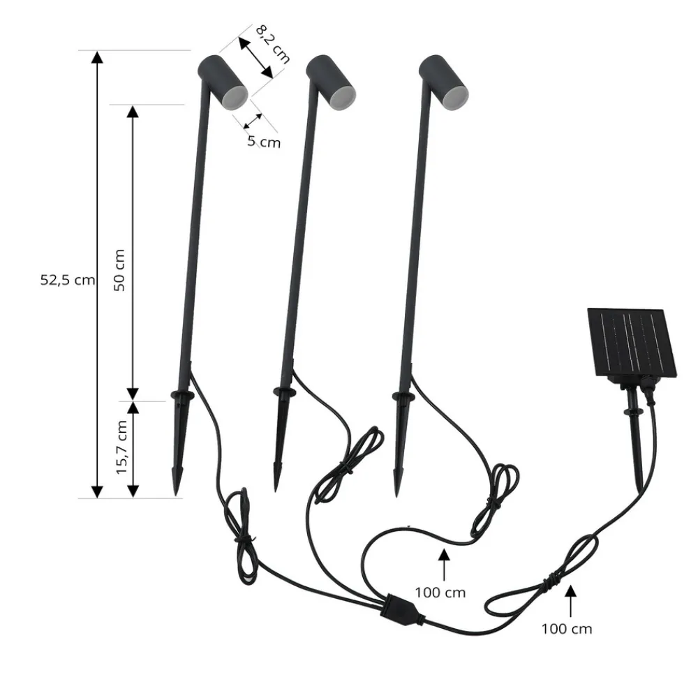 - Kabellengde 100 cm; høyde på jordspyd 15,7 cm; høyde på skygge 8,2 cm