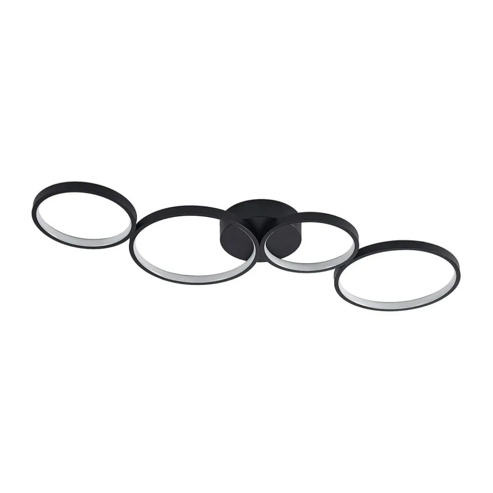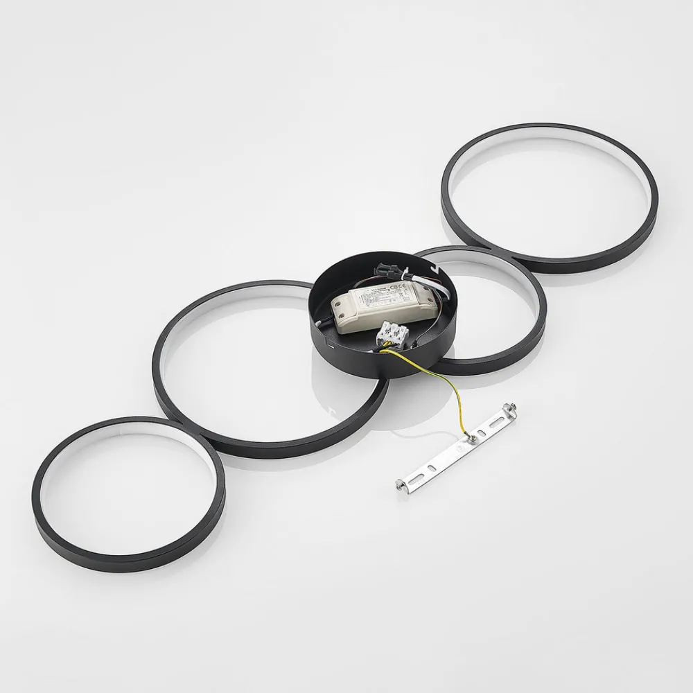 LED-taklampen Evengeline overbeviser med sitt friske og varierte utseende. Lampekroppen er laget av aluminium og lakkert i svart. Fire lyskretser er montert horisontalt forskjøvet på takfestet, slik at det oppstår en interessant form. Inne i sirklene er det fastmonterte LED-er som gjennom den runde formen skaper et interessant lys som reflekteres i sirkulære mønstre på taket. LED-taklampen Evengeline kombinerer pålitelig belysning og spennende design. De varmhvite LED-lampene gir det rette lyset til stuen eller soverommet, mens den spennende formen setter lekne aksenter på taket. Takket være den diskrete fargen og den slanke lampekroppen kan den enkelt integreres i moderne interiørstiler.