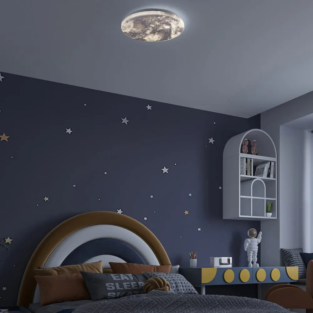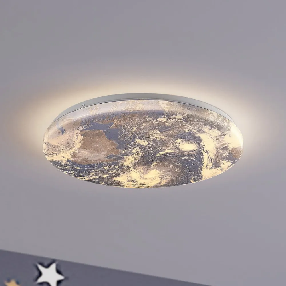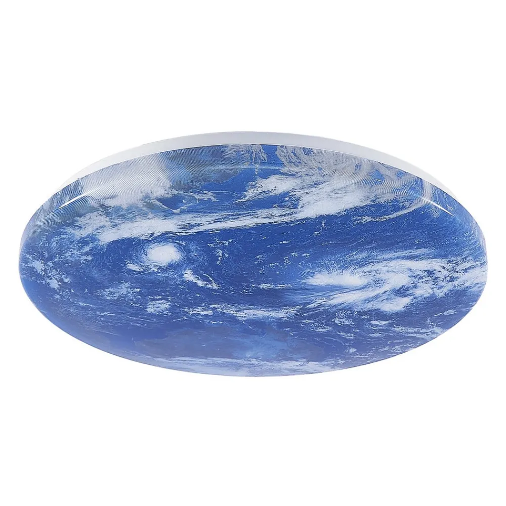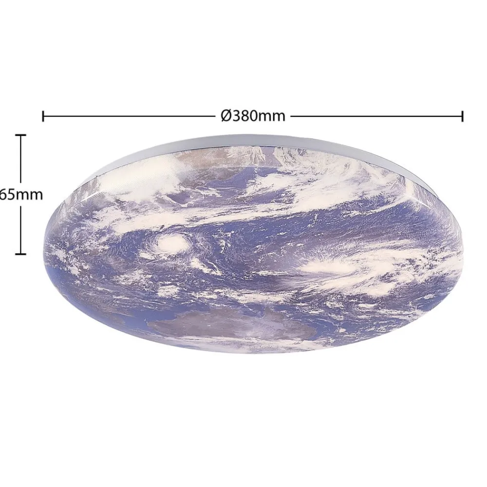 Spesiell Gaios LED-taklampe med trinnløs dimbar og CCT-funksjon Gaios LED-taklampe imponerer med sitt interessante utseende, da den runde og flate lampeskjermen er trykt med et bilde av vår vakre planet jorden. Dette individuelle utseendet er et umiddelbart blikkfang i taket, noe som gjør armaturen til en fryd for øyet selv når den er slått av. Den scorer også poeng med sine tekniske funksjoner, ettersom den medfølgende fjernkontrollen kan brukes til å styre både lysstyrken og lysfargen på armaturen. Taklampen har også integrert nattlys og minnefunksjon, noe som viser seg å være svært praktisk i hverdagen.