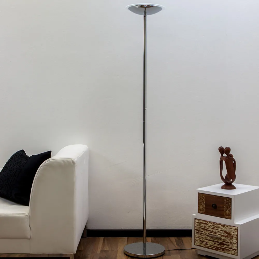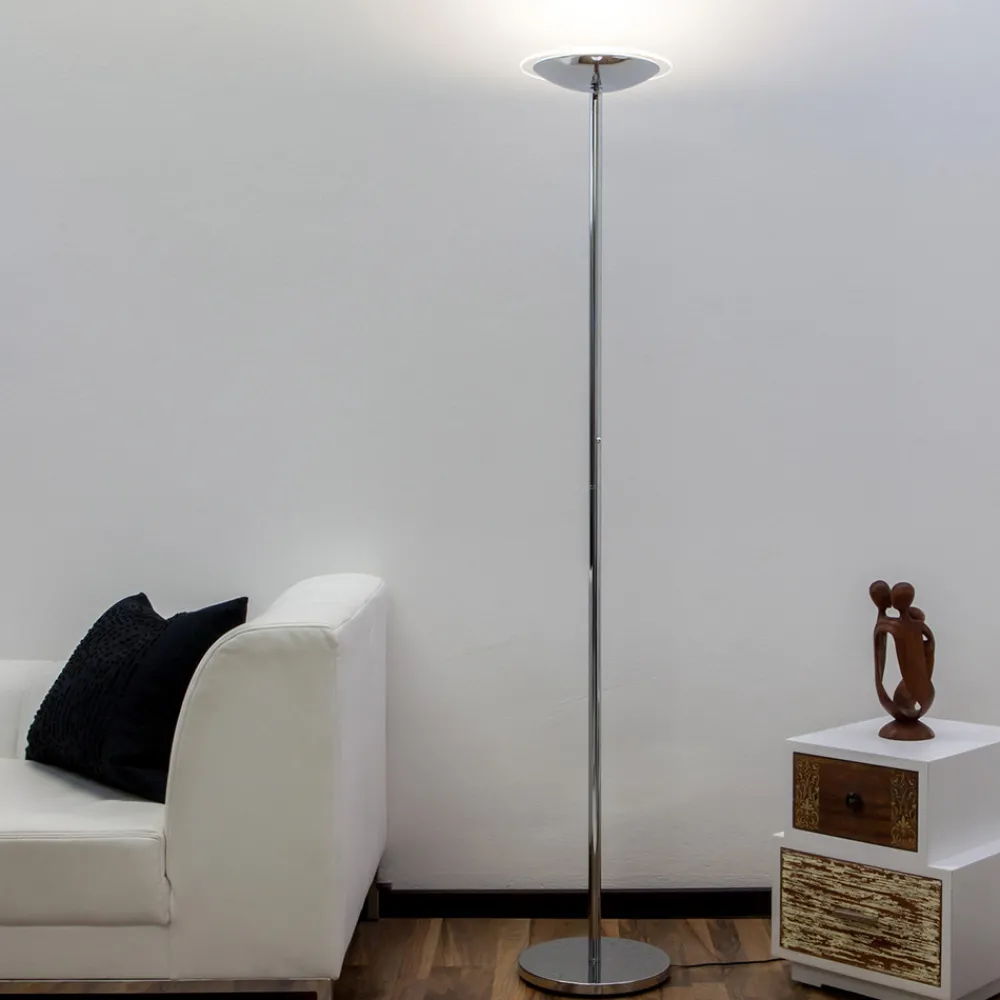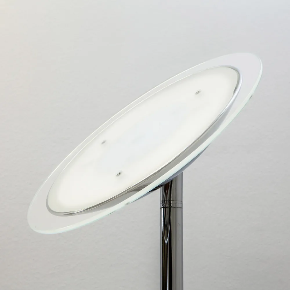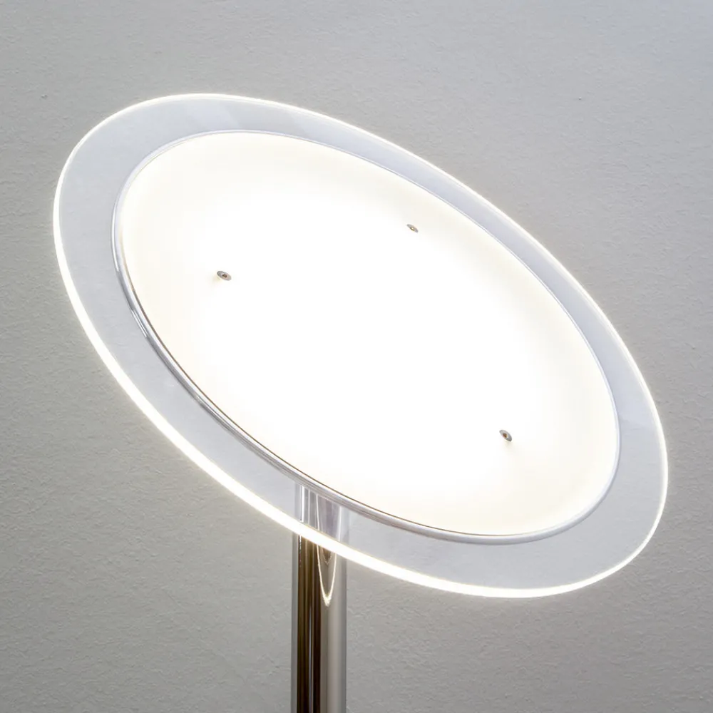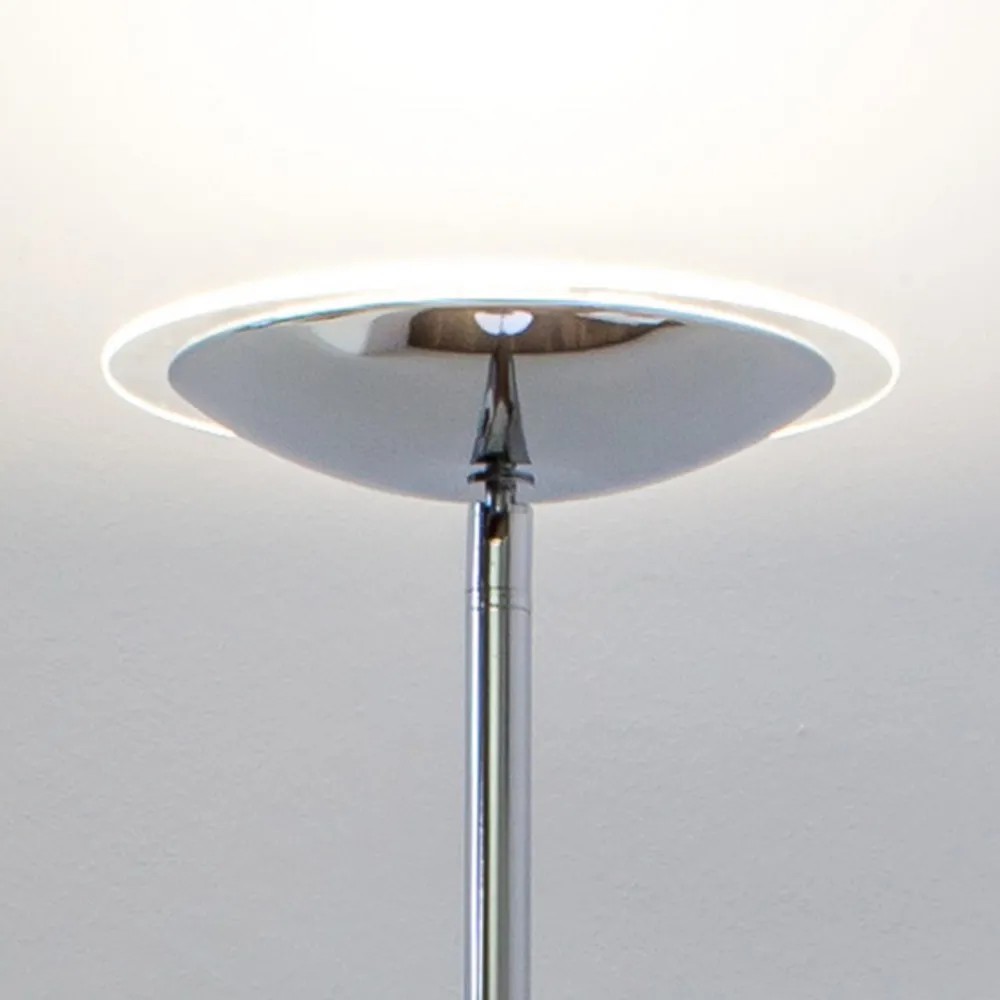 Malea LED-uplight i skinnende krom, dimbar Den elegante kromoverflaten fremhever utseendet til denne LED-uplighten og passer perfekt inn i moderne oppholdsrom. Lyset sendes utelukkende oppover, slik at det varmhvite lyset skånsomt oversvømmer området over den skålformede skjermen. Denne effekten kan gi en høy grad av hygge, noe som er grunnen til at uplights er så populære. Malea har en svært enkel design, og det er ikke brukt overflødige detaljer i produksjonen, slik at LED-uplighten smelter vakkert inn i den eksisterende stilen. Lampehodet har et ledd som gjør at det kan vippes opp til 45°. Den integrerte dimmeren – plassert i midten av den slanke rammen – har en minnefunksjon som gjør at den sist valgte lysstyrken beholdes neste gang LED-uplighten slås på. Den fungerer også som bryter. Et kort trykk brukes kun til å slå den av og på, mens et lengre trykk gjør det mulig å endre lysstyrken etter behov.