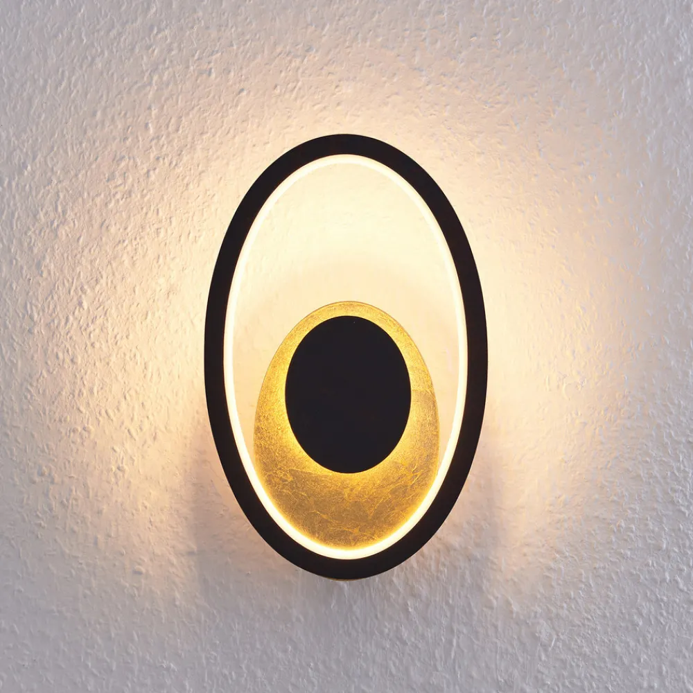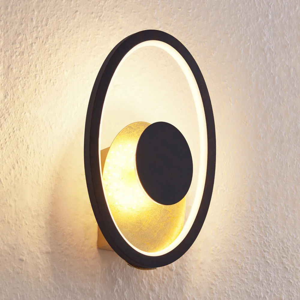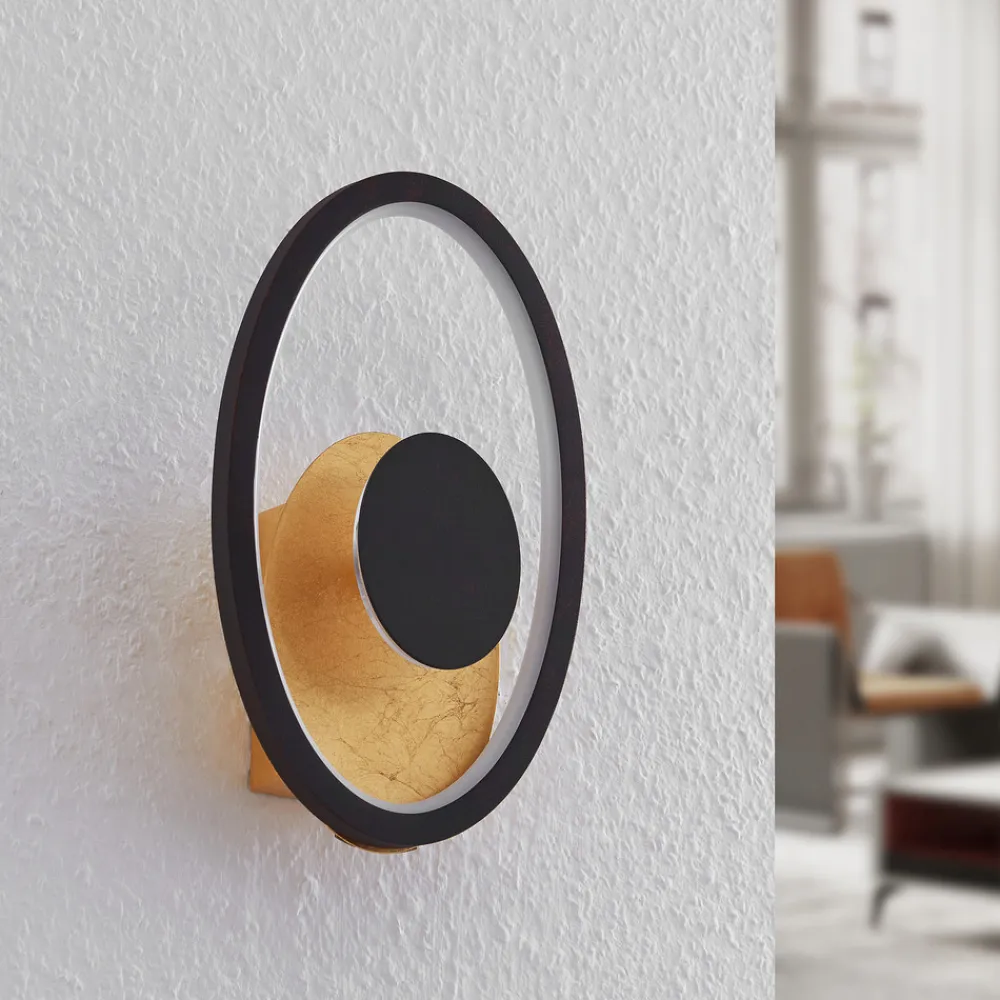 Feival LED-vegglampe skaper begeistring takket være det gylne dekselet Feival LED-vegglampen består av en gylden plate omgitt av en smal, oval, rustfarget ring. Inne i lampen er det et annet svart element. Dette skjuler en del av de kraftige LED-lampene. Disse avgir et varmt lys og spotlighter den gylne overflaten. Den gylne overflaten gir lampen et ekstra varmt preg. Dette skaper en behagelig og koselig atmosfære som er perfekt for en myk belysning i oppholdsrommet.