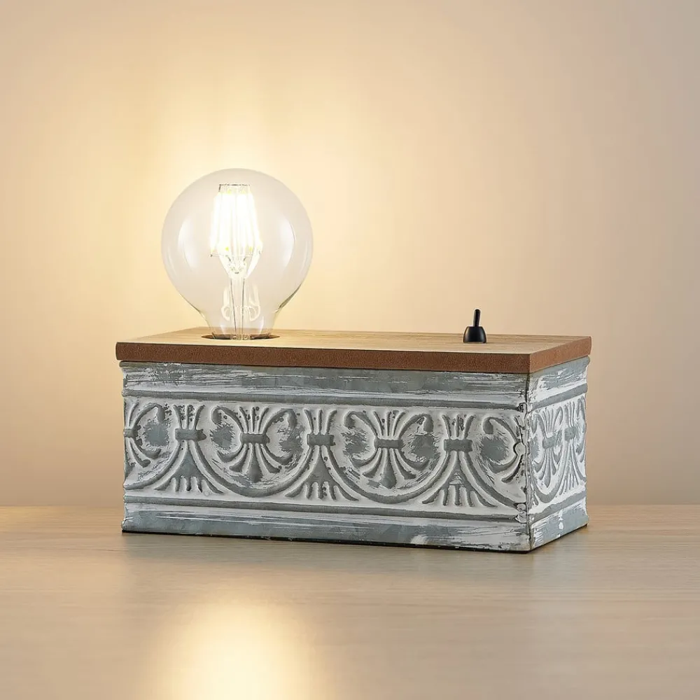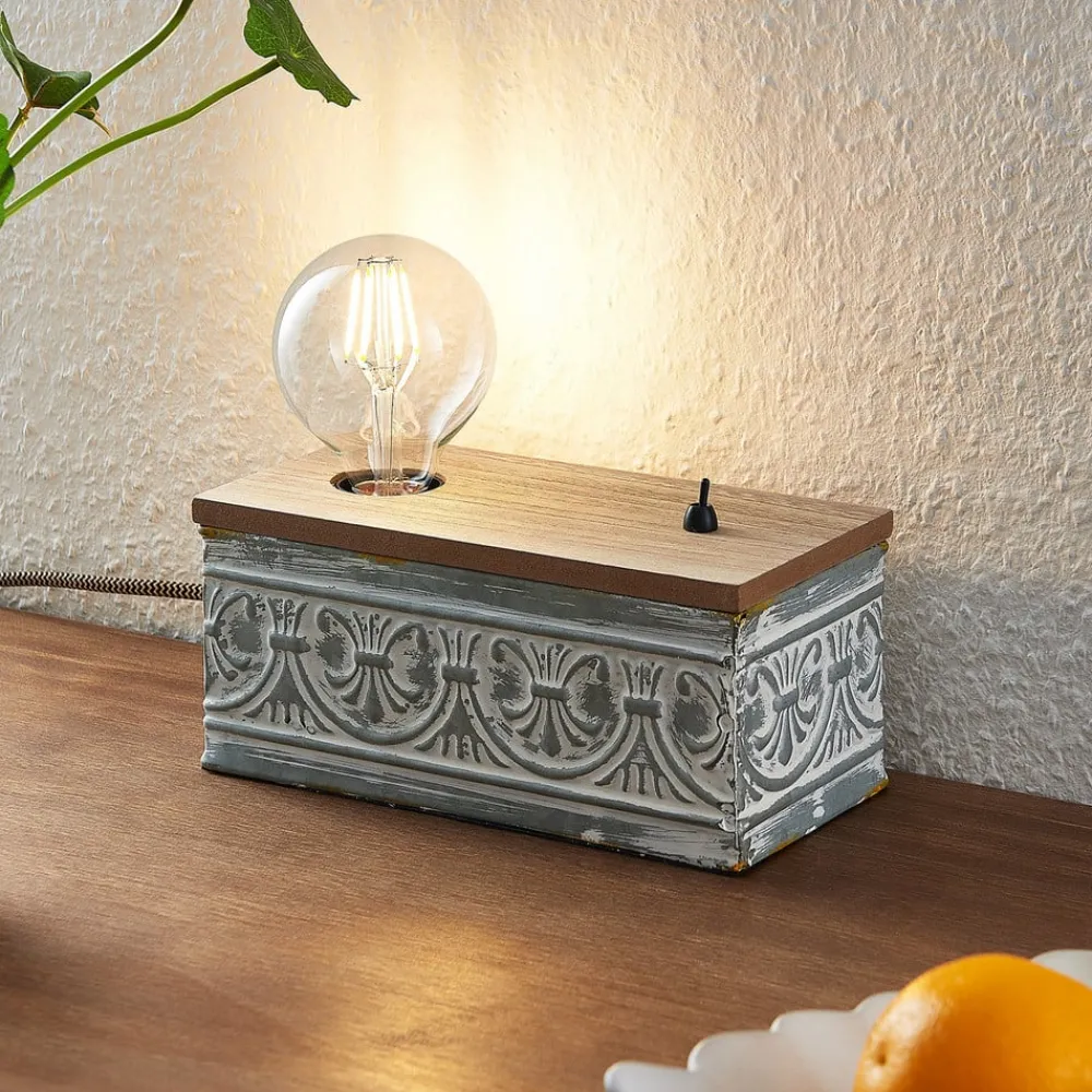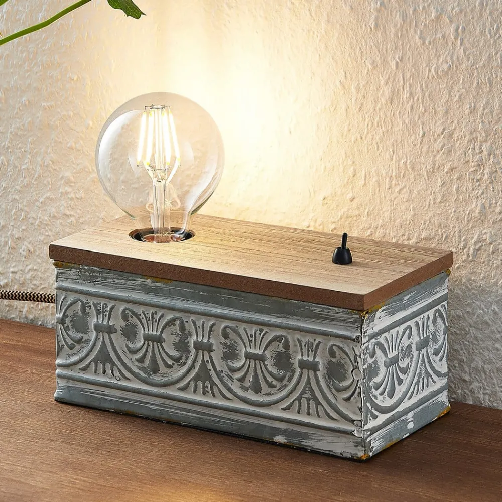 Mella passer perfekt til vintage-stiler og er en ekstraordinær bordlampe som står som en kompakt bjelke på bordet og er dekorert med vintage-ornamenter som understreker lampens antikke utseende. Det er en vippebryter på toppen av stangen slik at bordlampe kan slås på og av raskt. Siden den ikke har en skjerm , er lyskilden absolutt i forgrunnen her og er en viktig del av det generelle utseendet. Av denne grunn bør det brukes lamper med lyspæreutseende, slik det er med glødetråd eller rustikke lamper, som imidlertid har langvarig og effektiv LED-teknologi.