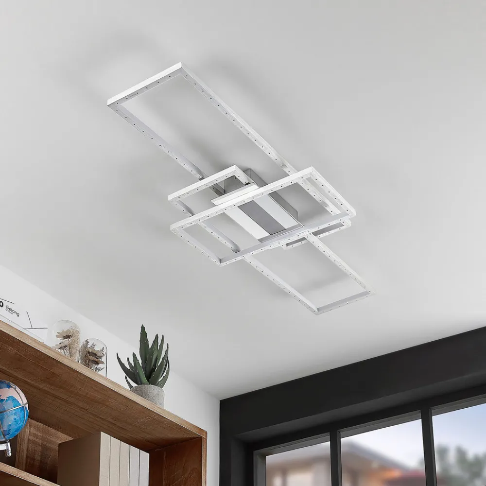LED-taklampe Minel er et ekstraordinært dekorativt stykke og pålitelig lampe på samme tid. Kroppen er laget av jern og aluminium, og diffusoren er laget av silikon. Det ytre består av tre rektangulære lysrammer, som er spesielt festet for å skape et spesielt mønster. To av rammene er plassert vertikalt, mens en annen kobler dem horisontalt. Det er installert faste lysdioder inni, som genererer et varmt hvitt lys og dermed sikrer en passende atmosfære i rommet. LED-taklampe Minel er det perfekte valget hvis du er ute etter noe helt spesielt i tillegg til pålitelig belysning.