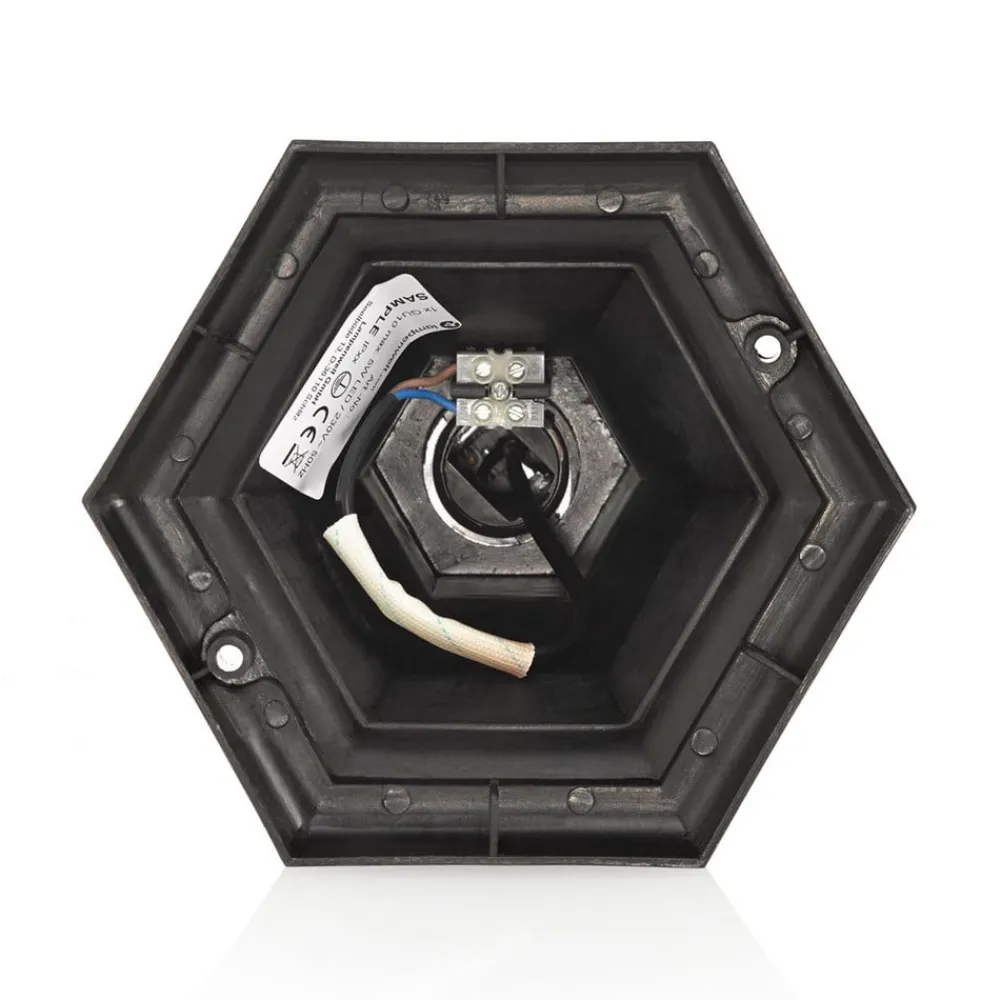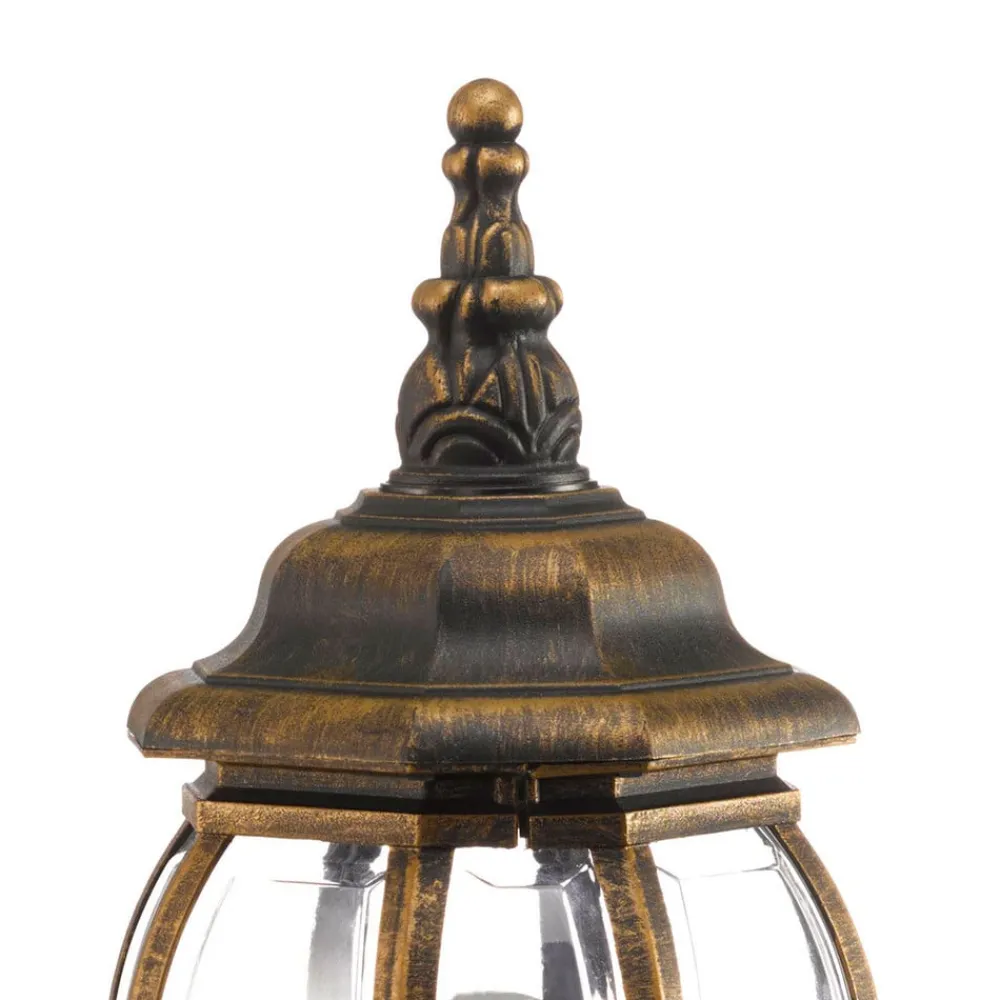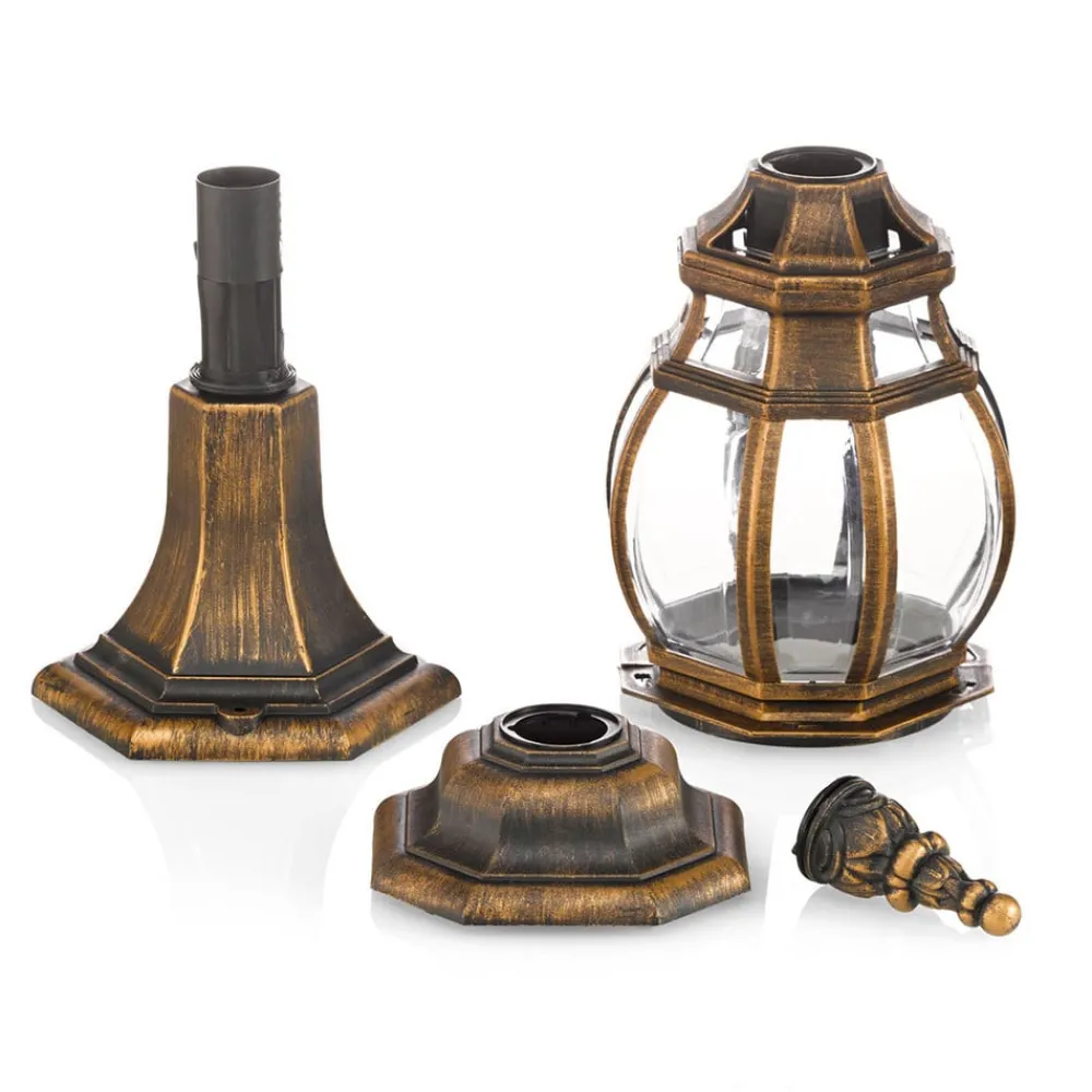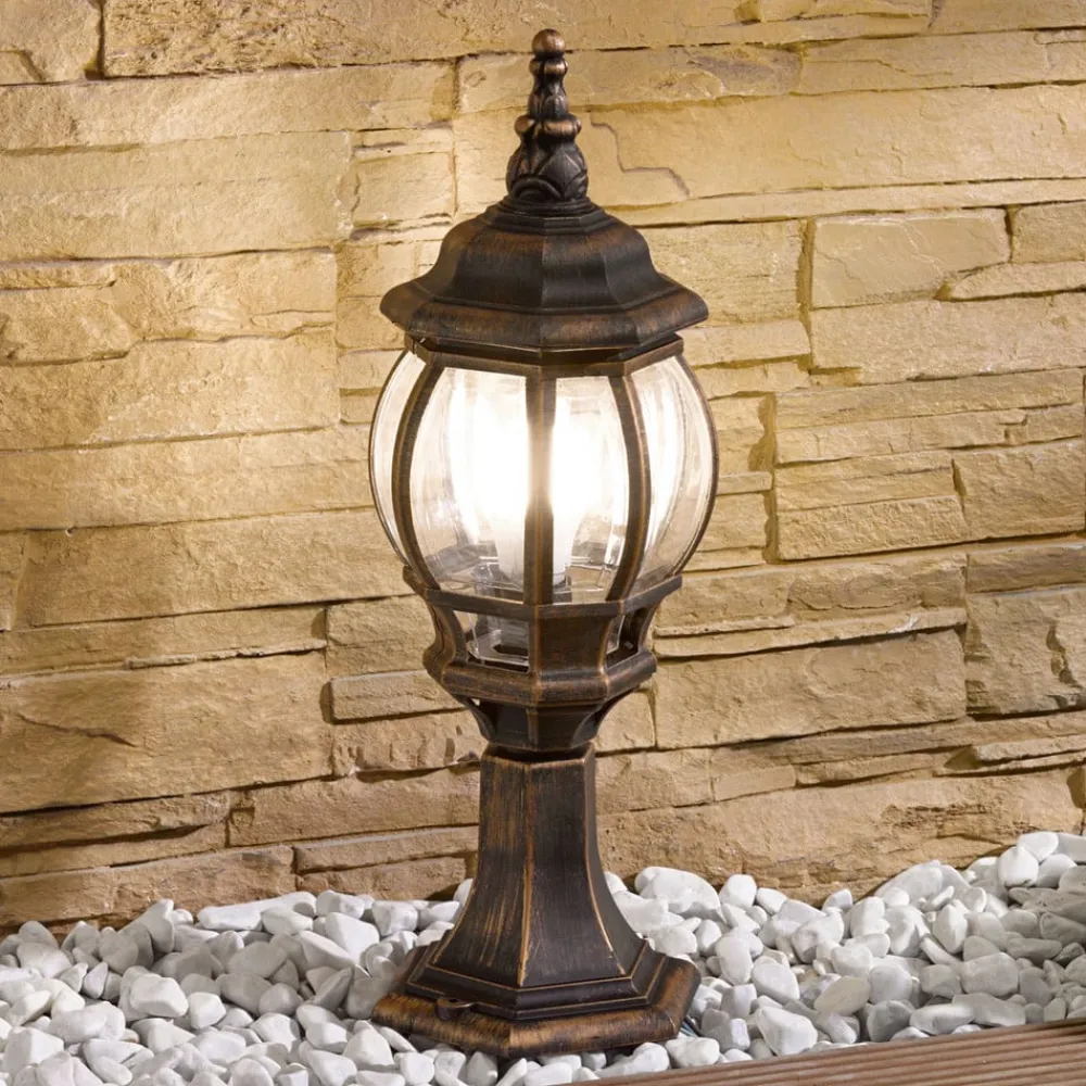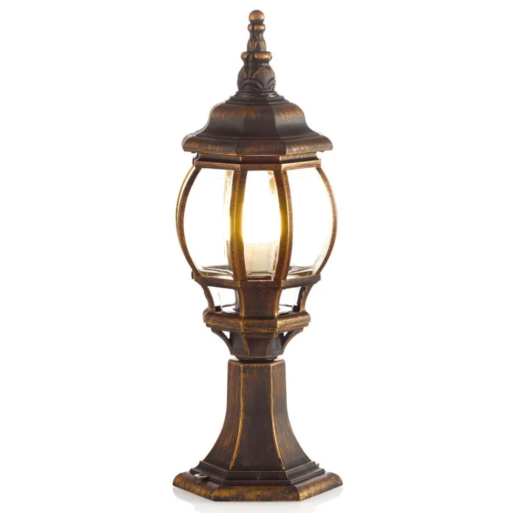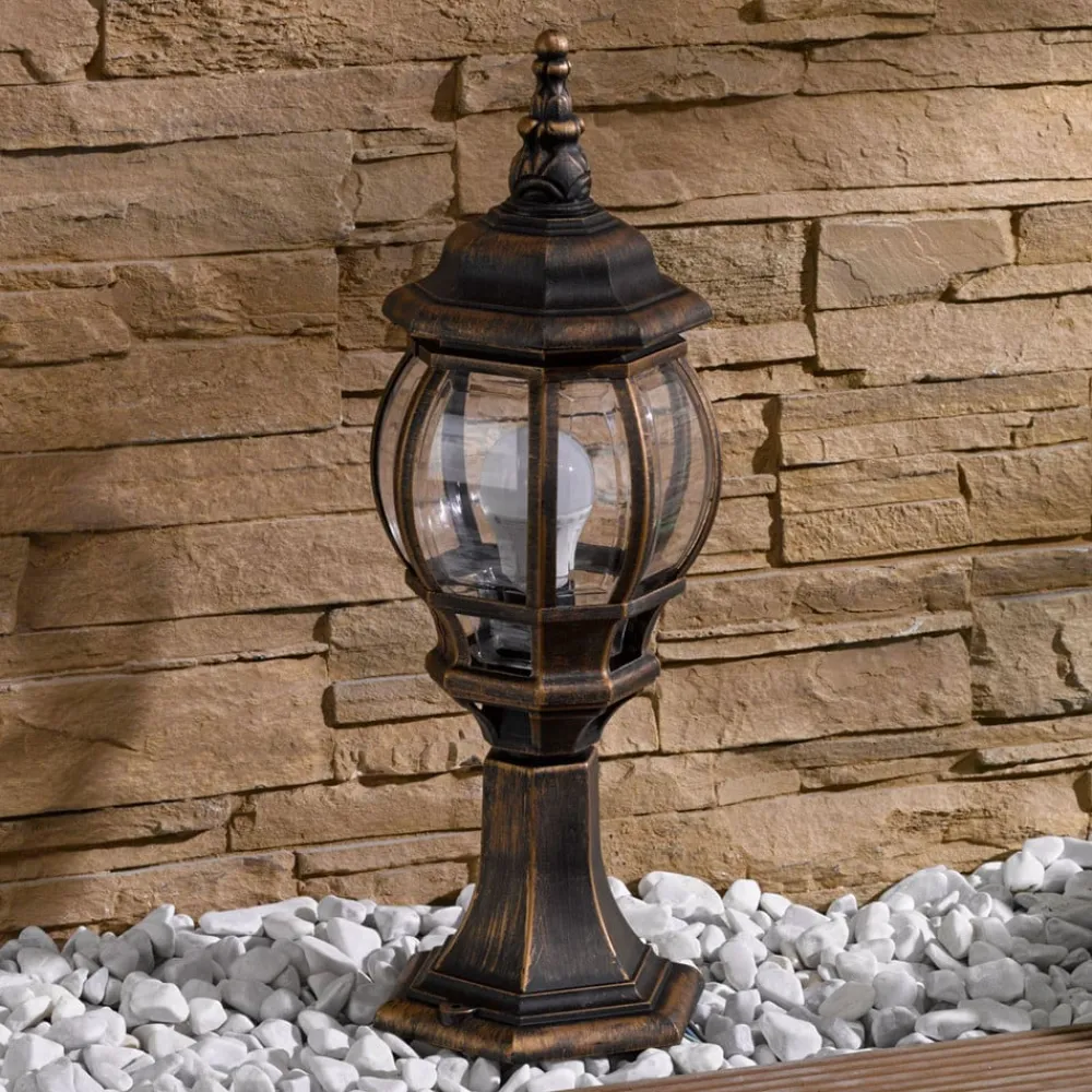 Gylden Nadesha sokkellampe med orientalsk stil – IK06 slagfasthetsklasse, saltvannsresistent Nadesha sokkellampe har et saltvannsresistent plasthus som er farget gyllent, noe som gir den et varmt, antikt utseende. Den utsmykkede designen og de sirlige kurvene minner om orientalsk stil og lysene fra Tusen og en natt. Takket være de klare innsatsene er lyskilden godt synlig og bør derfor velges slik at den fremstår som spesielt stilfull. Dette gjelder spesielt LED-filamentpærer med et rustikt utseende. Sokkellampen kan plasseres på vegger eller andre forhøyninger og er alltid et estetisk blikkfang.
