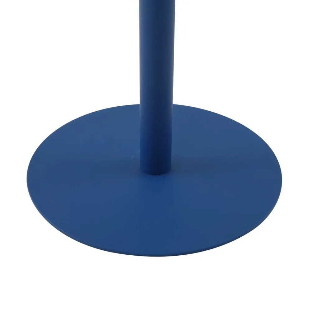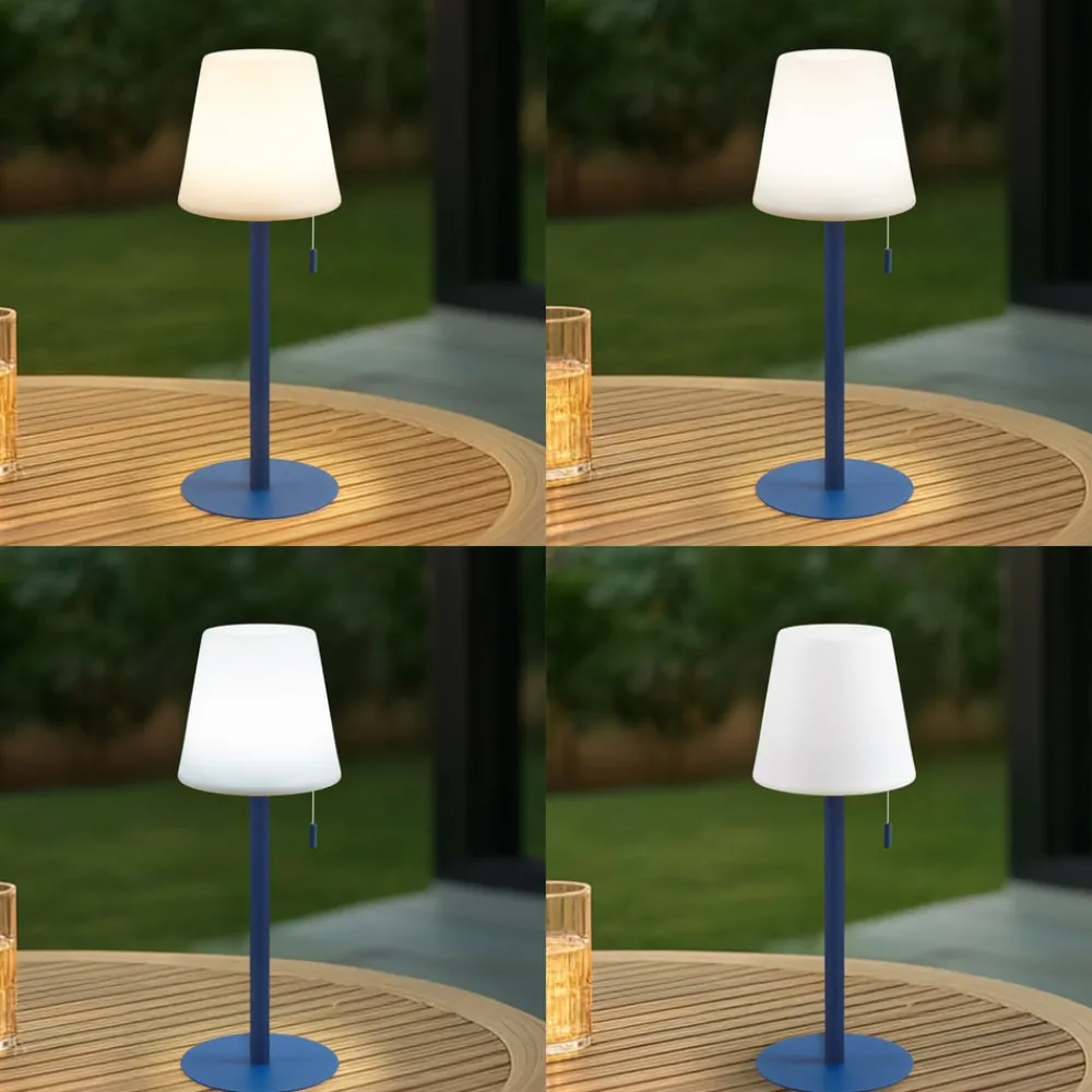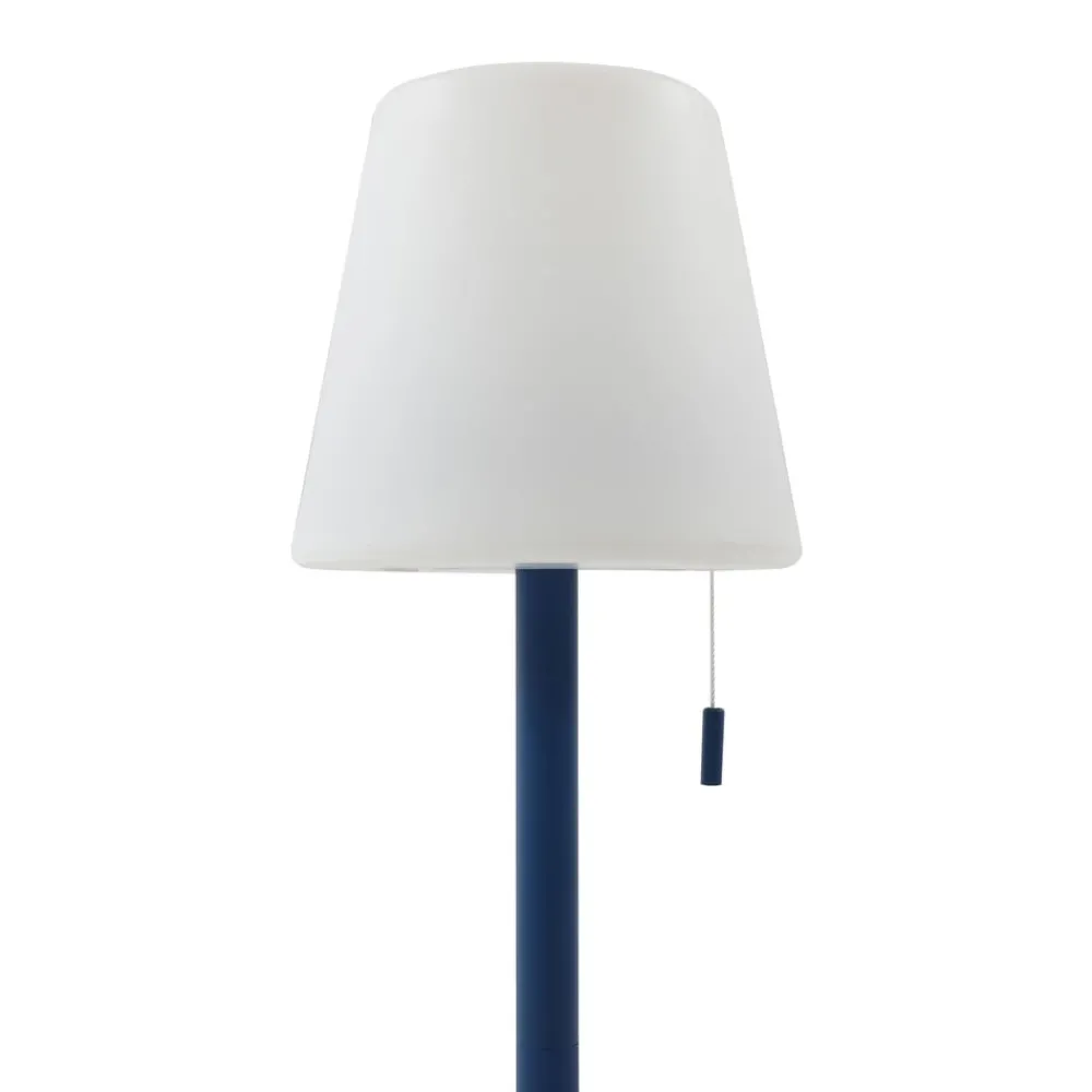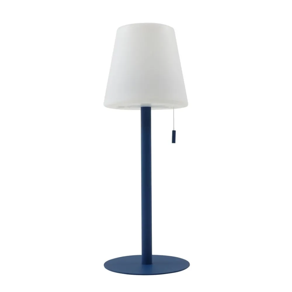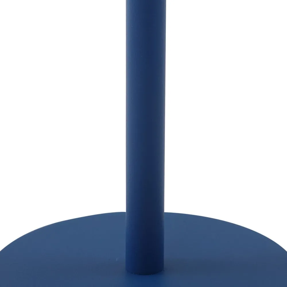 Fleksibel LED-bordlampe Azalea i blått for utendørs bruk Bordlampen Azalea er utstyrt med en blå aluminiumsfot og en hvit skjerm i plast, og gir et jevnt lys som kan justeres i lysfarge ved hjelp av en diskret trekkbryter på undersiden av skjermen. Bordlampen kan justeres i høyden takket være kombinasjonen av to stangelementer. Den er batteridrevet og kan derfor plasseres fleksibelt; den trenger bare en strømtilkobling for lading ved hjelp av den medfølgende USB-kabelen.