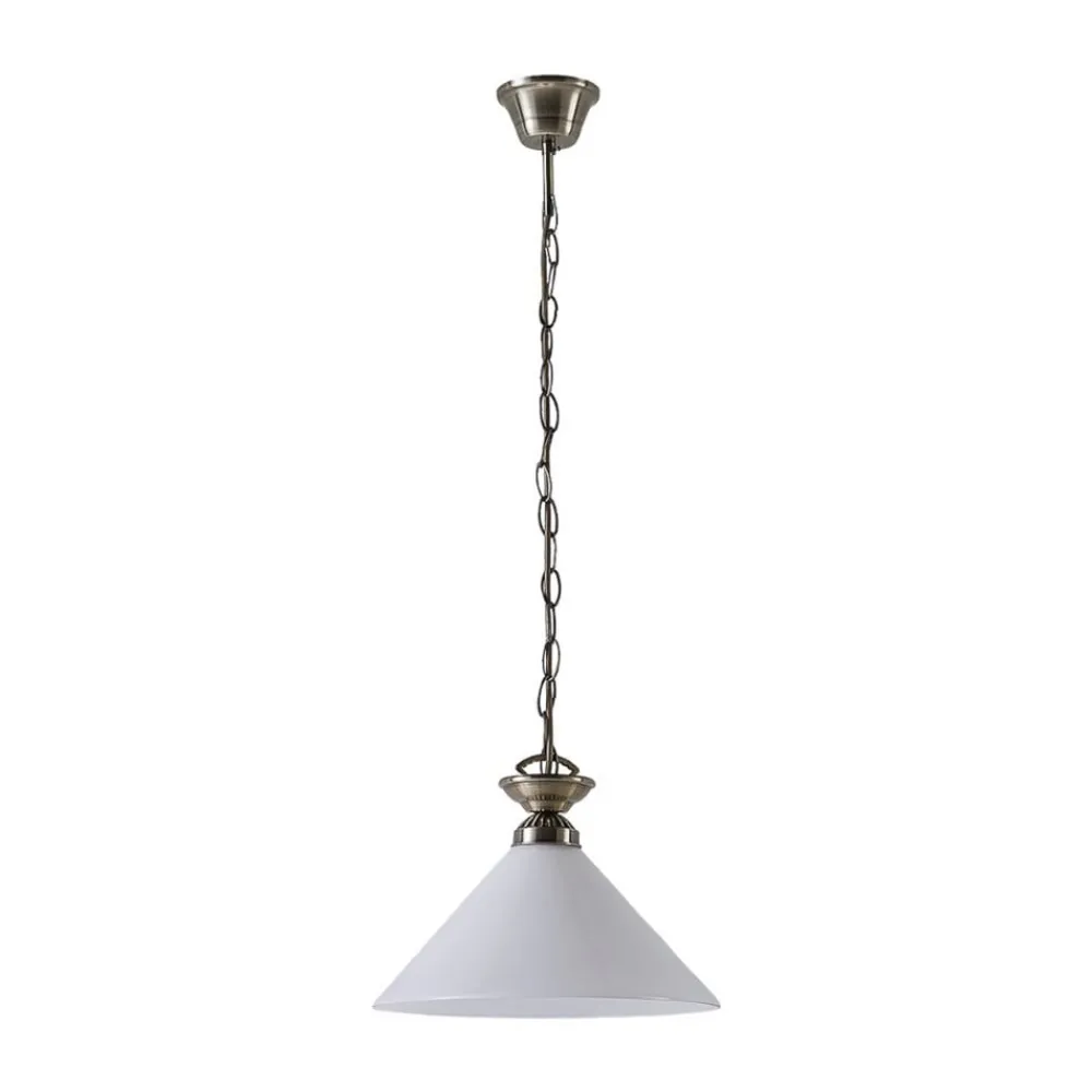 Klassisk utseende Otis pendellampe i glass med vakre detaljer i antikk messing Den opalhvite, blanke lampeskjermen på pendellampen i glass smalner av mot toppen som en kjegle. Der møter den metalldetaljene i antikk messing, som deretter går over i det klassisk utseende kjedeopphenget. Helhetsinntrykket er derfor preget av et klassisk preg, noe som gjør at Otis passer svært godt sammen med tilsvarende interiør. Lyset er mykt og behagelig, og pendellampen i glass kan ikke bare brukes som bordbelysning, den passer også godt i gangen eller på soverommet.