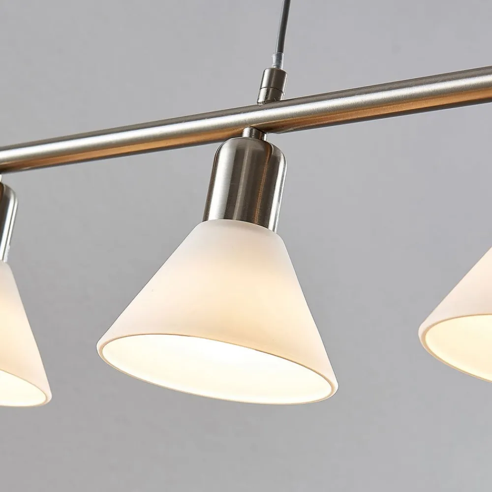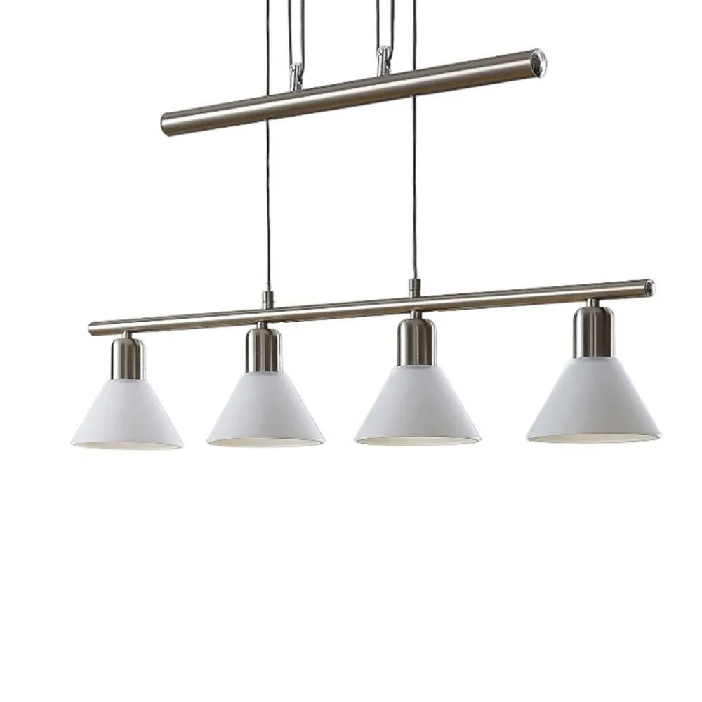 Delira høydejusterbar pendellampe i bjelkeform med fire hvite skjermer og ramme i satengfarget nikkel Pendellampen Delira er designet for bruk over et bord eller en benk og har en langstrakt bjelkeform og en integrert mekanisme som gjør det mulig å justere høyden med noen få enkle trinn. Rammen er i en moderne nikkelfarge med en satengfinish, og skjermene er hvite og laget av glass, noe som skaper en vakker og koselig lyseffekt når hengelampen er i bruk.