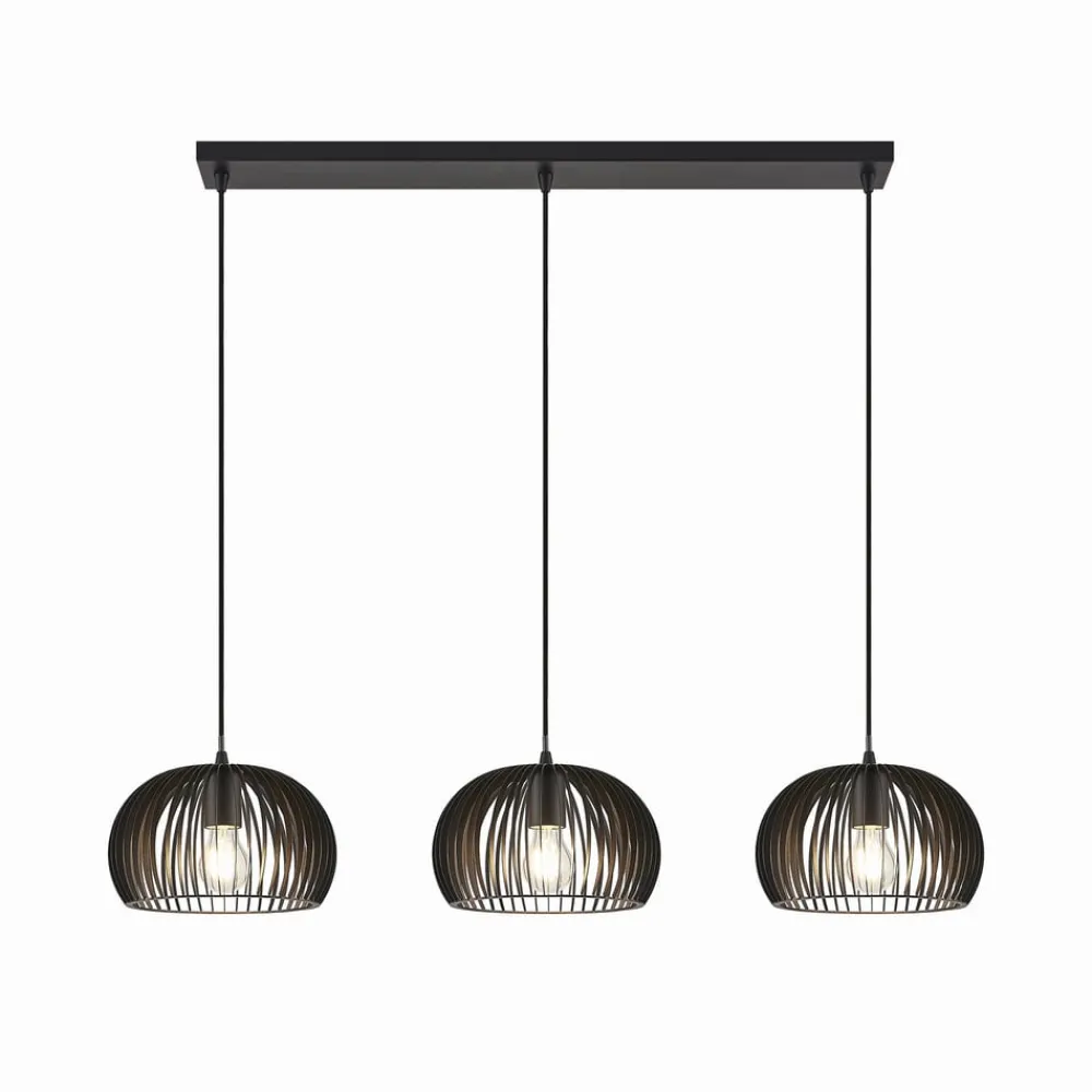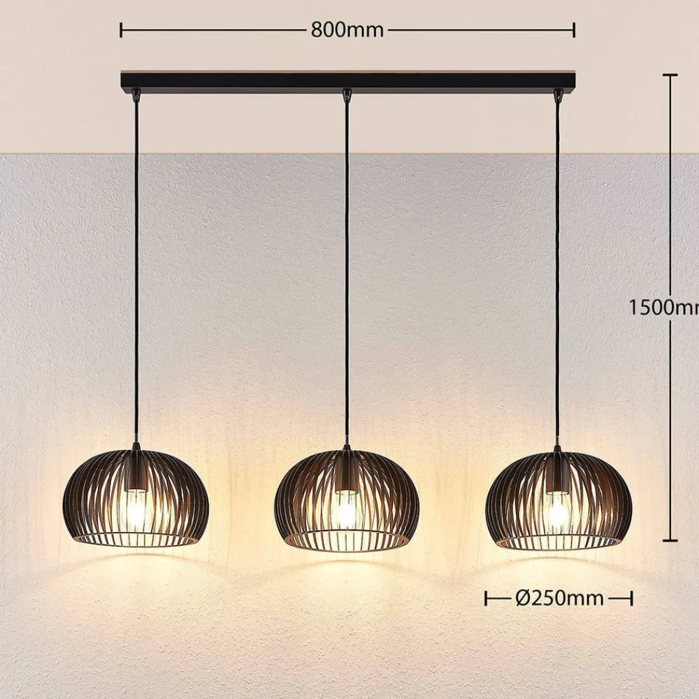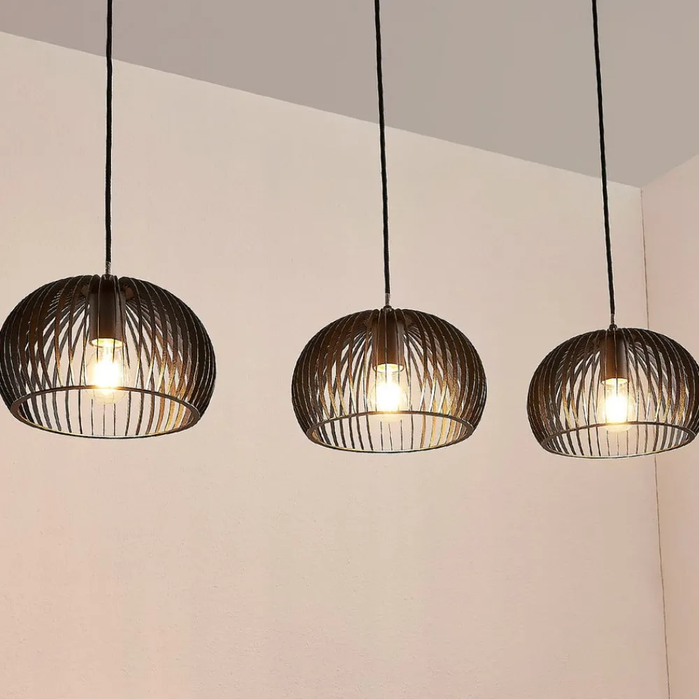 Jusra pendellampe med 3 lyskilder – ideell til bordbelysning Jusra har tre burlignende skjermer, som alle består av svarte metallameller og avbøyer lyset på en skånsom måte, noe som skaper en spesiell effekt med et vakkert skimmer. Spesielt en bordflate kan belyses veldig godt med pendellampen takket være de 3 lyskildene. Helhetsinntrykket blir spesielt stilig hvis du velger filamentpærer, som ser ut som klassiske glødepærer, men som bruker langt mindre strøm takket være LED-teknologien.