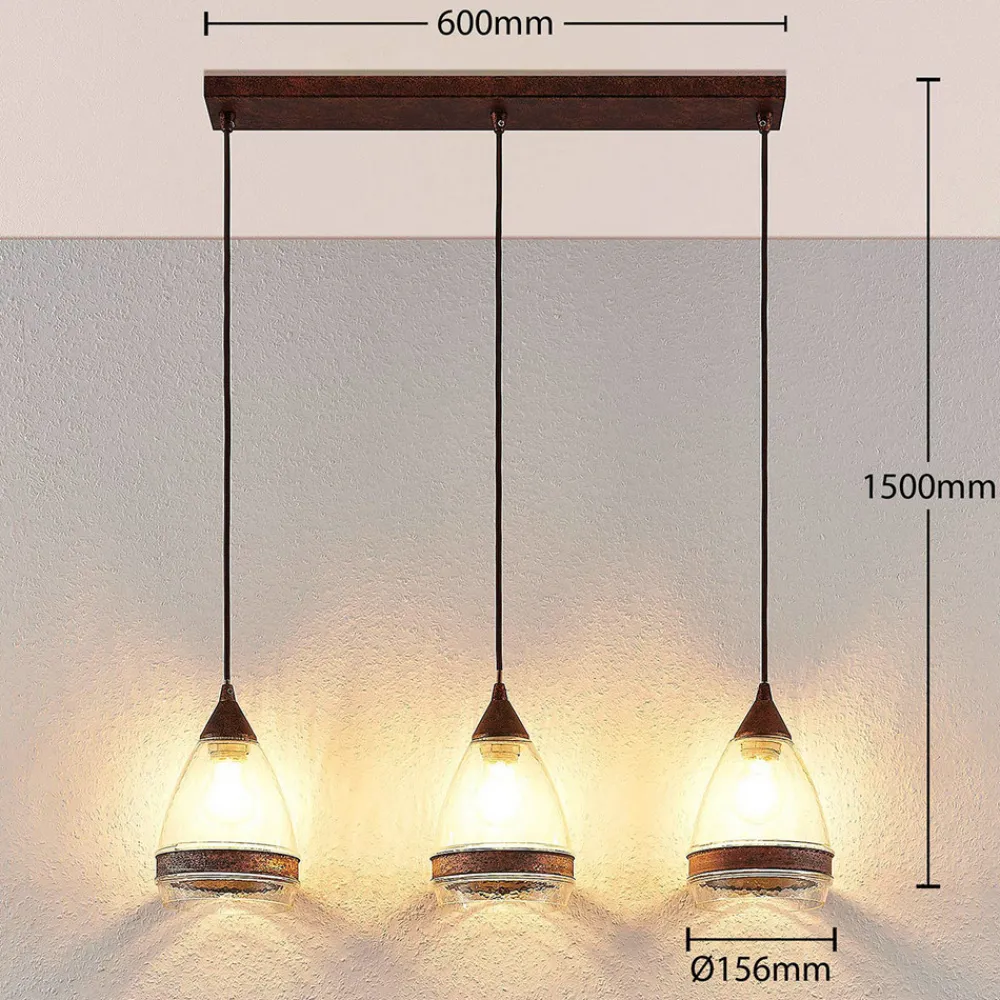 Rustfarget Millina pendellampe med 3 lyskilder i glass – ideell til belysning av spisebordet Millina er en pendellampe som med sine 3 lyskilder og avlange form er ideell til belysning av et bord. Skjermene er laget av fint strukturert klart glass og har integrerte metallelementer med rustfarget finish. Glassdesignen gir lyskildene i den 3 lyskilder pendellampen en spesiell tilstedeværelse, noe som gjør LED-pærer med LED-filamentpære eller et rustikt utseende spesielt effektive.