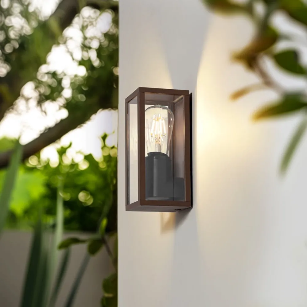 Robigus kantete utendørs vegglampe i rustikk, rustfarget design Robigus utendørs vegglampe kombinerer både moderne og rustikke stilelementer i sin kubiske design, noe som gjør at den passer sømløst inn i ulike arkitektoniske konsepter. Med kapslingsgrad IP54 er denne lampen spesielt designet for utendørs bruk og tåler støv og vannsprut. Robigus utendørs vegglampe er derfor en ideell belysningsløsning som forener funksjonalitet og estetikk.