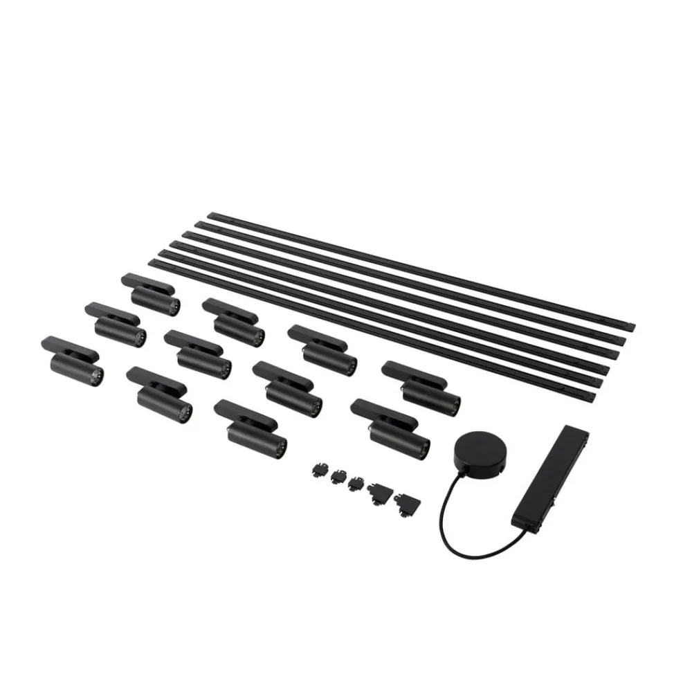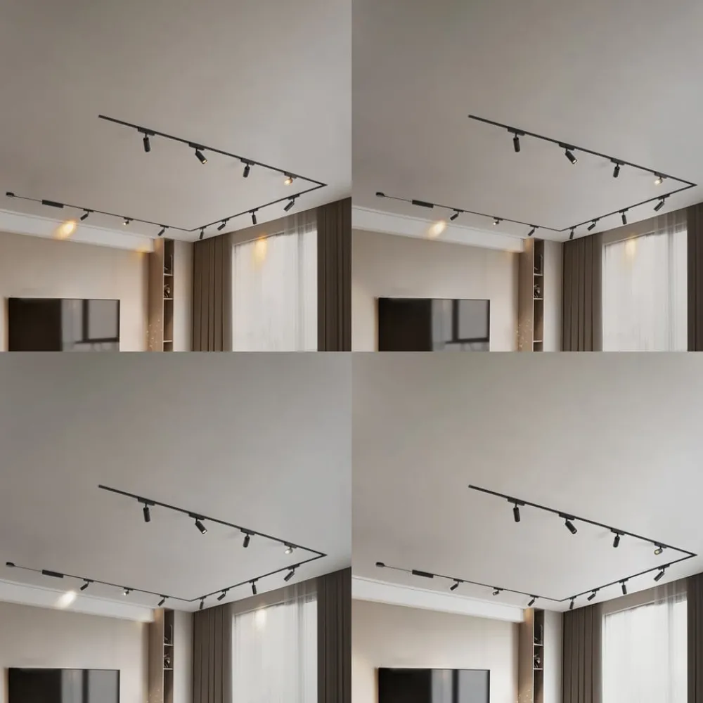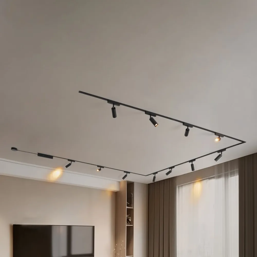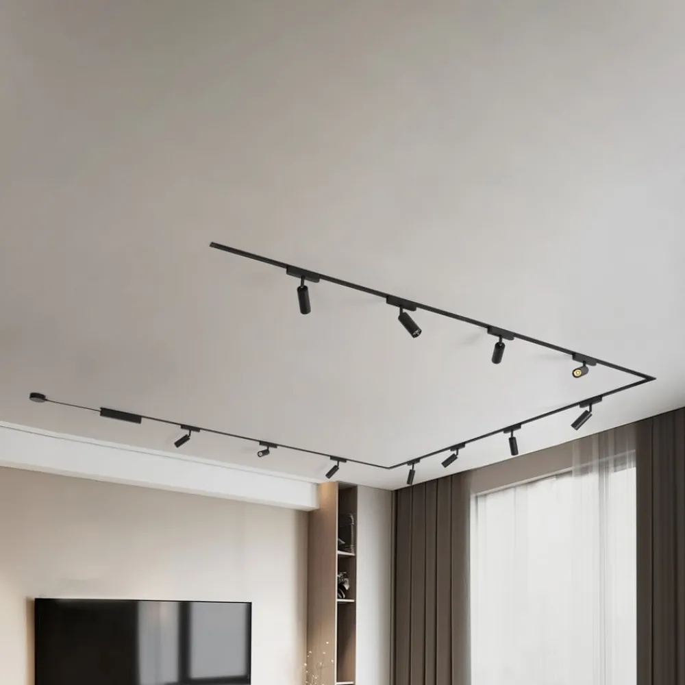 Lumaro-skinnebelysningssystemet imponerer med sin elegante sorte farge og kombinasjonen av jern, aluminium og plast. Med sitt flate, stilfulle design passer det perfekt inn i moderne boliger. Installasjonen er rask og enkel, og takket være lavspenningssystemet er det energieffektivt, bærekraftig og holdbart.
