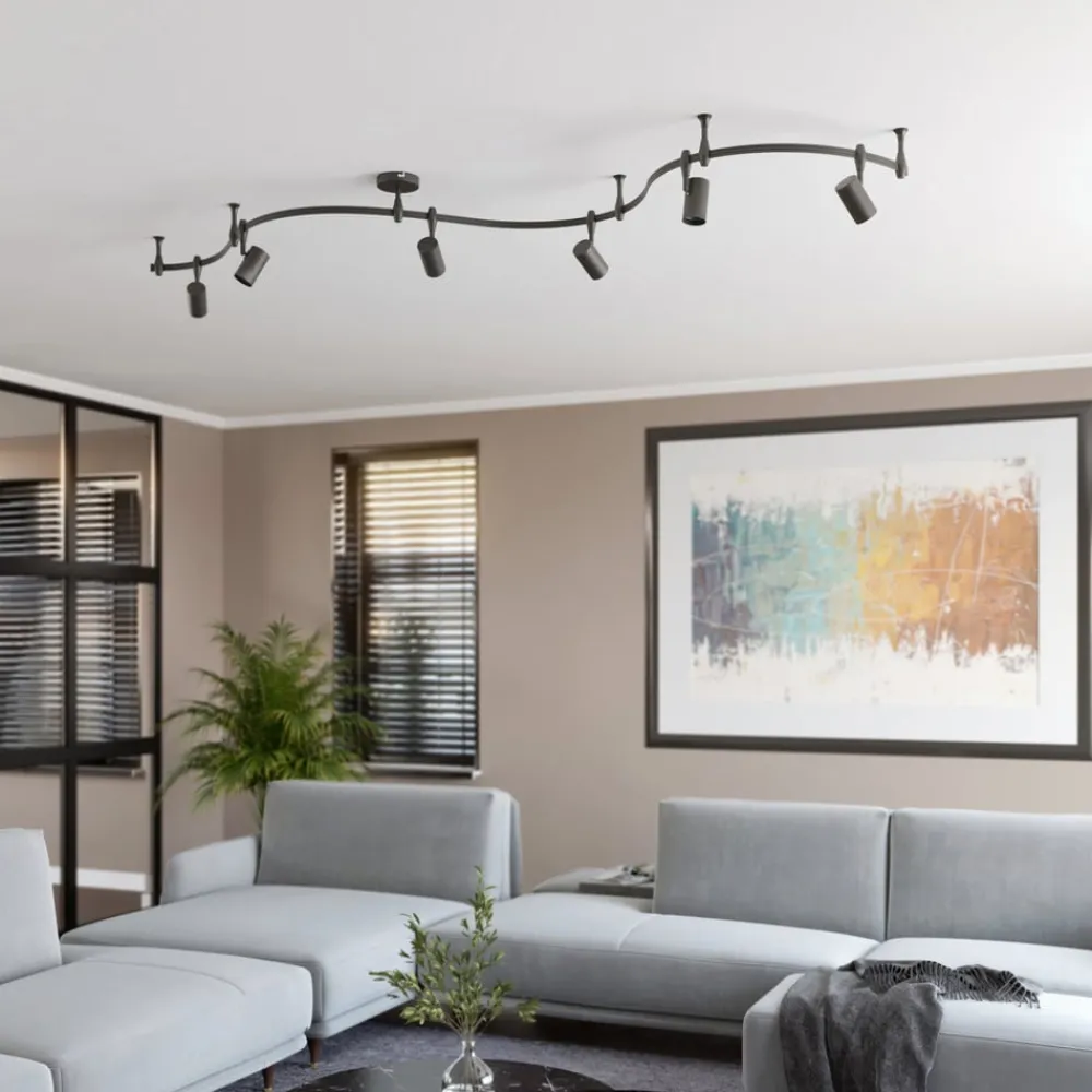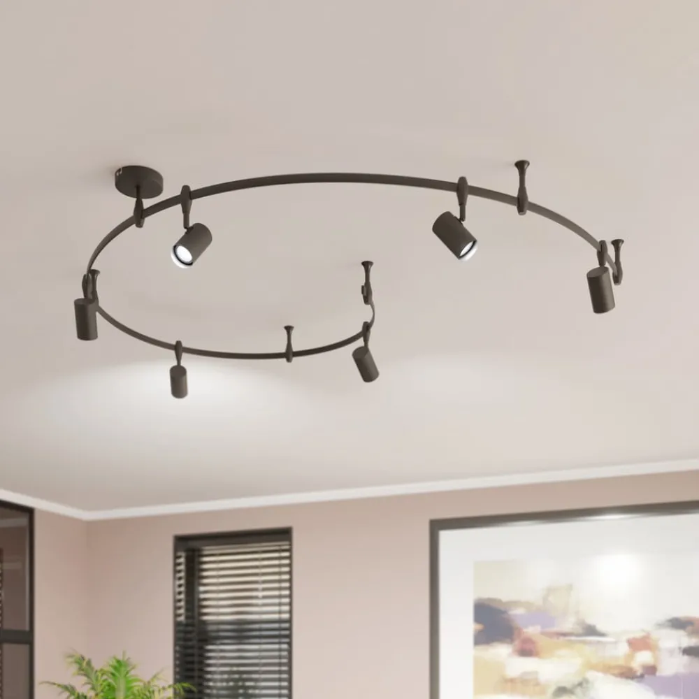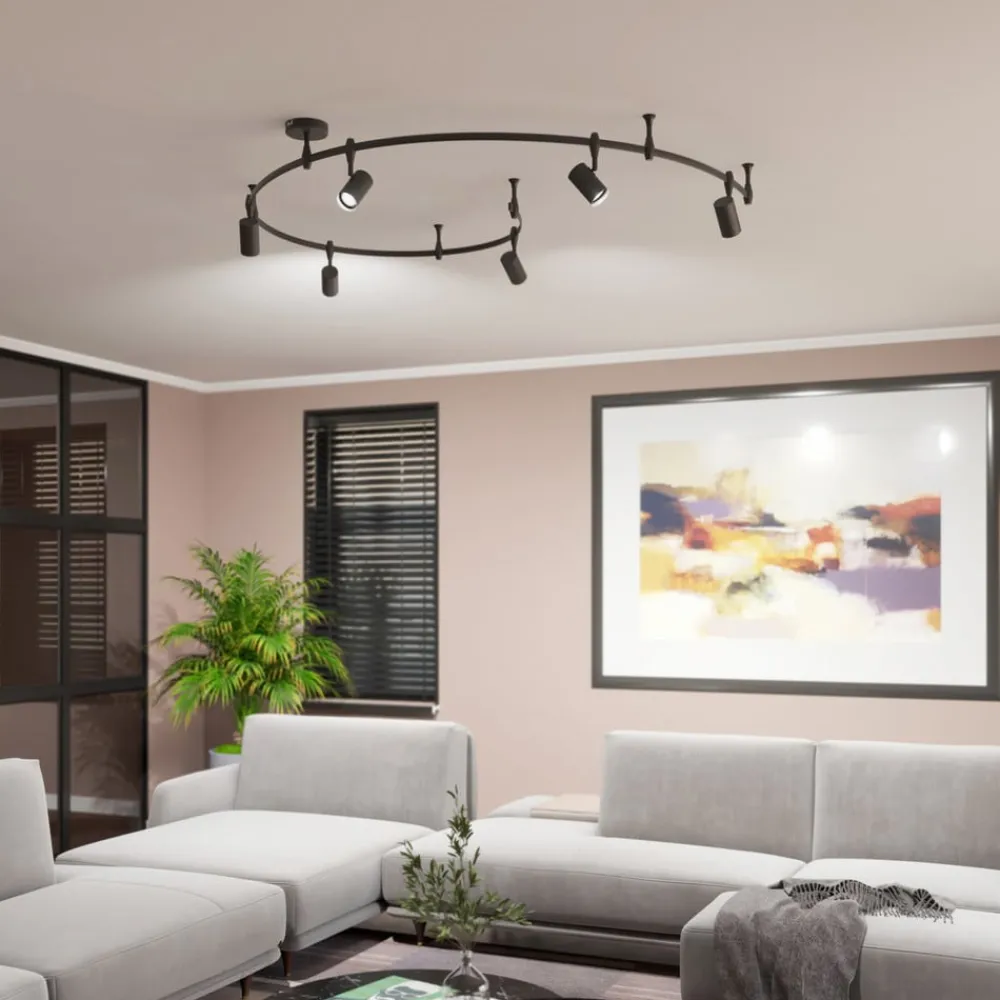 Sandsvart Delila skinnesystem i moderne design med sylindriske lampeskjermer Delila skinnesystem er stilrent og litt lekent. Det er laget av aluminium og stål og består av en buet skinne som seks sylindriske lampeskjermer er festet til. Den kan utstyres med pærer av typen GU10, og skjermenes fleksibilitet garanterer at hvert hjørne blir belyst. Den diskrete fargen i sandsort og det glatte materialet gir lampen et elegant uttrykk og gjør at den lett kan integreres i moderne innredningsstiler. Delila skinnesystem setter subtile aksenter på flate tak og utfyller møblene på en behagelig måte.