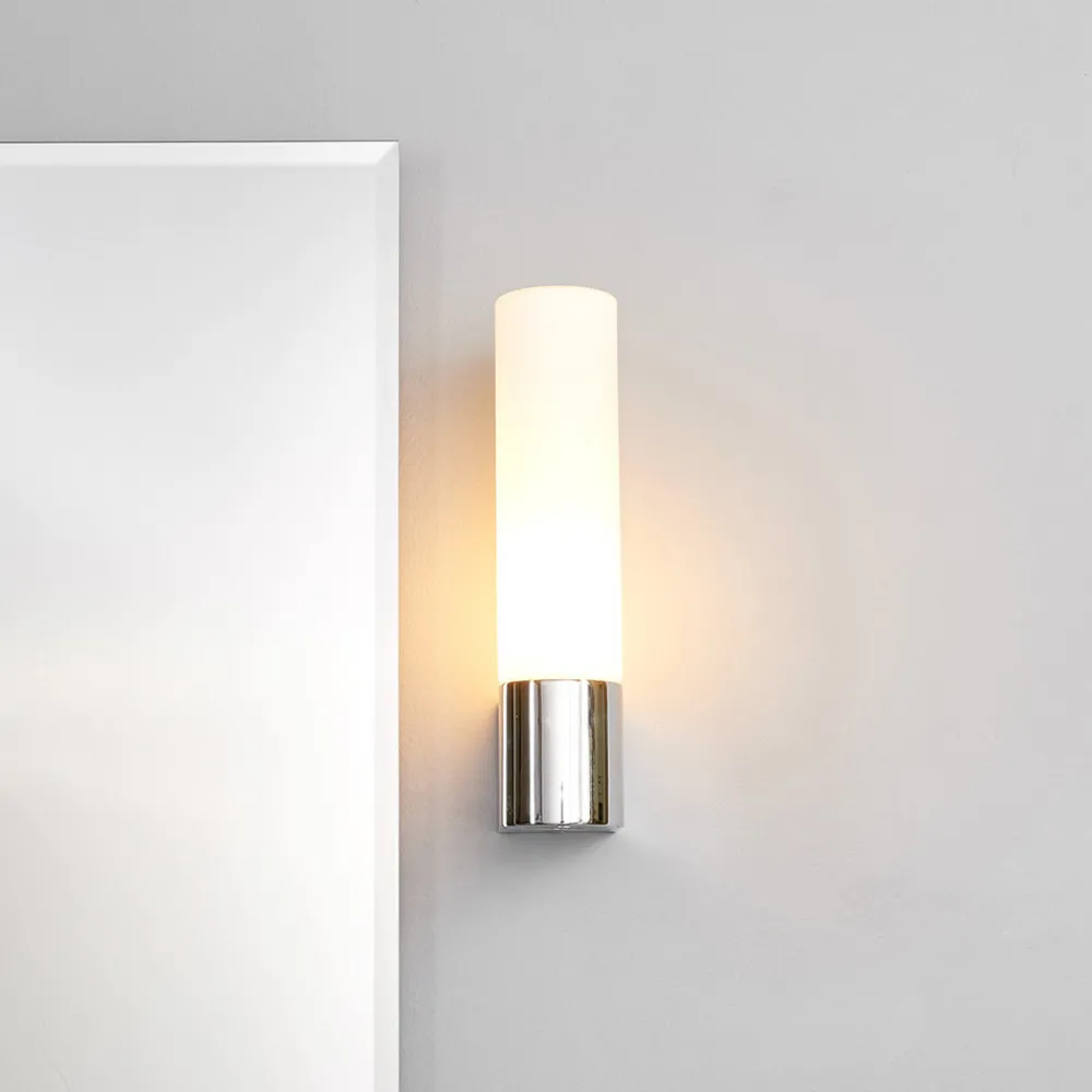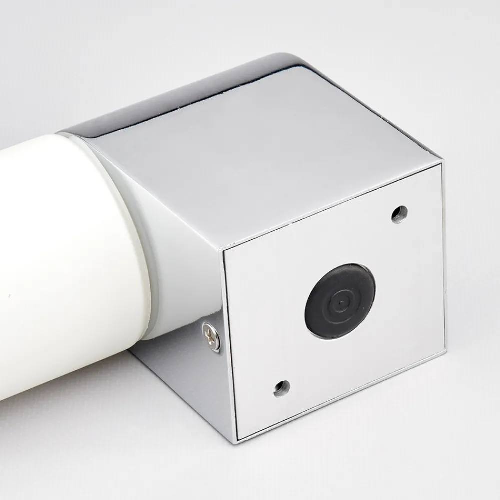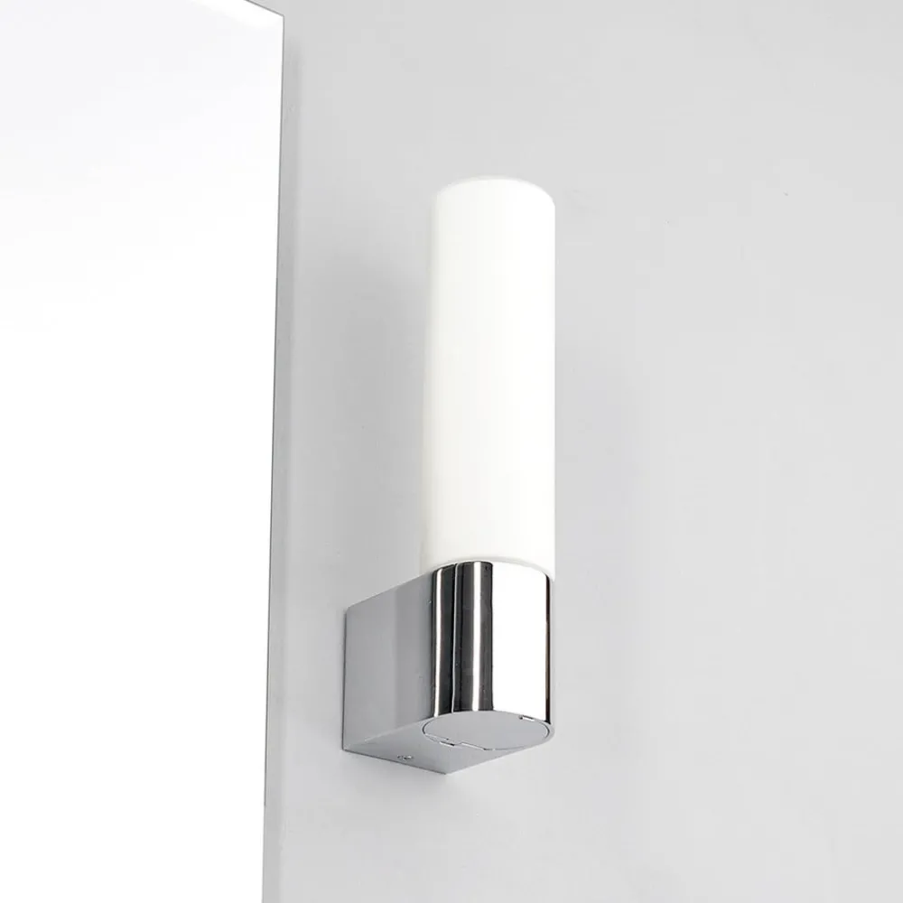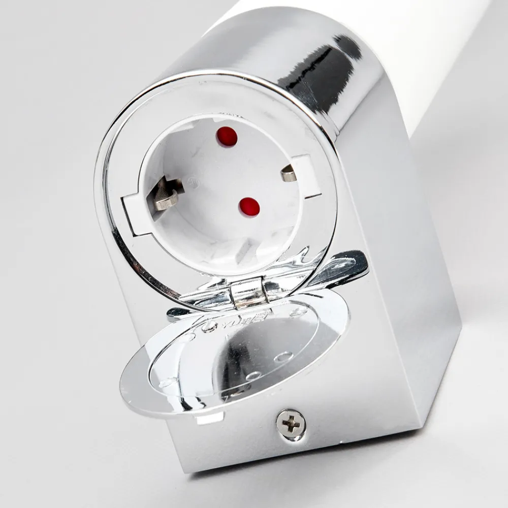 Med stikkontakt – Melike speillampe Spesielt små bad er takknemlige for enhver plassbesparende løsning. Ofte står man overfor problemet med at det ikke er nok stikkontakter og belysning. Vegglampen Melike slår to fluer i ett smekk og er det perfekte valget når det gjelder en lyskilde ved siden av speilet. På undersiden av den blanke, forkrommede rammen er det nemlig en stikkontakt. Den er godt tildekket av en klaff, slik at den ikke er synlig når den ikke er i bruk og ikke forringer lysets helhetsinntrykk. Samtidig er Melike også en stilig lyskilde som imponerer med sin stilrene design. Selve lyskilden, en tradisjonell glødepære, er omgitt av en sylindrisk glassskjerm som sørger for en myk lysfordeling. Plassert til høyre og venstre for et speil gir Melike-armaturen et sterkt lys og gir det lille ekstra med den integrerte stikkontakten.