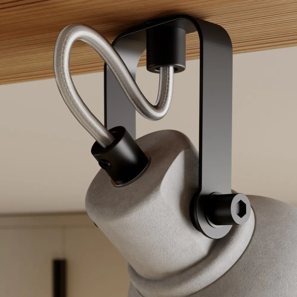 Trendy Mitis taklampe i betong, dimbar Mitis taklampe er midt i blinken takket være de vakkert formede lampeskjermene i betong og det mørke, naturtro armaturet i furu. Lampen er et perfekt uttrykk for industriell design og passer perfekt inn i en moderne stue eller spisestue. De fire flammene spotlighter i ulike retninger avhengig av hvordan de vender, noe som sikrer optimal belysning med et koselig lys. Lampen kan utstyres med dimbare pærer.