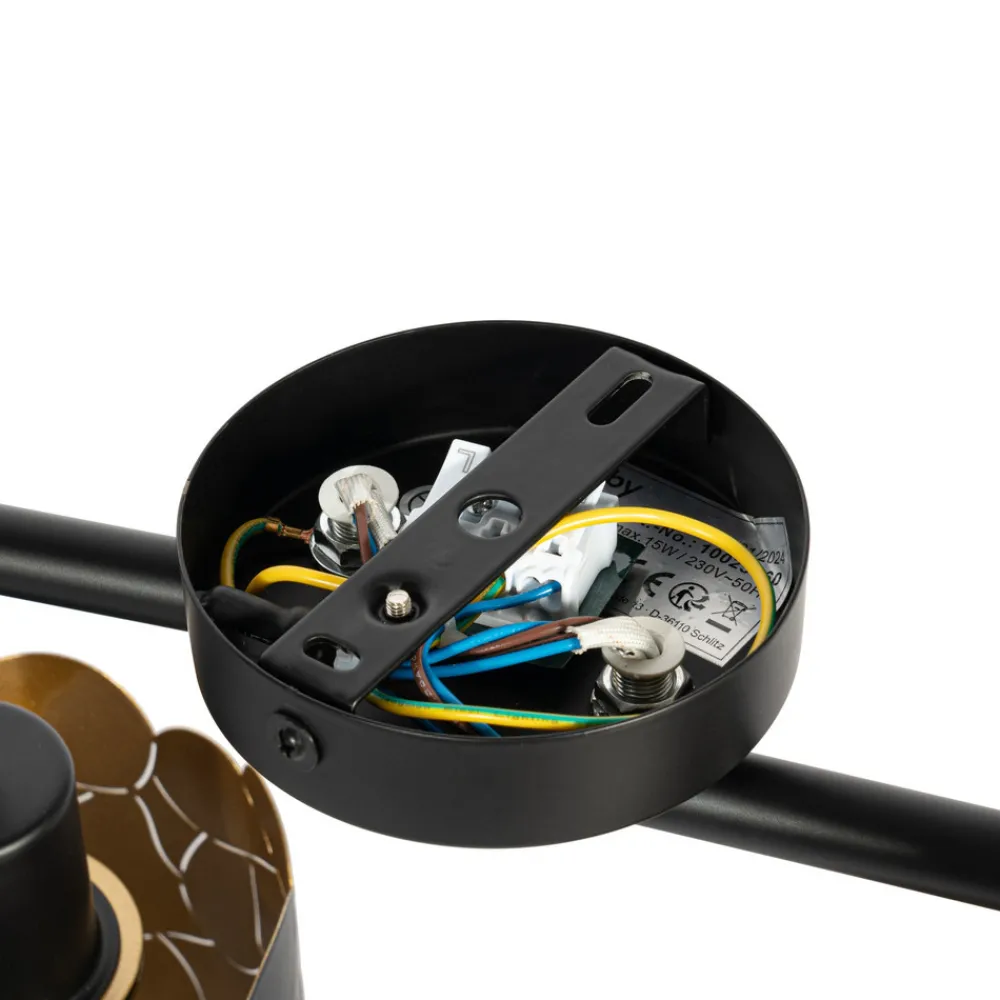Aralena taklampe: eleganse i svart og gull for stue og spisestue Aralena taklampe med mønster i svart og gull føyer seg sømløst inn i moderne interiørdesignkonsepter og tilbyr en belysningsløsning med 4 lyskilder som bader stuer, spisestuer og ganger i stemningsfullt lys. Kombinasjonen av svart basefarge og gylne aksenter gir et elegant preg til ethvert rom, samtidig som lysfordelingen skaper en spesiell atmosfære takket være det sofistikerte mønsteret. Selv om det ikke følger med en dimmer, kan lysstyrken justeres individuelt ved hjelp av en ekstern dimmer for å oppnå ønsket atmosfære.