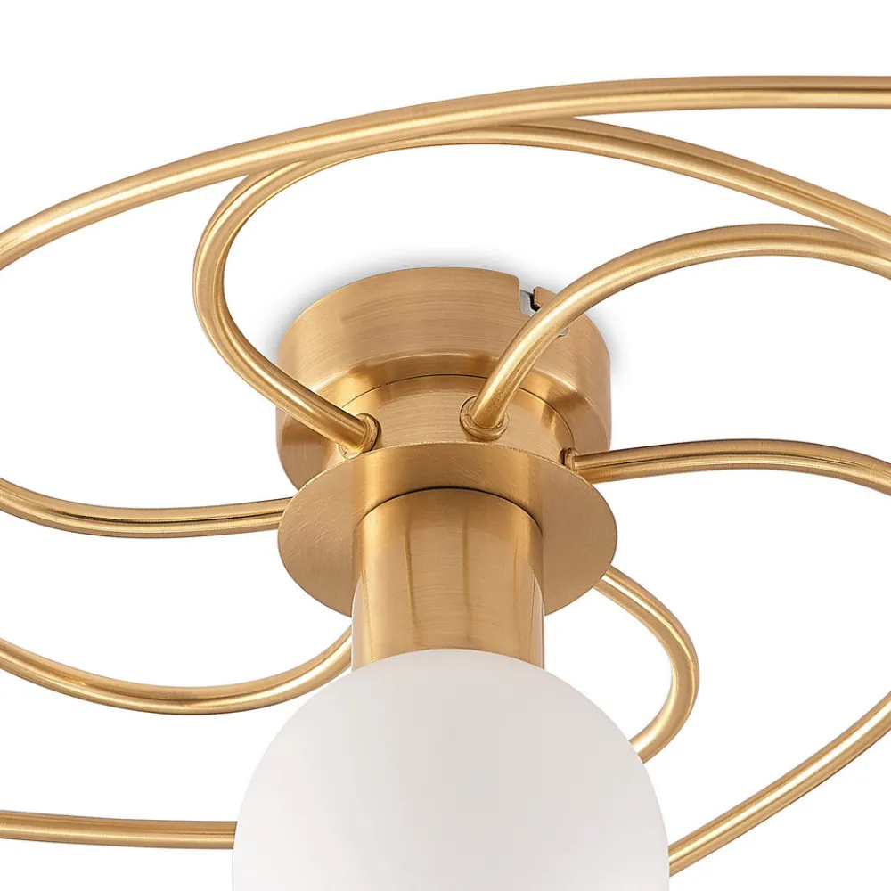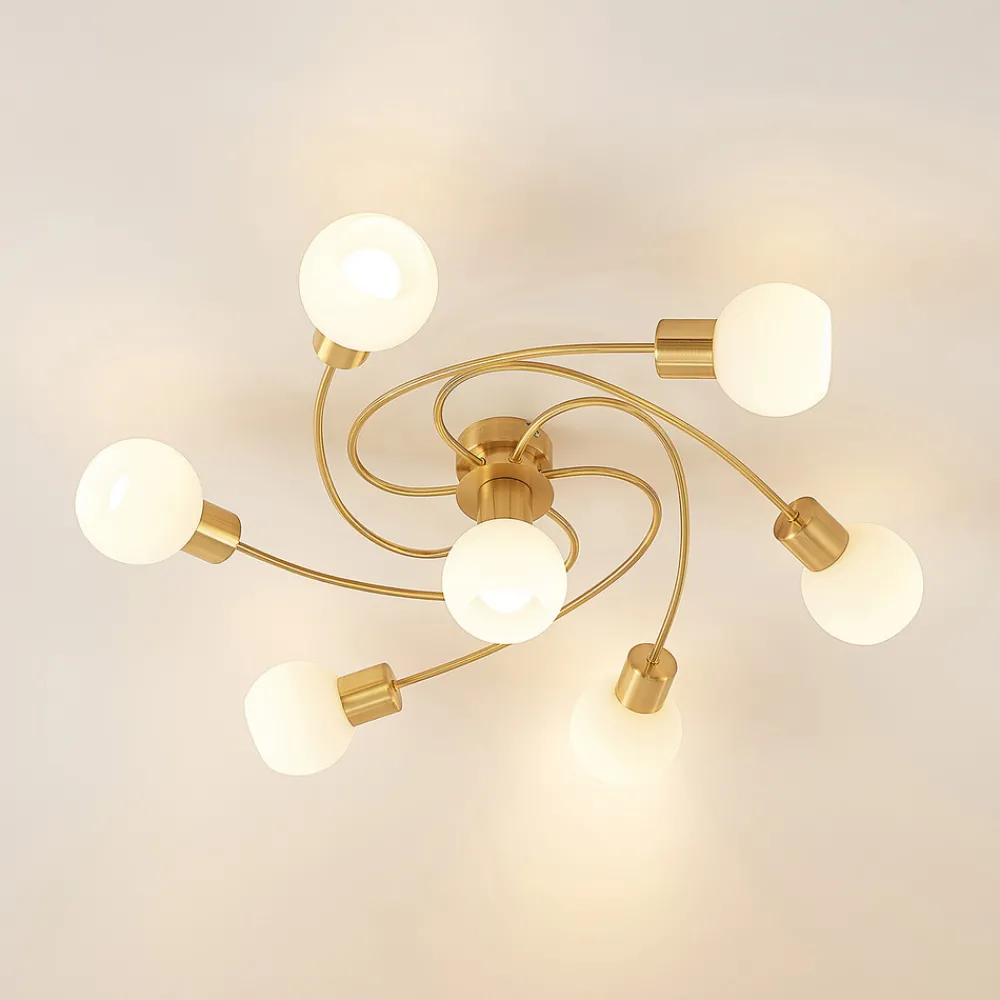 Messingfarget Ciala taklampe i trendy spiralform Ciala er en moderne lyskilde som umiddelbart fanger blikket med sin vakkert buede ramme i messingfarget jern. Samtidig skyver den seg ikke for mye i forgrunnen takket være de opalhvite lampeskjermene, slik at den ikke overskygger møblene. Ciala taklampe med 7 lyskilder kan også lyse opp større rom på en god måte og tar seg flott ut i taket i stuen.