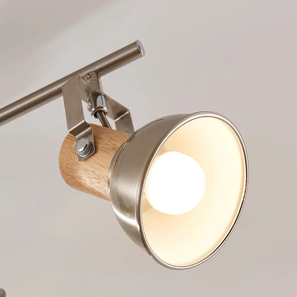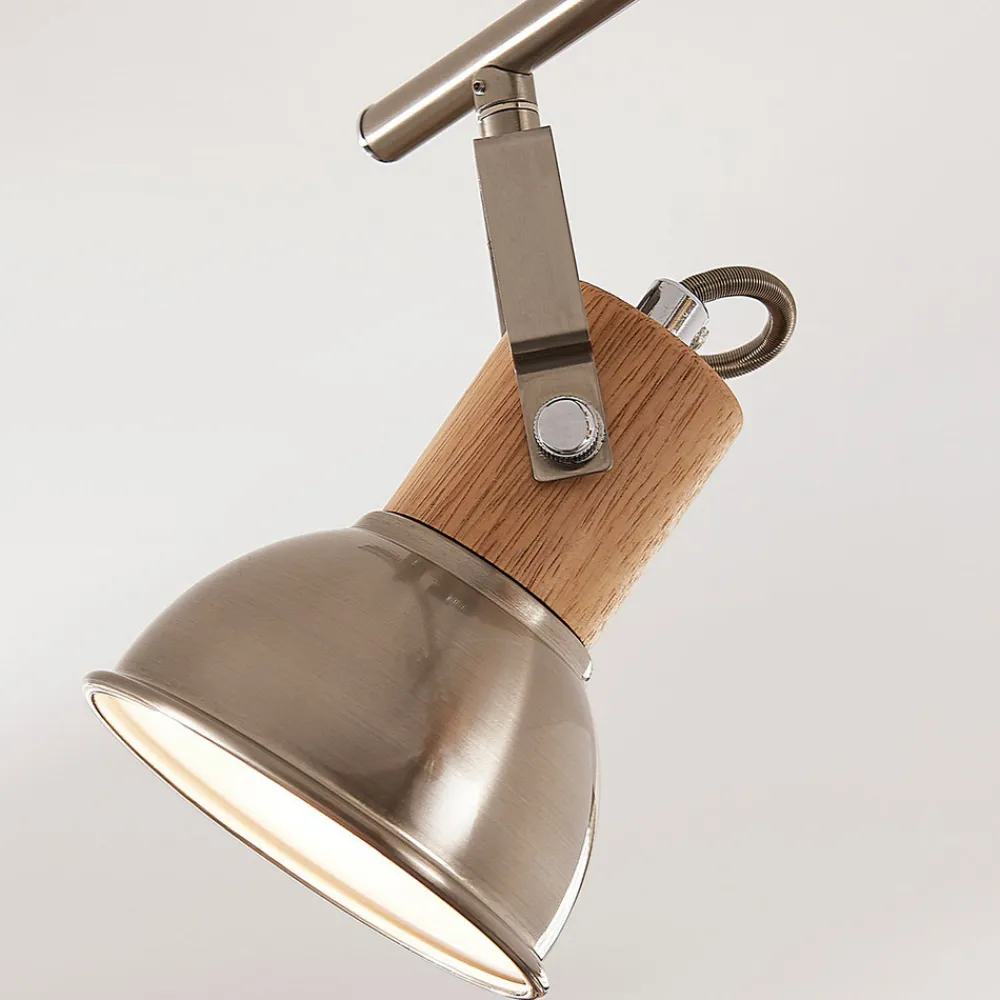 Vakker design laget av nikkelfarget metall og tre: Dennis taklampeDenne taklampen er en vakker allrounder for oppholdsrom som kombinerer et kjølig uttrykk med et varmt preg, noe som skyldes at nikkelfarget metall har blitt kombinert med trekomponenter. Hver av de tre skjermene kan flyttes etter ønske, ettersom leddene gjør det mulig å dreie og svinge den for bedre å endre lysretningen.