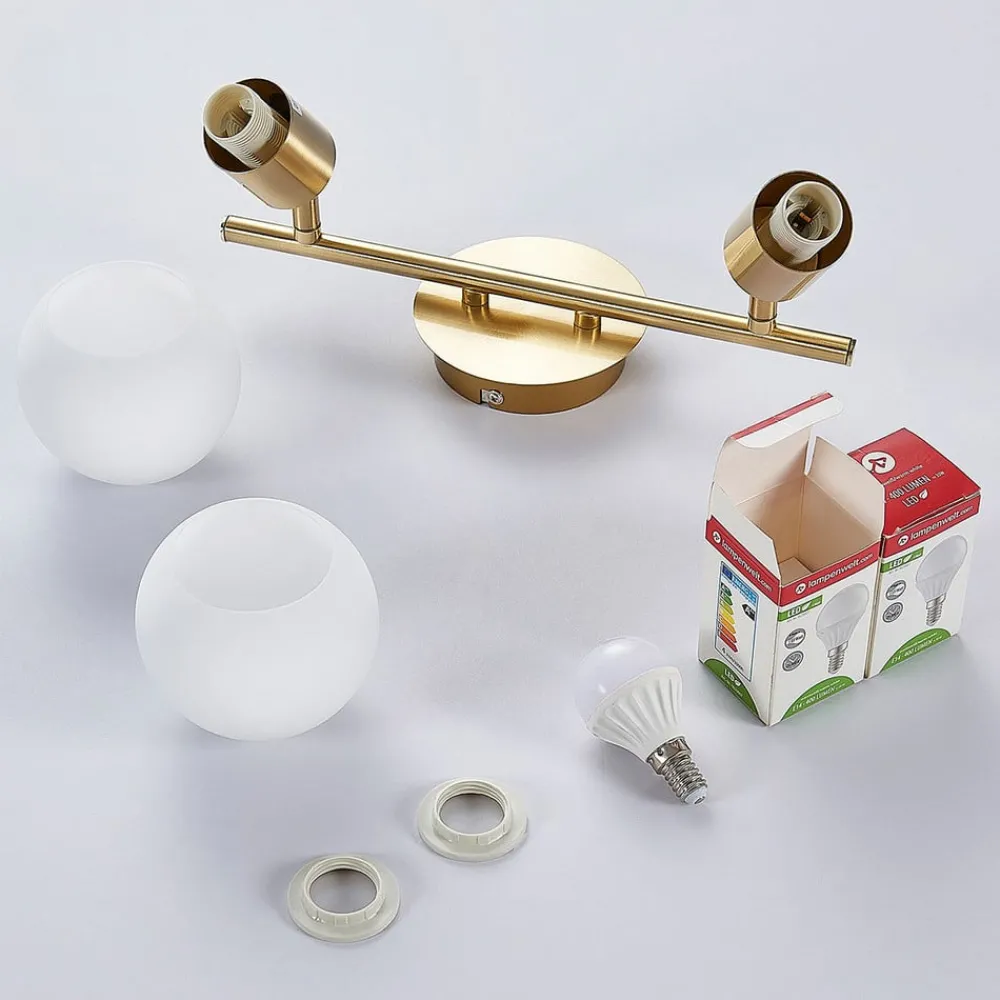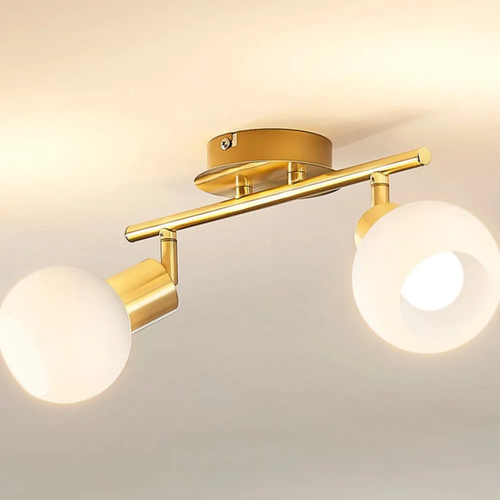 Elaina taklampe med opale glassskjermer og E14-fatninger De hvite glassskjermene på taklampen med 2 lyskilder gir et vakkert og jevnt lys, og lampehodene kan justeres etter behov. Dette gjør Elaina til en lyskilde som passer til mange ulike formål, rom og stilarter. Den kan utstyres med fritt valgbare E14-pærer, slik at lysfarge og lysintensitet kan tilpasses dine egne behov.