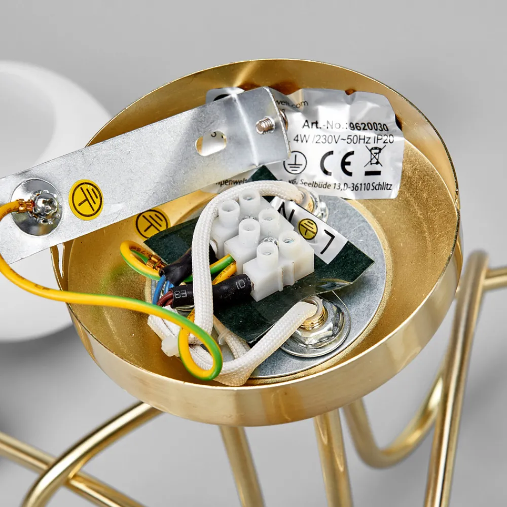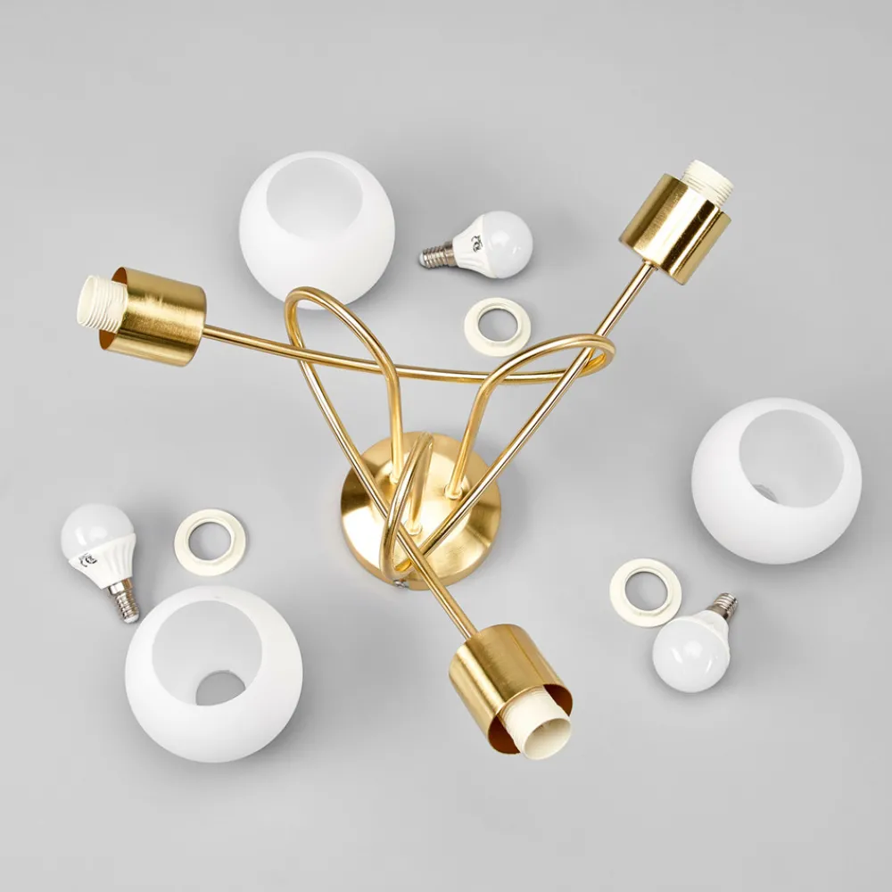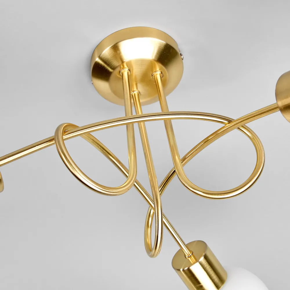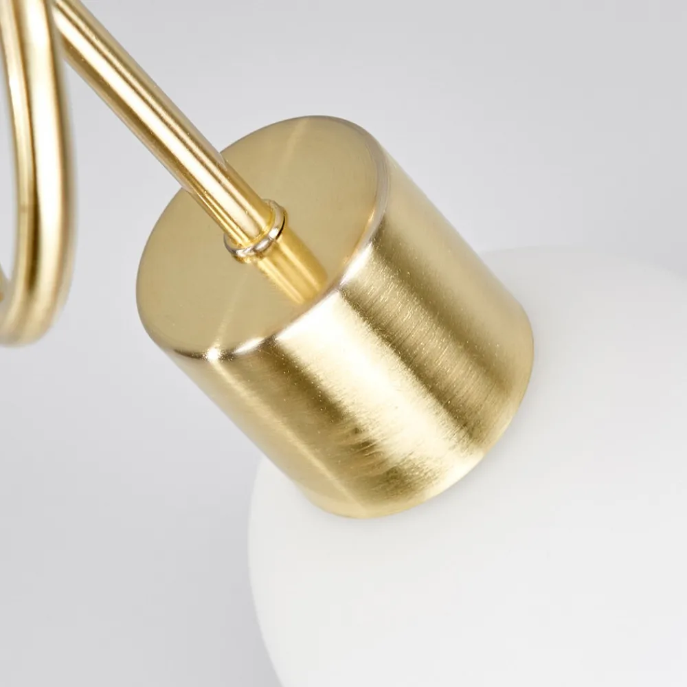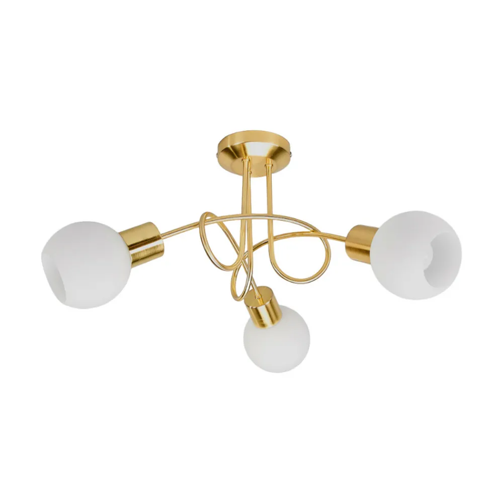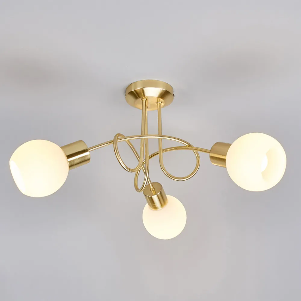 Klassisk utseende Elaina taklampe for E14-lamper Hele rammen på Elaina taklampe er vakkert vridd inn, noe som virker spesielt elegant med den messingfargede overflaten og passer perfekt til en eksklusiv, klassisk innredningsstil. De hvite opalglassskjermene skaper et vakkert, koselig lys som bidrar til en spesiell følelse av komfort.