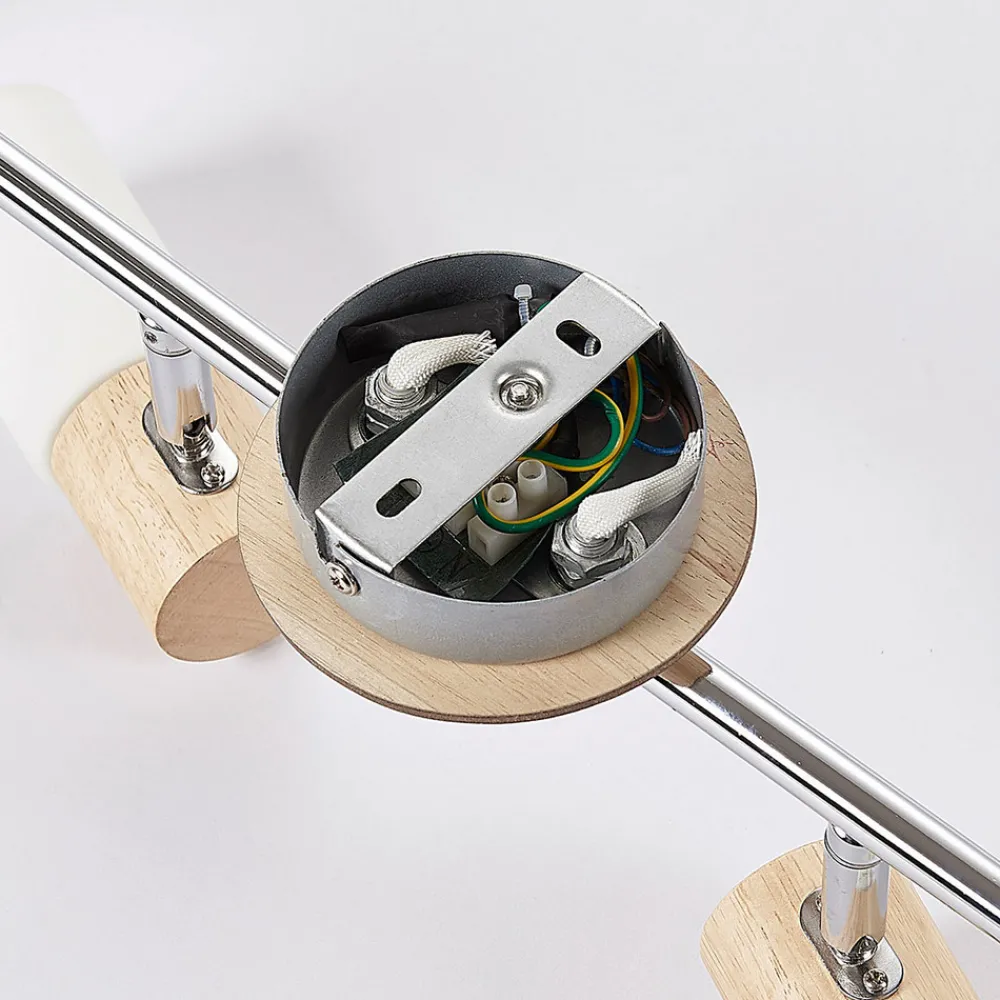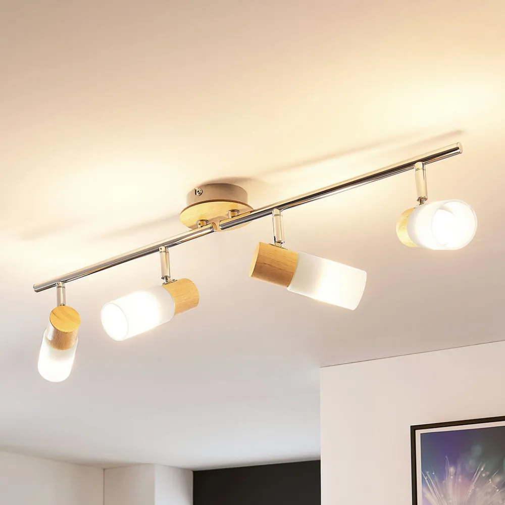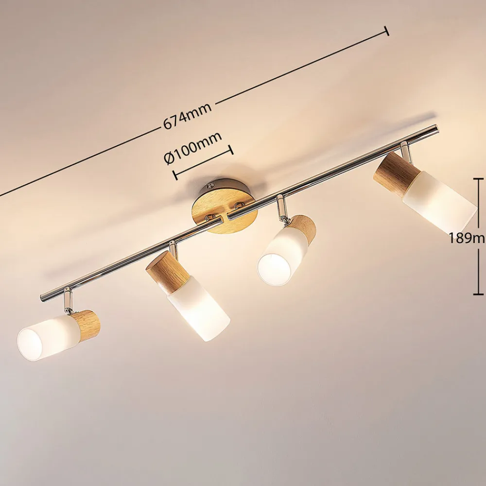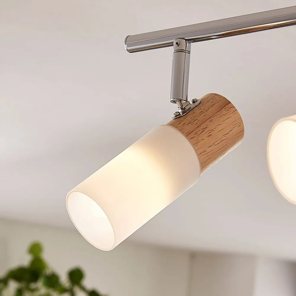 Christoph passer godt inn i stue eller soverom. Taklampen skaper et koselig lys der fordi lampeskjermene er laget av hvitt glass, og sprer en naturlig tone som er forårsaket av trekomponentene. Hver enkelt lampeskjerm kan roteres og svinges uavhengig av hverandre, slik at lyset kan justeres som du ønsker.