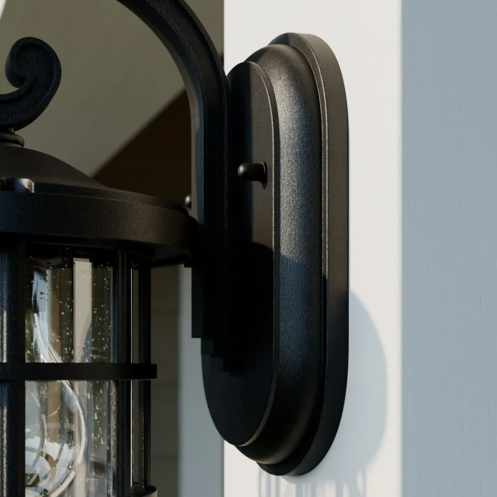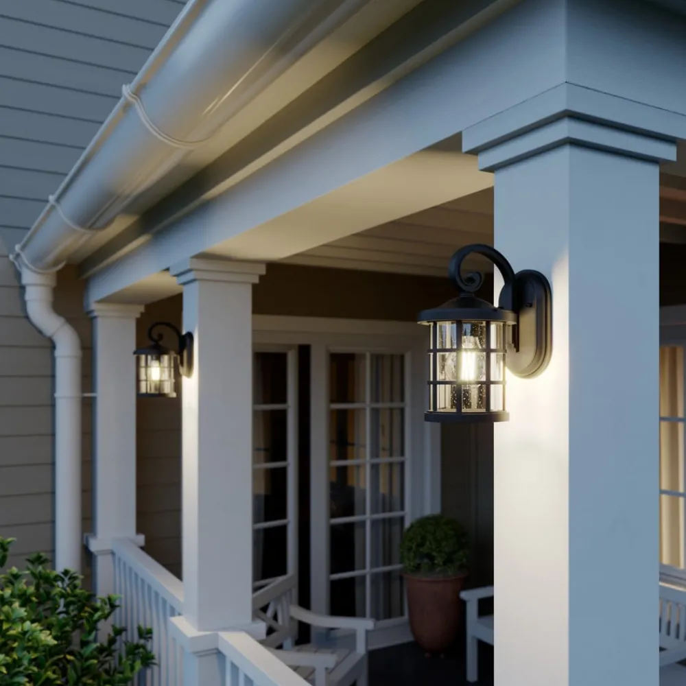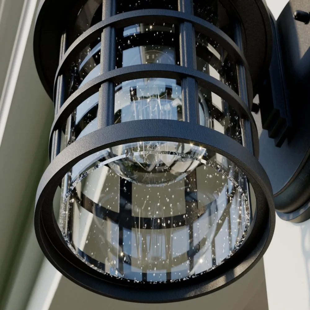 Robust utendørs vegglampe Ankea i svart Den antikt utseende utendørs vegglampen Ankea er formet som en lykt som henger nedover. Den er ideell for utendørsbelysning ved husets inngangsparti og andre områder i nærheten av huset der det er behov for pålitelig lysstyrke og trygg belysning i mørket. Lampeskjermen i glass inneholder lukkede bobler som ikke bare er pene å se på, men som også gir et vakkert skimmer når lyset er slått på. Det er også dekorative stivere som omgir lampeskjermen og skaper et interessant spill av lys og skygge i mørket.
