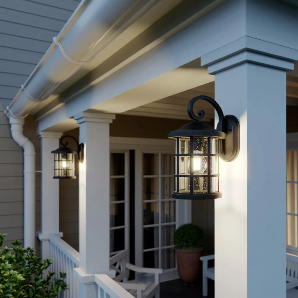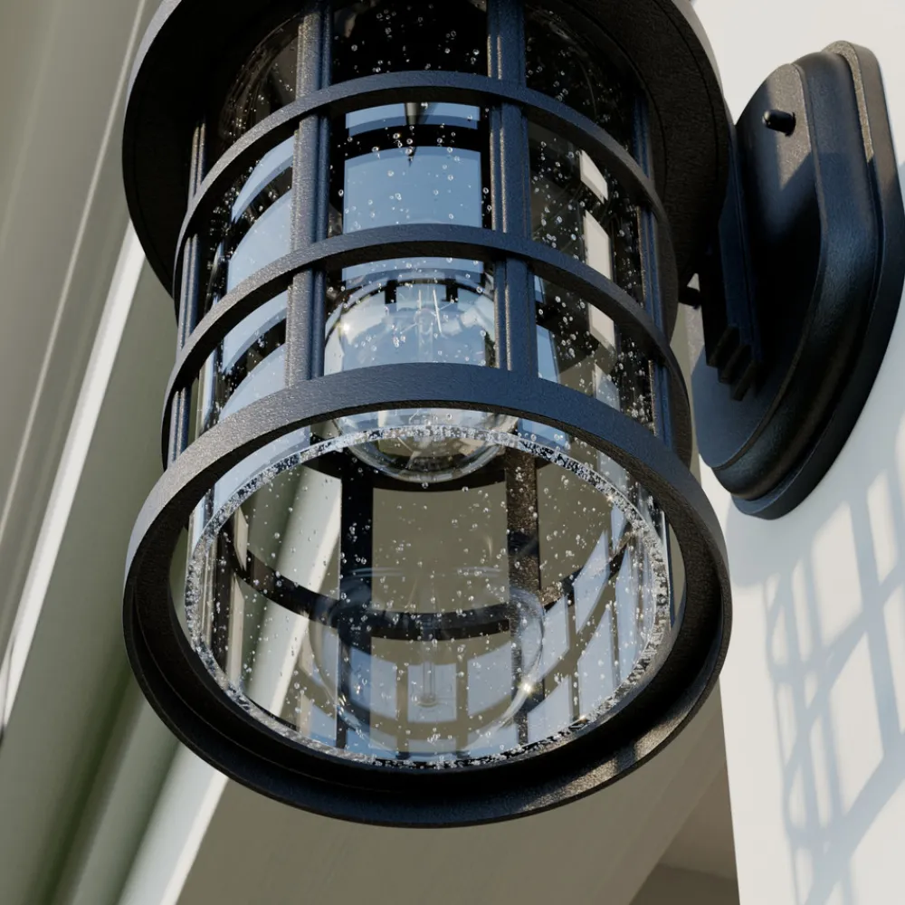 Svart Ankea utendørs vegglampe i lykteform Den antikt utseende Ankea utendørs vegglampen er laget av plast og har en lykteform som henger nedover og består av en glassskjerm og dekorative stivere. Selve glasset er ispedd små bobler, noe som skaper et spesielt koselig lys. Stagene på utsiden skaper også interessante lys- og skyggespill. Ankea utendørs vegglampe gir derfor ikke bare praktisk lys, for eksempel i inngangspartier, men også en hyggelig og dekorativ lyseffekt.