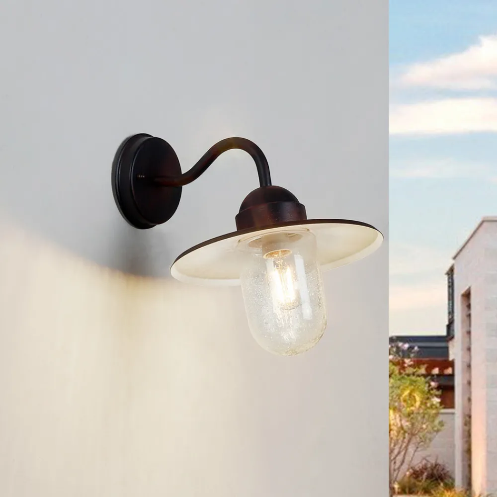 Filip utendørs vegglampe med rustbrun ramme og dekorative, små bobler i glasset Utendørs vegglamper bør alltid matche resten av omgivelsene for å skape et stilrent og harmonisk uttrykk. I så måte passer Filip spesielt godt til historiske bygninger, da det er lett å se at den utendørs vegglampen har noen år eller tiår på baken. Da kan man lure på hvorfor. Det er helt klart den nostalgiske formen med en romantisk karakter som skaper dette inntrykket hos betrakteren, og den rustbrune overflaten understreker de nostalgiske trekkene ved utendørs vegglampen på en helt spesiell måte.