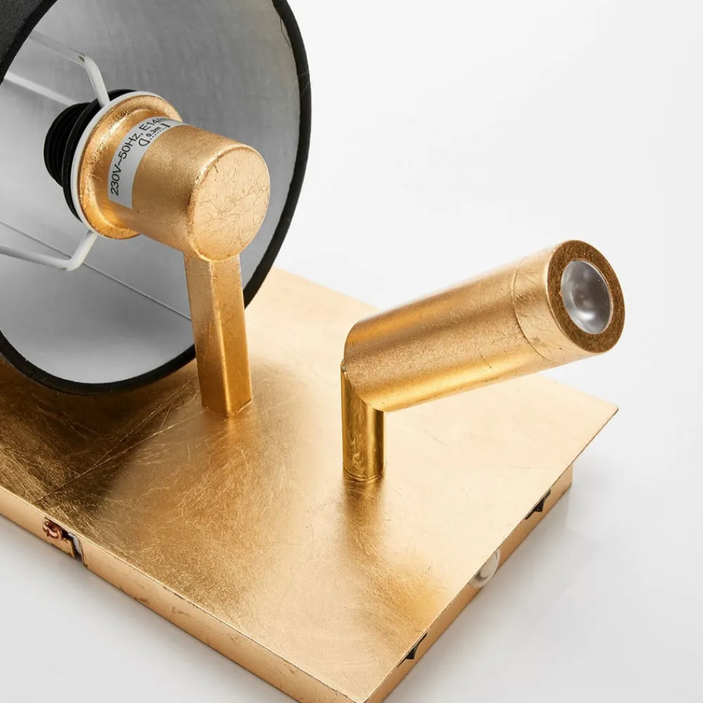 Vegglampe Aiden i svart og gull med vakkert utseende og høy funksjonalitet, inkl. leselampe og 2 brytere Aiden fortryller med sin trendy fargekombinasjon av svart og gull. Stoffskjermen, som har en stor tilstedeværelse, har en svart overflate og skaper derfor et veldig koselig, dempet lys. Samtidig gir LED-leselampen, som i likhet med rammen har en tiltalende gullfarge med matt overflate, et målrettet lys. Den kompakte lyskilden kan dreies og svinges for optimal justering. De to bryterne for separat betjening er plassert nederst på veggfesten og er derfor raske og enkle å nå. Disse funksjonene gjør Aiden vegglampe til en utmerket lyskilde for soverommet. Alternativt kan armaturen også monteres innen rekkevidde av en sofa, der du også kan nyte godt av fordelene med de ulike lyskildene. Leselampe: – varmhvit (3 000 K) – 310 lumen