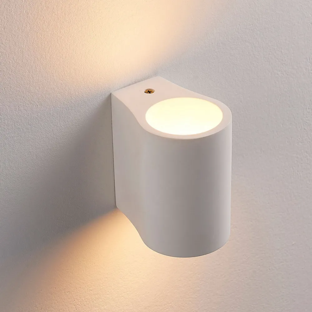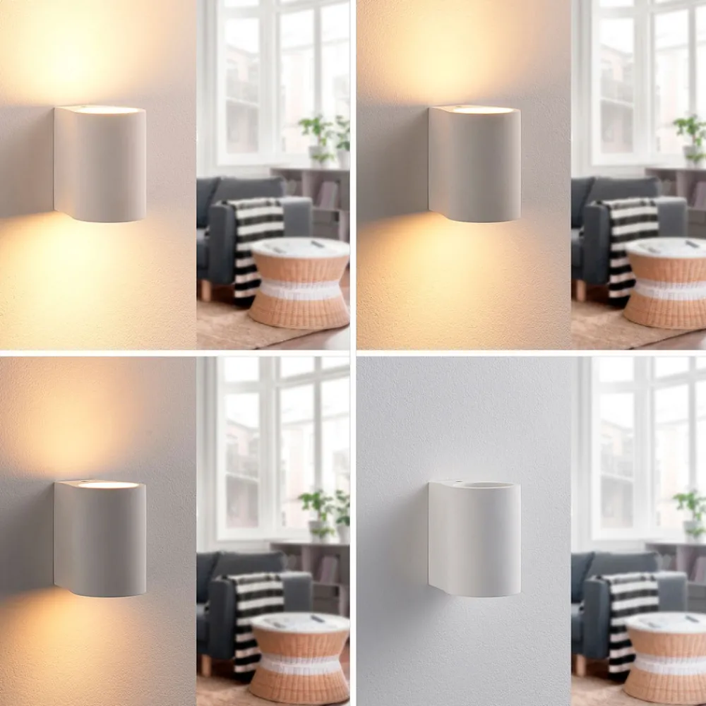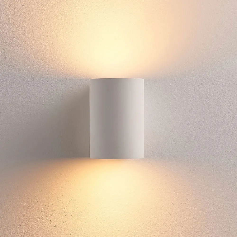 Halvsirkelformet Jannes vegglampe med lys rettet oppover og nedover Lampekroppen på denne vegglampen er laget av gips, et materiale som har hatt stor popularitet i belysningssektoren i flere år. Den imponerer ikke bare med sitt harmoniske utseende i hvitt, men også med muligheten til å male eller farge overflaten etter eget ønske.