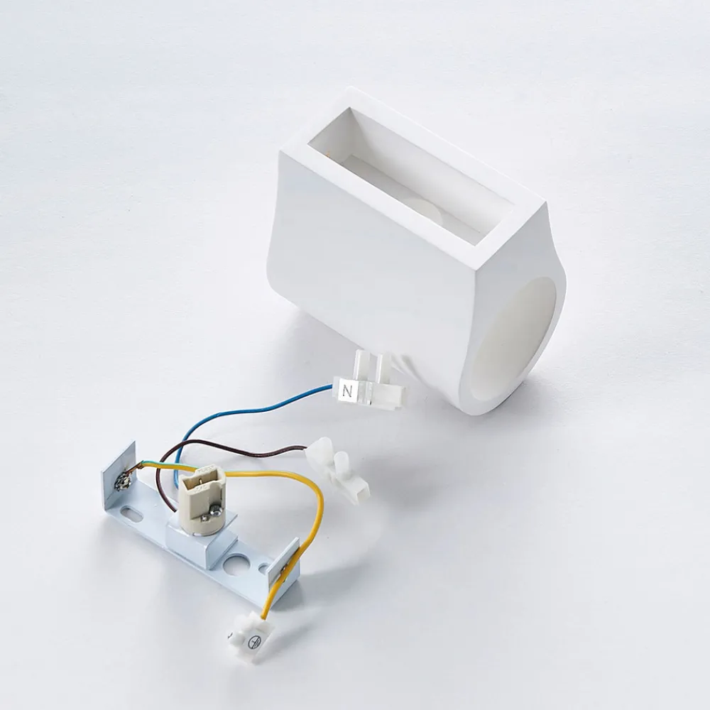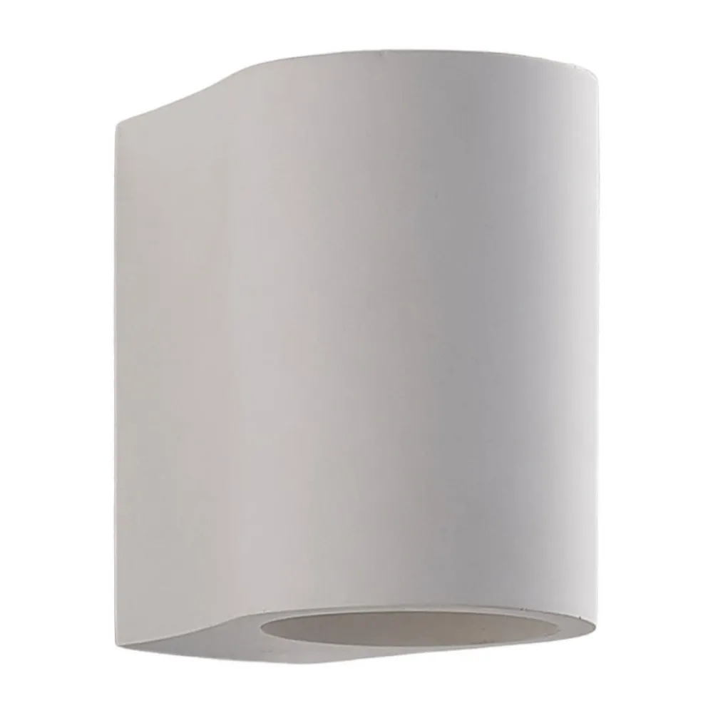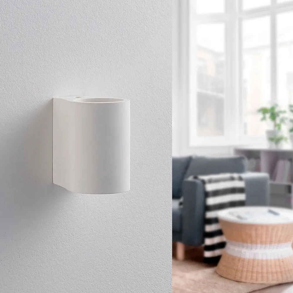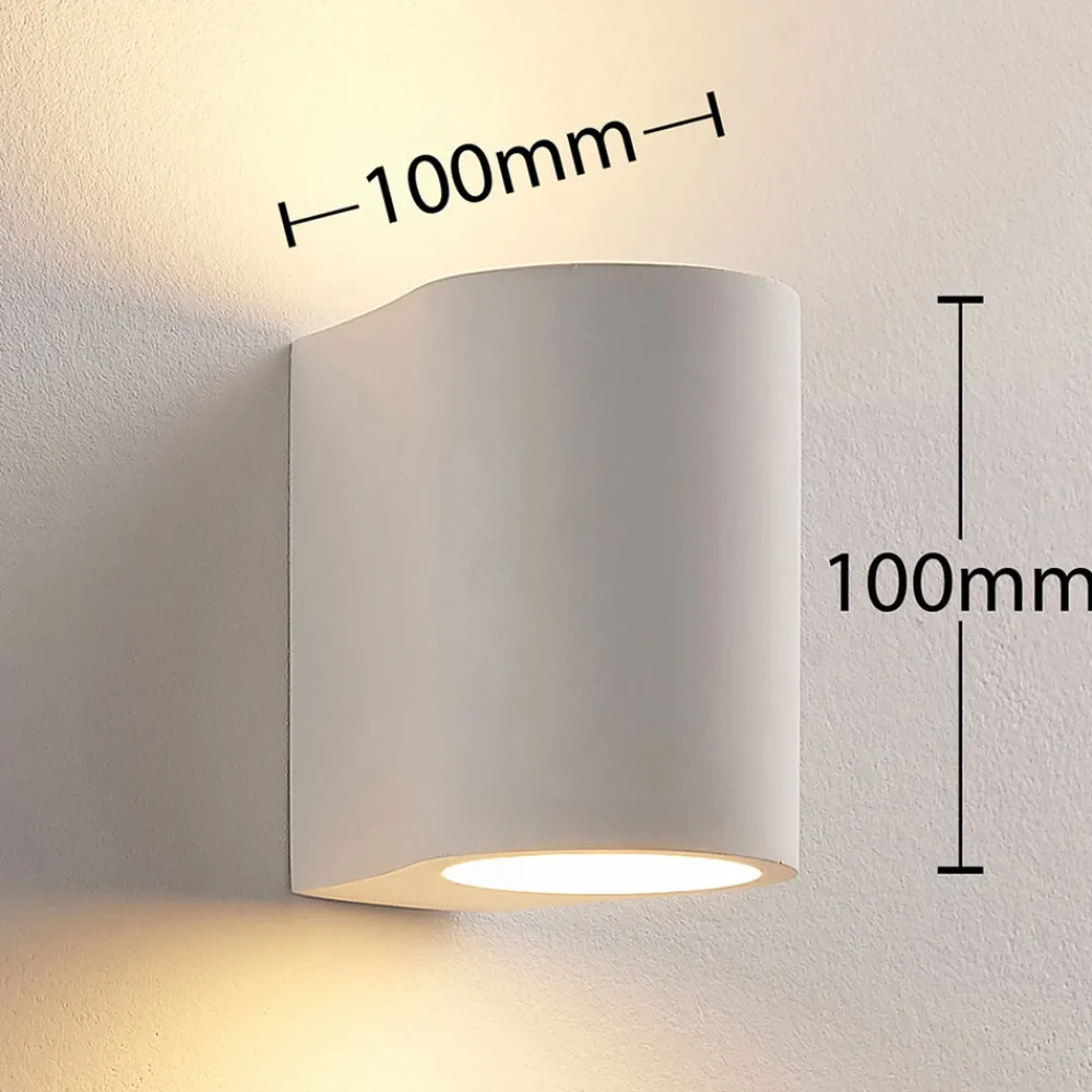 Halvsirkelformet Jannes vegglampe med lys rettet oppover og nedover Lampekroppen på denne vegglampen er laget av gips, et materiale som har hatt stor popularitet i belysningssektoren i flere år. Den imponerer ikke bare med sitt harmoniske utseende i hvitt, men også med muligheten til å male eller farge overflaten etter eget ønske.