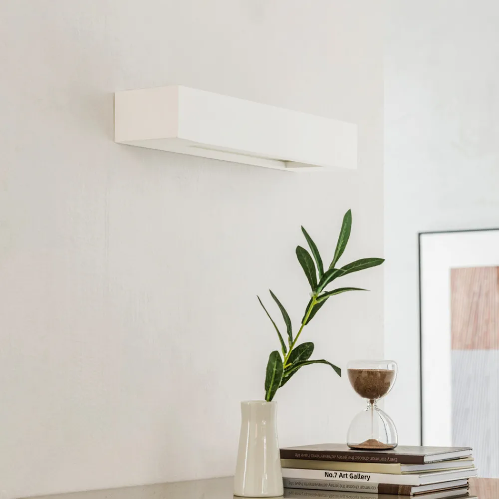 Matteo kantet vegglampe med hvit gipsoverflate, kan males Matteo ser ut som en hvit murstein, og først ved andre øyekast skjønner man at den skjuler en dekorativ vegglampe som gir indirekte lys. Nederst er det en satengsatt glassdiffusor som sørger for en jevnere fordeling av lyset, mens frontdekselet er laget av ugjennomsiktig gips. Vegglampen i gips kan utstyres med lyskilder med E14-sokkel og er ideell til bruk i korridorer eller trappeoppganger, dvs. områder i hjemmet der man ofte ferdes, men der målrettet belysning ikke er det viktigste kriteriet. Takket være armaturen med 2 lyskilder oppnås en behagelig grunnbelysning selv når bare vegglampen er slått på. Det som kjennetegner gips som overflate, er at det er mulig å endre fargen i etterkant eller å male den med individuelle motiver eller illustrasjoner – for alle som ikke vil gå glipp av et individuelt preg, selv med belysning! Til dette formålet følger det med sandpapir og hansker med lampen for å sikre optimal overflatebehandling før grunning.