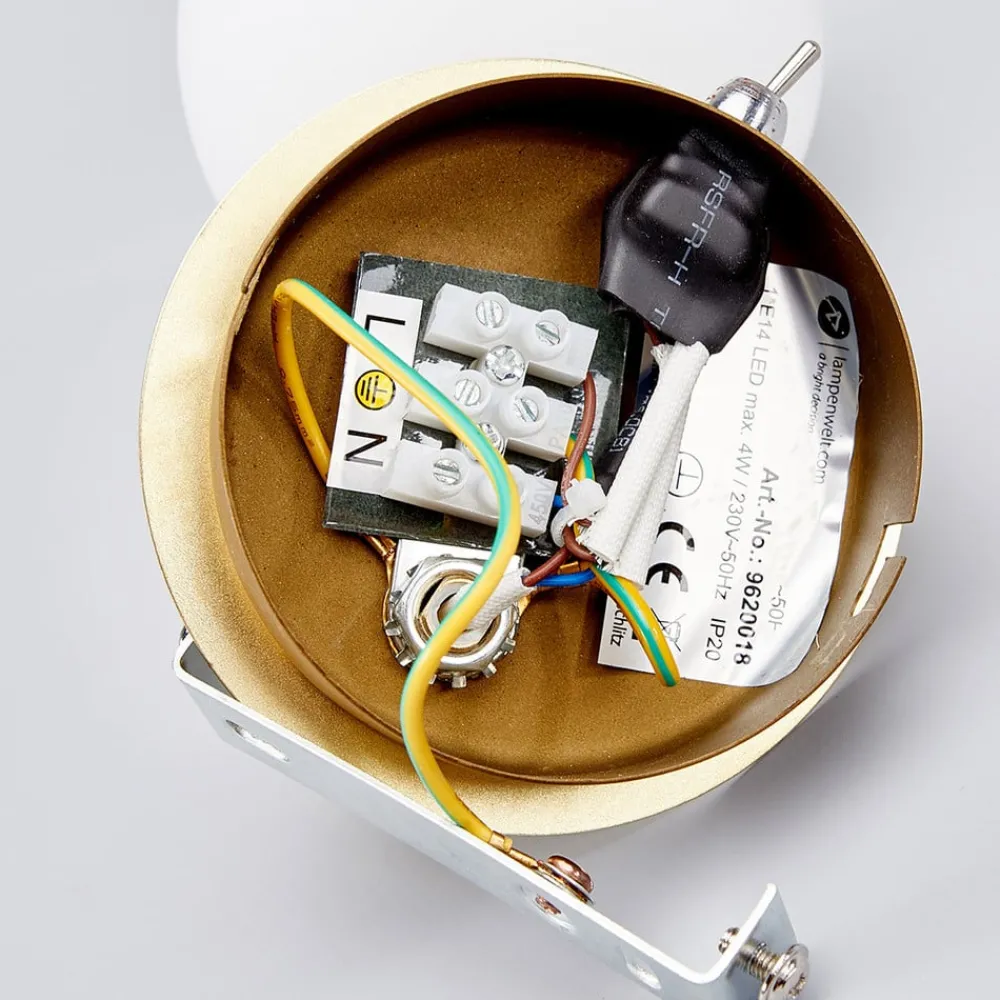 Messingfarget Elaina vegglampe med fatning E14 Elaina vegglampe er utstyrt med en praktisk bryter på undersiden av veggfesten, slik at den kan betjenes raskt og enkelt. Dette gjør den til en populær lyskilde for montering over en seng eller sofa. Den kuleformede skjermen er laget av opalt glass, har kompakte dimensjoner og kompletteres av en klassisk utseende ramme med messingfinish.