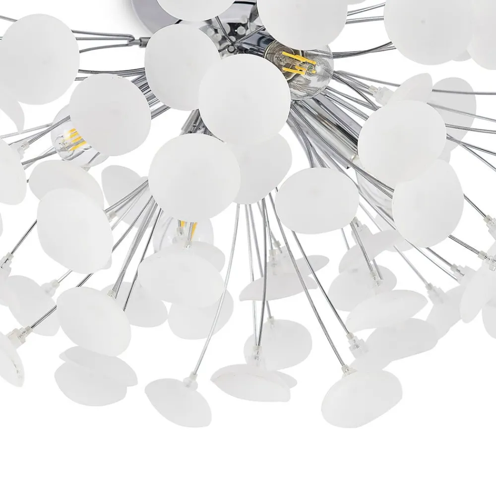 Yurina taklampe imponerer med sin uformelle design laget av jern og plast. Den henger på et diskret, rundt takfeste og smelter sammen i mange smale stag, som hver ender i frostfargede elementer. I midten av pakken er det fire stikkontakter, som hver kan utstyres med en E14-lampe. Lyset som genereres av dette, beveger seg gjennom elementer og genererer et interessant lysspill. Den enkle fargekombinasjonen av frosthvit og klassisk krom skaper en elegant karakter og kan enkelt integreres i resten av møblene. Den moderne designen setter harmoniske aksenter i taket i leiligheten og gir hvert rom noe spesielt. Fremfor alt finner den det perfekte stedet i en stue, men det kutter også en fin figur i andre rom.