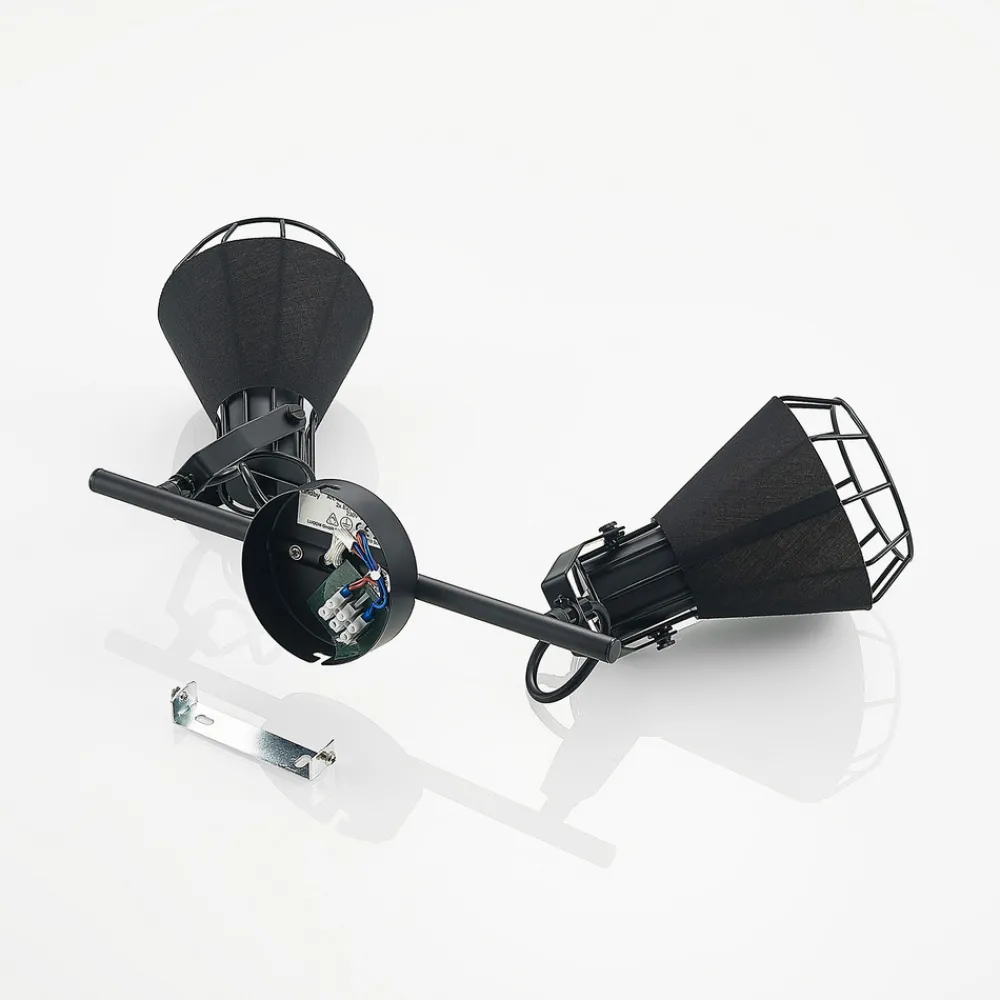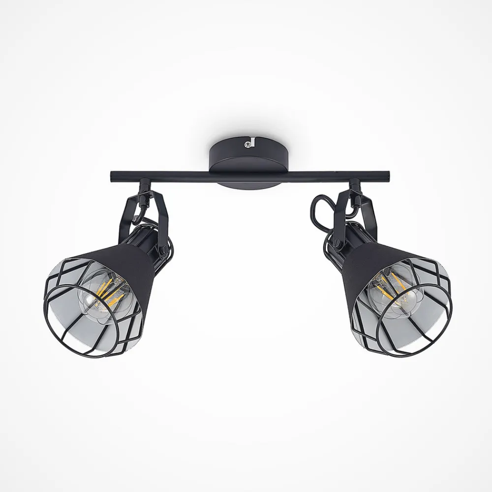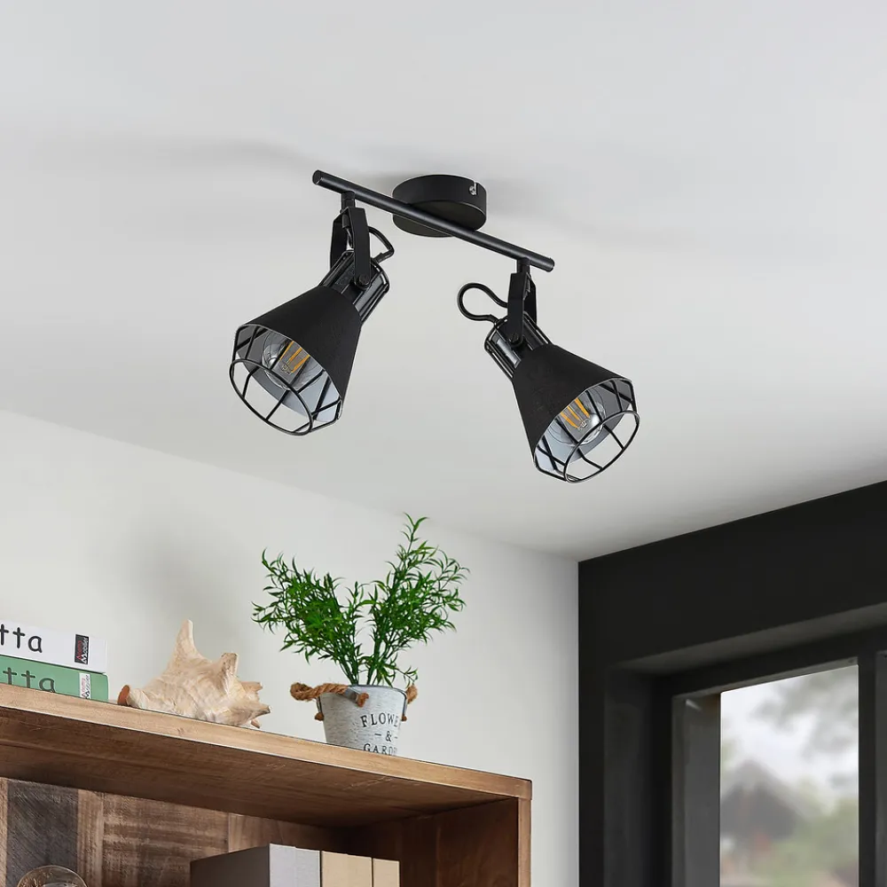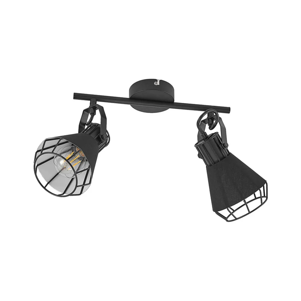 Yusei spotlight imponerer med sitt slanke og robuste utseende. En tynn stiver med to takfeste er festet horisontalt til et kompakt takbrakett . Disse kan utstyres med E27-lamper og genererer riktig lys for en stue eller en gang. Yusei- spotlight er laget av jern og nyanser er dekket med stoff, og den er helt svart, noe som gir den en rolig karakter. Spotlighten setter slående aksenter på taket i leiligheten og avrunder resten av møblene.