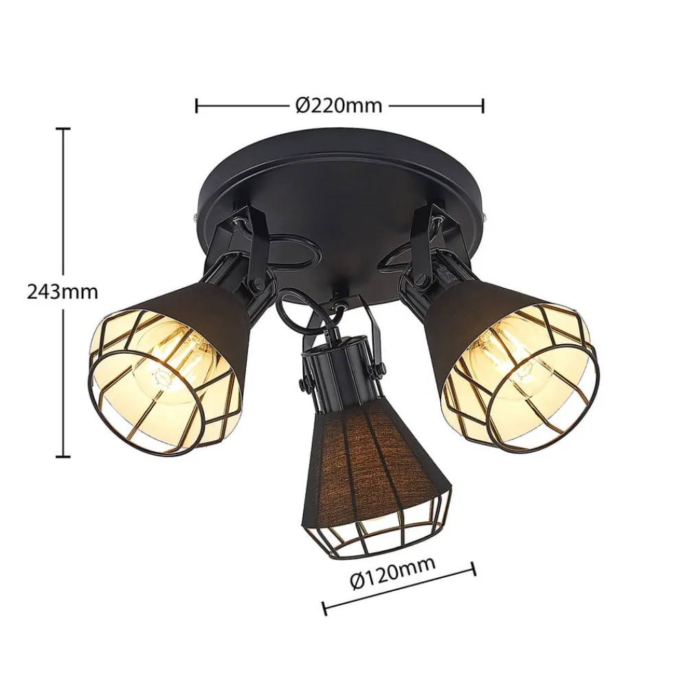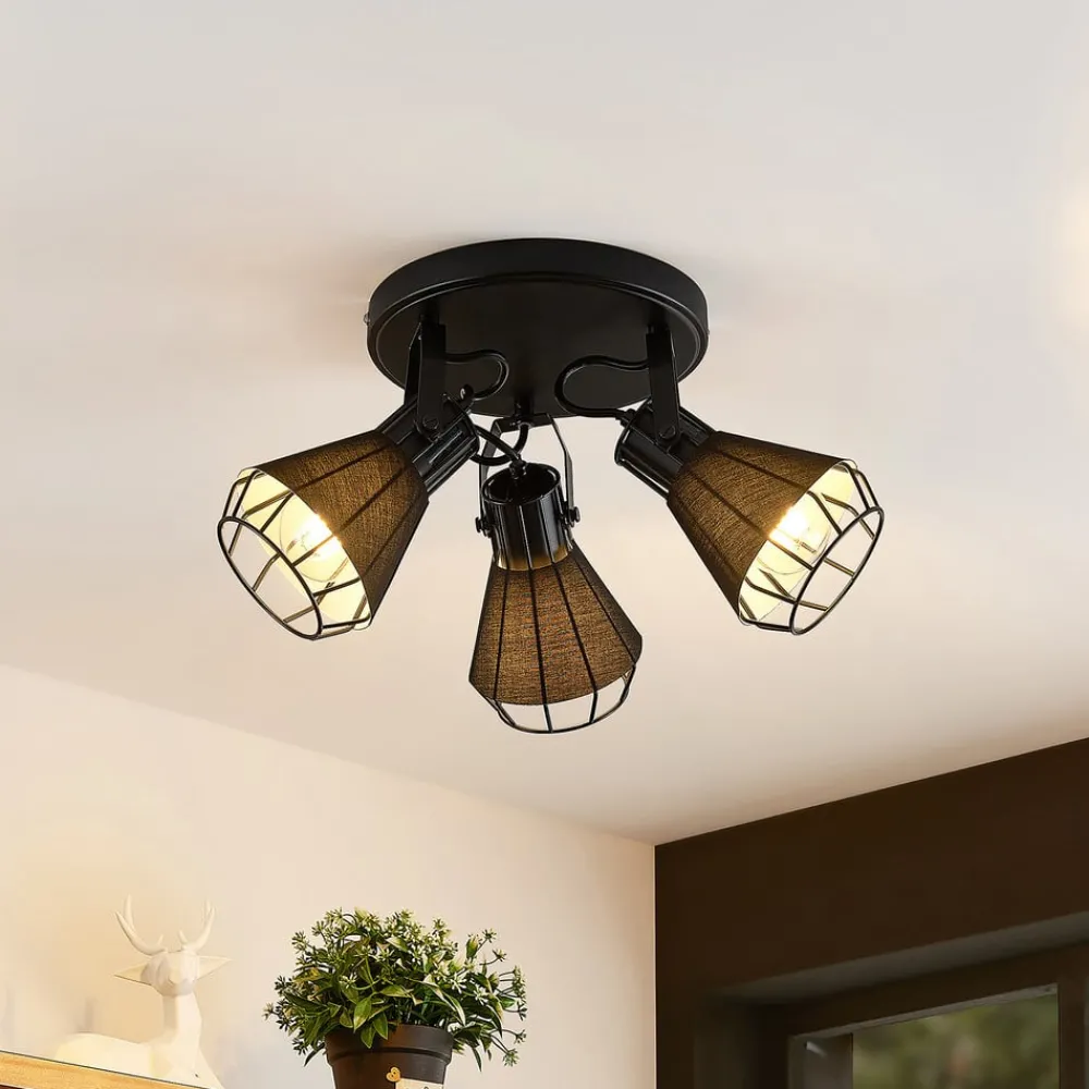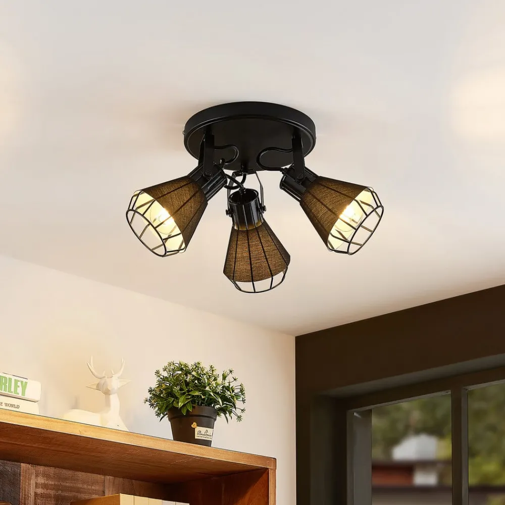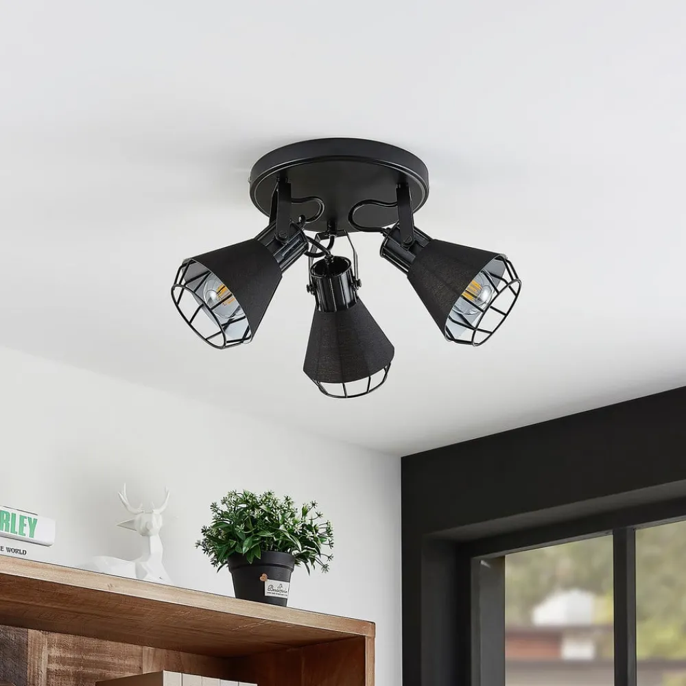 Det runde takspotlight Yusei er perfekt for installasjon i stue eller spisestue. Tre takfeste er festet i en sirkel til et rundt takfeste og peker i forskjellige retninger. Lampekroppen er laget av jern og nyanser er også omgitt av stoff. Begge materialene er svarte, noe som gir søkelyset en robust karakter. Det setter slående aksenter i interiøret og avrunder møblestilen velvillig. For en passende belysning kan den utstyres med E27-pærer, også med glødepærer, som understreker lampens design med sitt spesielle utseende.