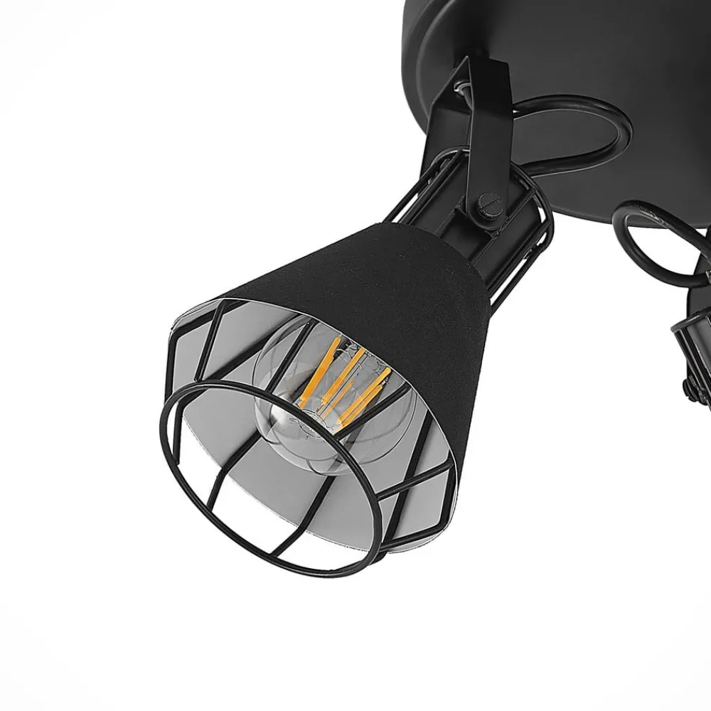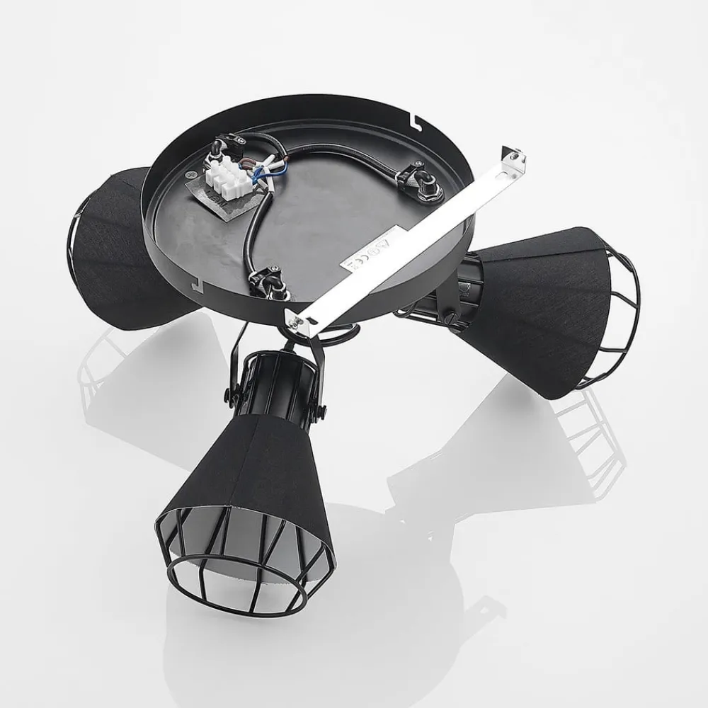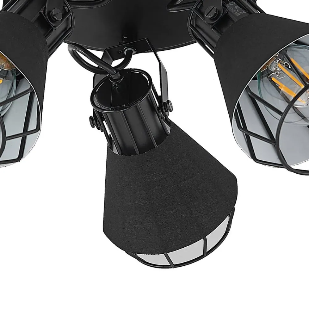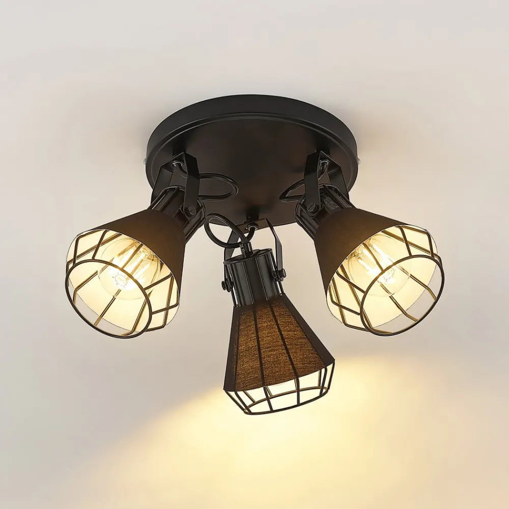 Det runde takspotlight Yusei er perfekt for installasjon i stue eller spisestue. Tre takfeste er festet i en sirkel til et rundt takfeste og peker i forskjellige retninger. Lampekroppen er laget av jern og nyanser er også omgitt av stoff. Begge materialene er svarte, noe som gir søkelyset en robust karakter. Det setter slående aksenter i interiøret og avrunder møblestilen velvillig. For en passende belysning kan den utstyres med E27-pærer, også med glødepærer, som understreker lampens design med sitt spesielle utseende.