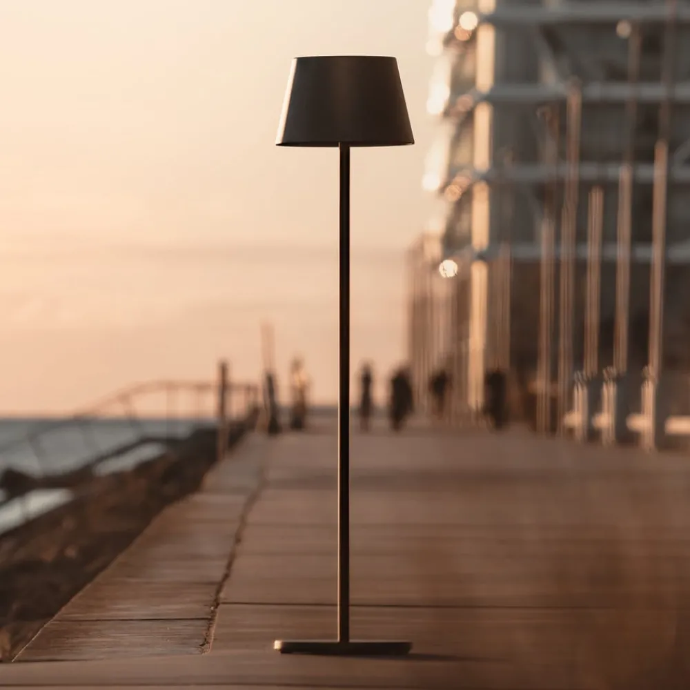 Dimbar oppladbar LED-gulvlampe Modi for utendørs bruk – med CCT og RGB Den oppladbare gulvlampen Modi er en allrounder for stemningsfull belysning i uteområder. Aluminiumskroppen med polyesterpulverbelegg er egnet for alle værforhold og tåler dem i lang tid. Også funksjonelt er gulvlampen vanskelig å slå: Den har tre hvite lysfarger (2700 K, 3000 K, 4000 K) og syv RGB-farger (rød, oransje, gul, grønn, blå, indigo, fiolett). Den kan også dimmes trinnløst fra 5-100 %. Lyset sendes både oppover og nedover – Ladetid: 7,5 timer – Lysvarighet: 9 timer (ved 100 % lysstyrke)