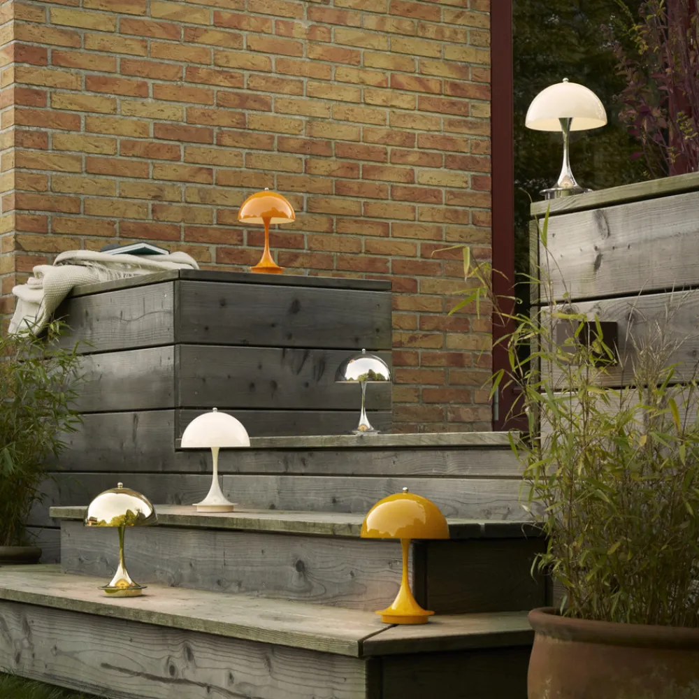 Panthella Portable 160 LED-bordlampe med batteri, versjon 3 Den tredje versjonen av Panthella Portable 160 LED-bordlampe med batteri er laget av sprøytestøpt, resirkulert polymer. Den er utstyrt med en berøringsbryter på toppmutteren, som kan brukes til å slå den av og på og stille den inn på tre lysstyrkenivåer. Panthella-armaturens design er et av Verner Pantons viktigste design, og gjenspeiler den danske arkitektens store personlighet. Han ønsket å designe en organisk formet armatur som gir 100 % blendingsfritt lys, der stativ og skjerm fungerer som lysreflektorer. Panton utviklet Panthella-armaturen i 1971 i samarbeid med Louis Poulsen. Armaturens karakteristiske form og dens evne til å reflektere et mykt lys fra den trompetformede sokkelen har gitt den status som et designikon. Panthella 160 Portable er en nedskalert versjon av den opprinnelige designen, perfekt til å ta med seg fra rom til rom eller ut på balkongen eller i hagen. Den ser flott ut overalt og skaper en fantastisk atmosfære – inkl. Li-Ion-batteri 18650 1,5 V 3100 mAh – inkl. 150 cm USB-ladekabel 150 cm lang USB-ladekabel (adapter medfølger ikke) – hvit lysindikator i sokkelen når lampen lades – kan stilles inn på tre lysstyrkenivåer: 100 %, 33 %, 10 % lysstyrke – belysningstid ved 100 % lysstyrke: 8,5 timer, ved 33 % lysstyrke: 25,5 timer og ved 10 % lysstyrke: 79 timer – batteriets ladetid: 5 timer – batterilevetid: 500 ladesykluser