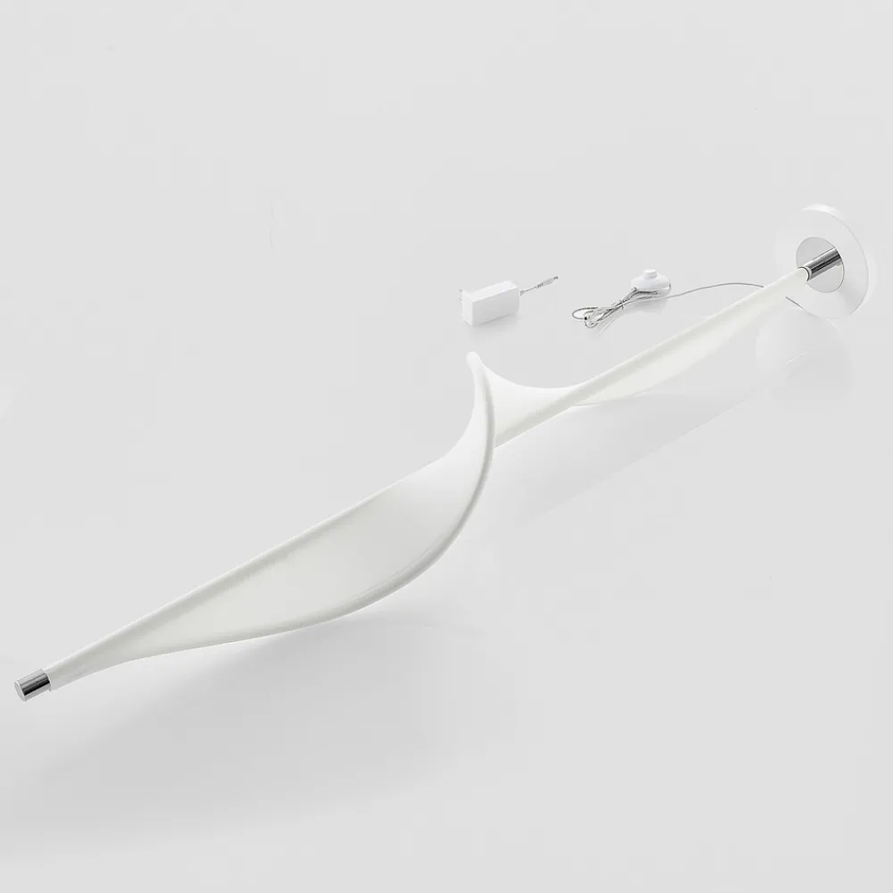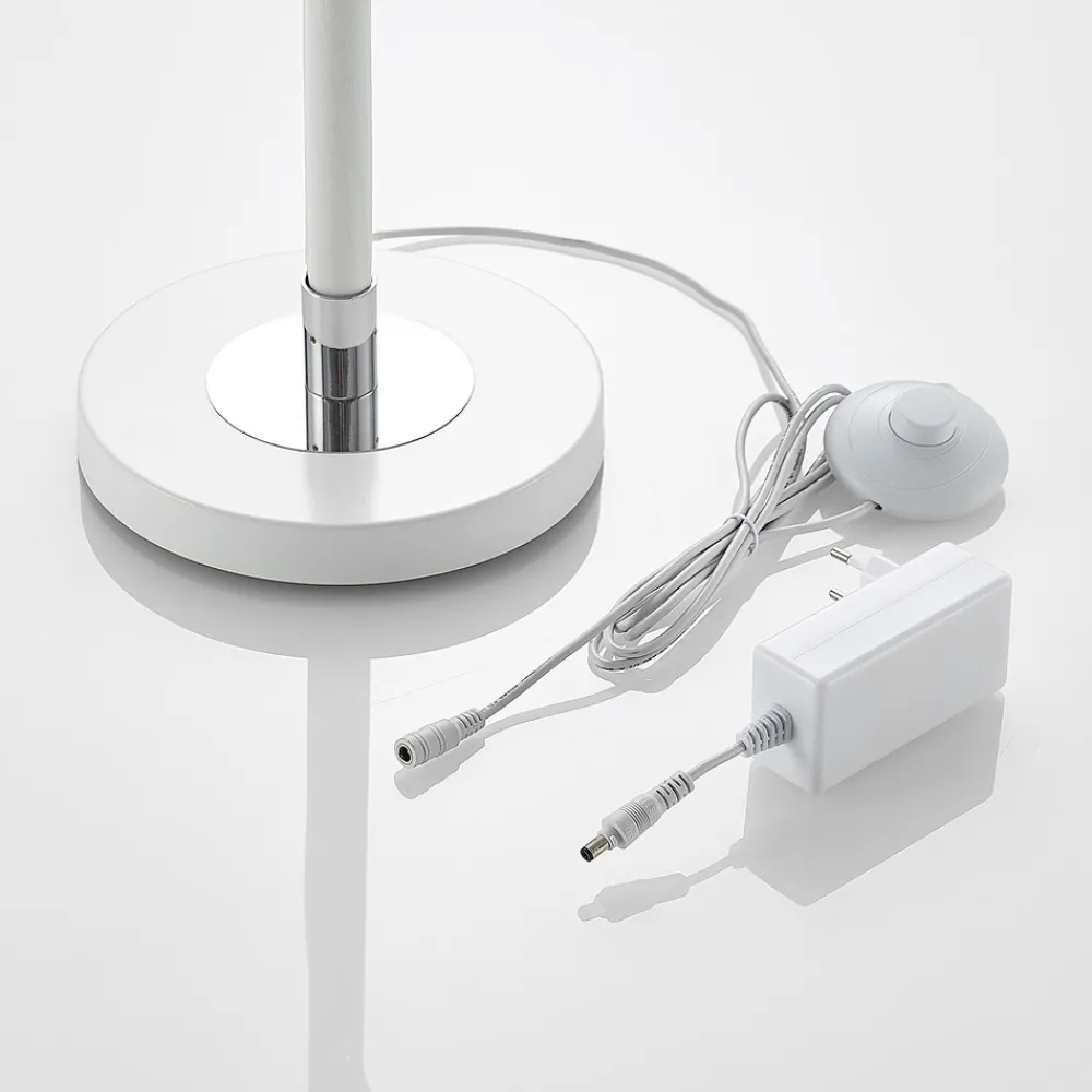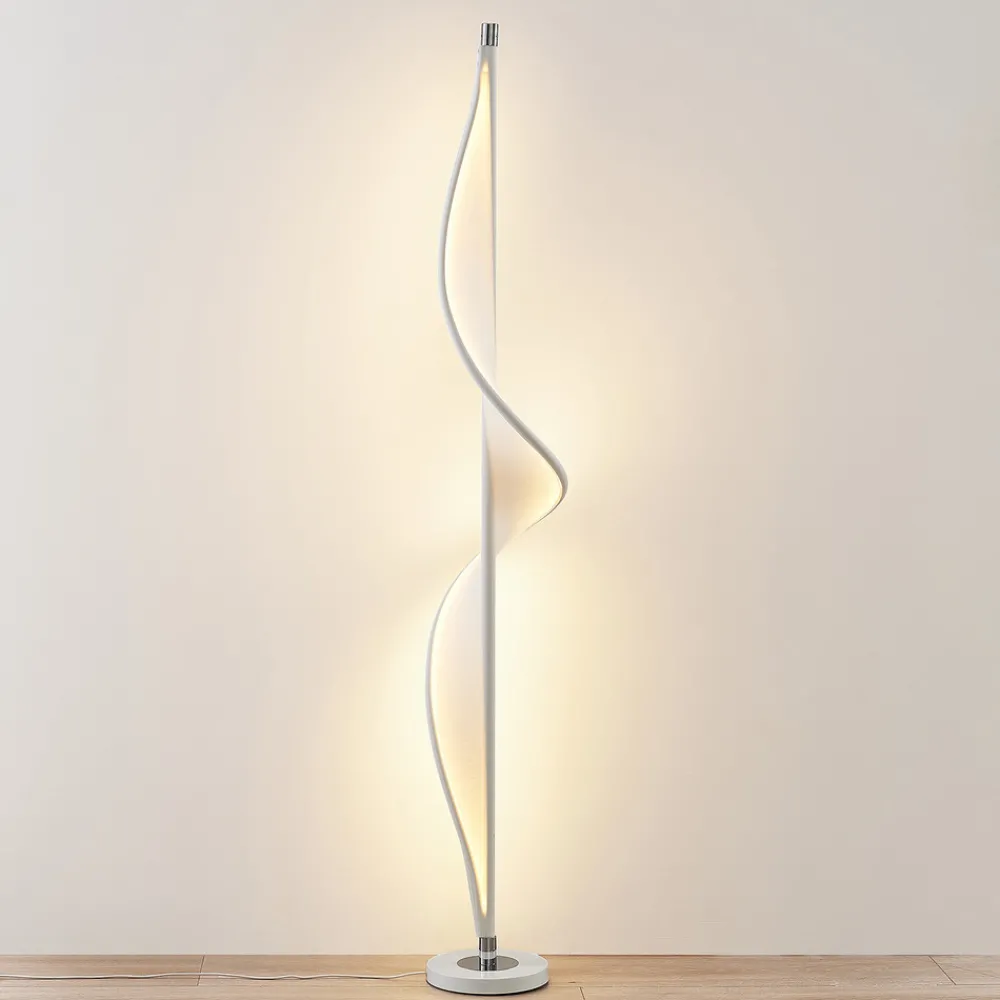 Edano LED-gulvlampe med hvit lampeskjerm i tekstil, dimbar i tre trinn LED-gulvlampen Edano har en svært uvanlig design. Den hvite tekstilskjermen slynger seg som et stykke stoff fra topp til bunn rundt den ruvende rammen, noe som gir inntrykk av at stoffet virvles opp av vinden. Det hvite stoffet belyses av varmhvite LED-lamper, som gjør hele strukturen enda mer effektfull når lyset er slått på. Men selv når den er slått av, er Edano LED-gulvlampe svært dekorativ takket være den unike formen og den effektfulle lampeskjermen, noe som gjør den til et designobjekt i stuen. Edano LED-gulvlampe i aluminium og hvitt stoff passer spesielt godt inn i moderne interiør takket være sin uvanlige design. Den betjenes enkelt med foten ved hjelp av bryteren som er integrert i kabelen. 3-trinns dimbar + av: Bryteren gjør at lyset kan slås på og av som vanlig. Takket være 3-trinns dimmeteknologi med integrert av-funksjon kan den også dimmes til tre ulike lysstyrkenivåer ved å trykke på bryteren flere ganger: 100 %, 50 % og 10 %.